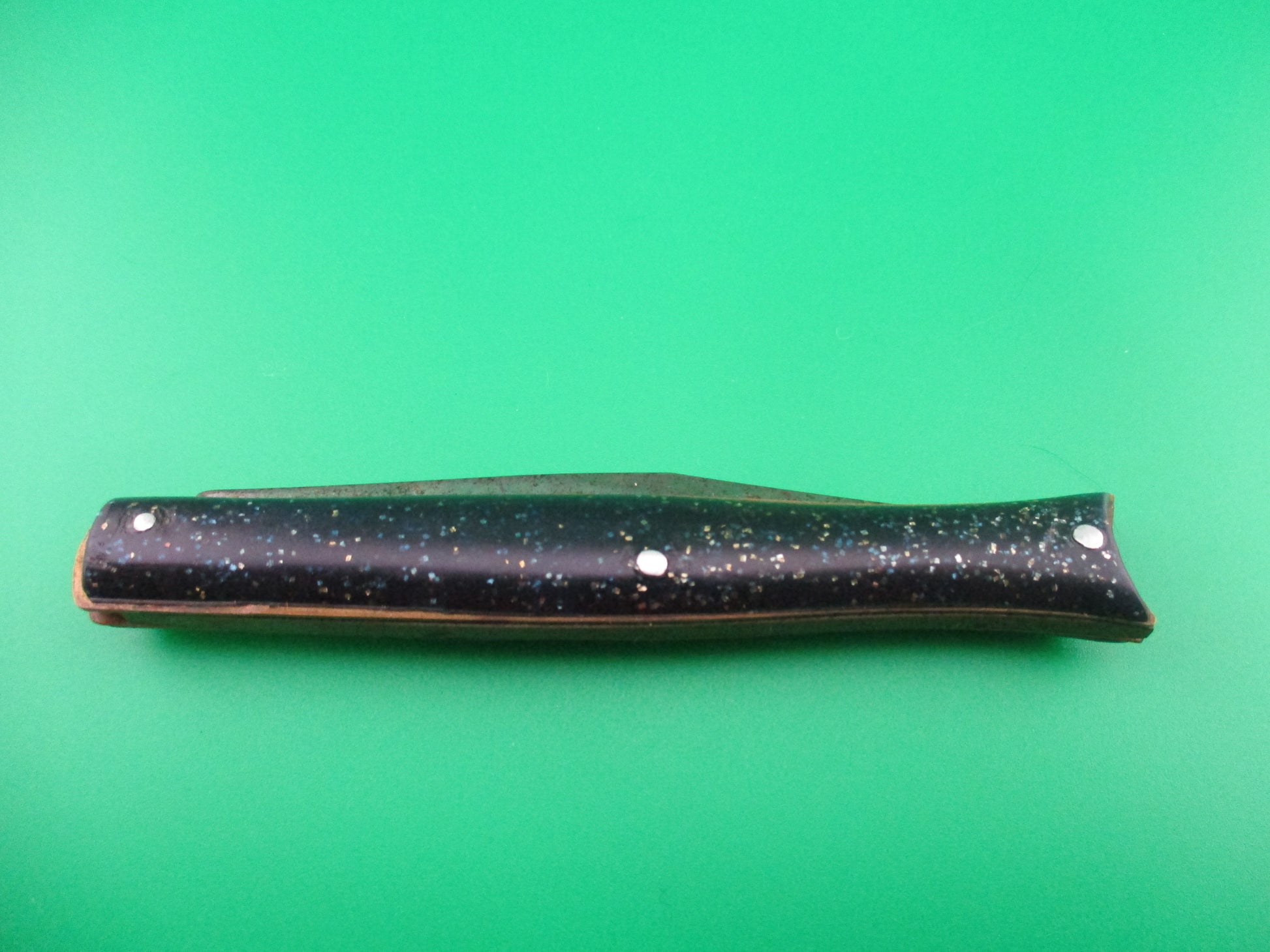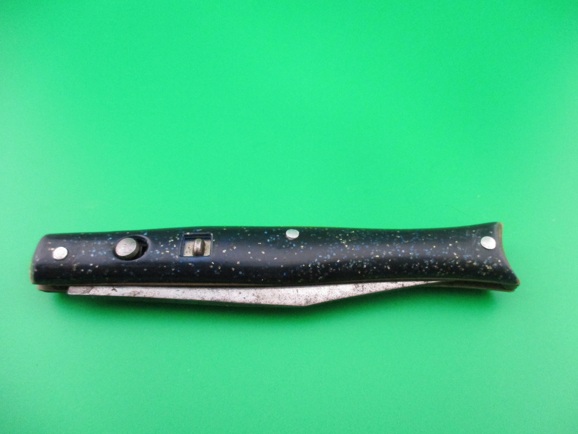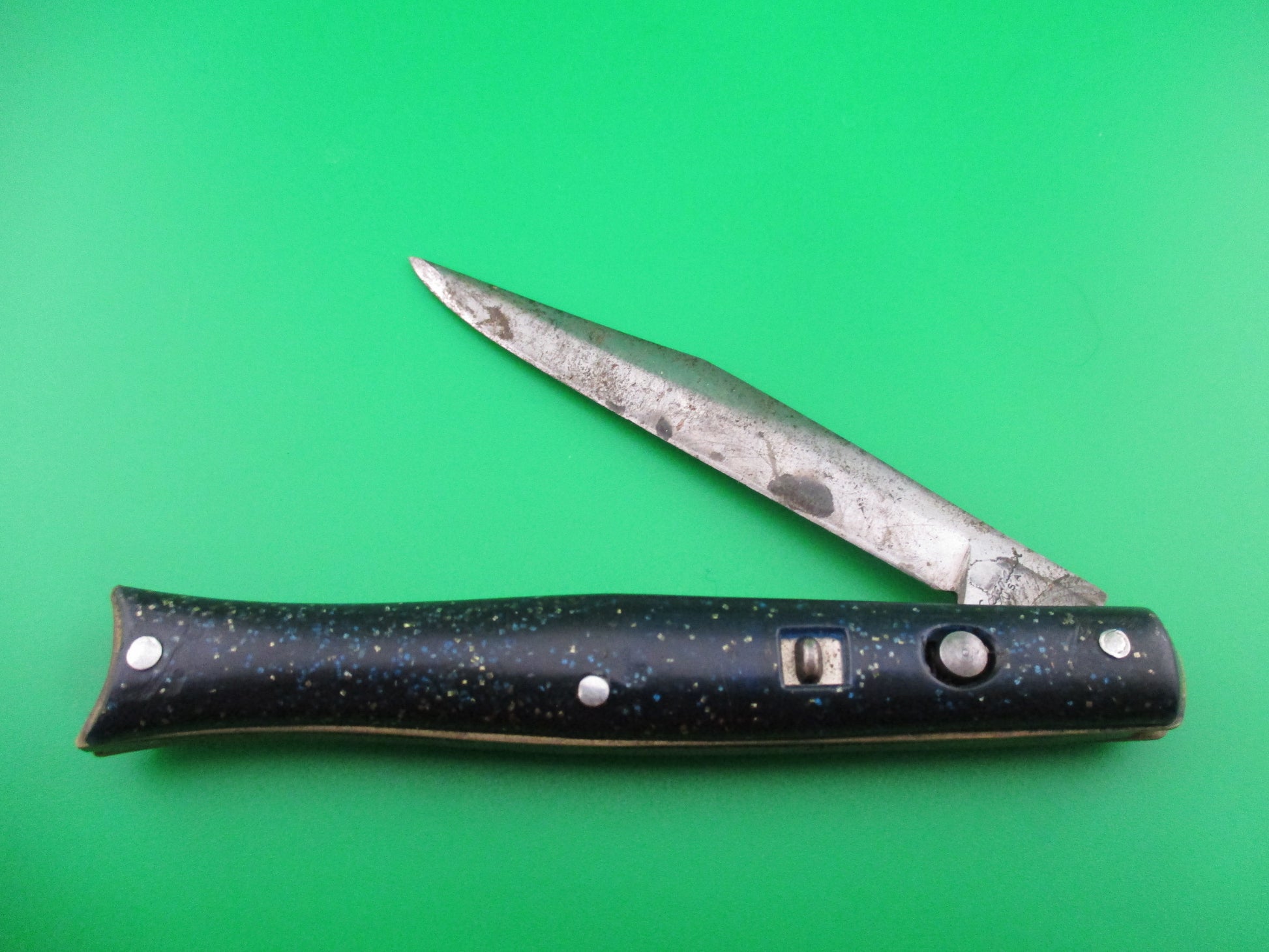Edgemaster fishtail with Blue Sparkle synthetic scales made by the Federal Knife Co of Providence, RI in the late 40s, or early 1950s. This knife was designated the model #301 and measures 4 inches closed and 7 1/8" open with brass liners. The blade is nearly full with some spotting, peppering and patina and is stamped Edgemaster USA. The Blue Sparkle scales are in great condition with minimal shrinkage. The knife functions good with blade tip seating deep, good snap and stays open with some movement each way, but doesn't actually lock. It seems to lock, but will close if you put pressure on it without pressing the button. The knife does rattle if shaken when open as most of these old 50s American switchblades do that have been used over the years. The safety does not work, but many didn't work properly when new. Overall a nice working example of a 50s vintage American made fishtail switchblade. 100% money back guarantee including return shipping if you're not happy with this knife.