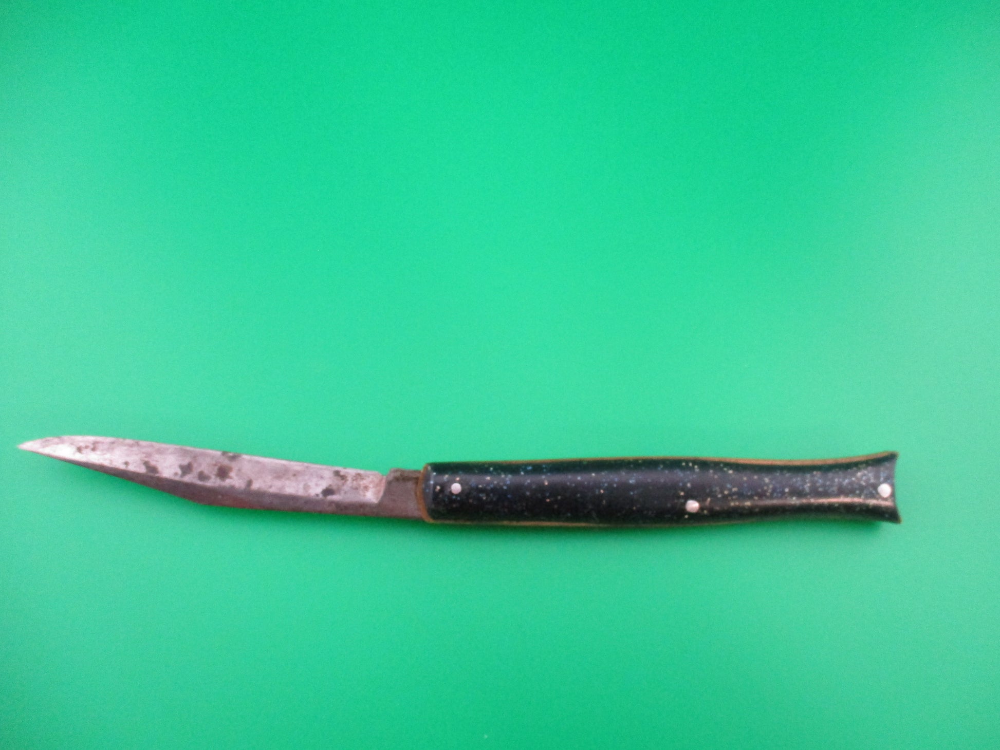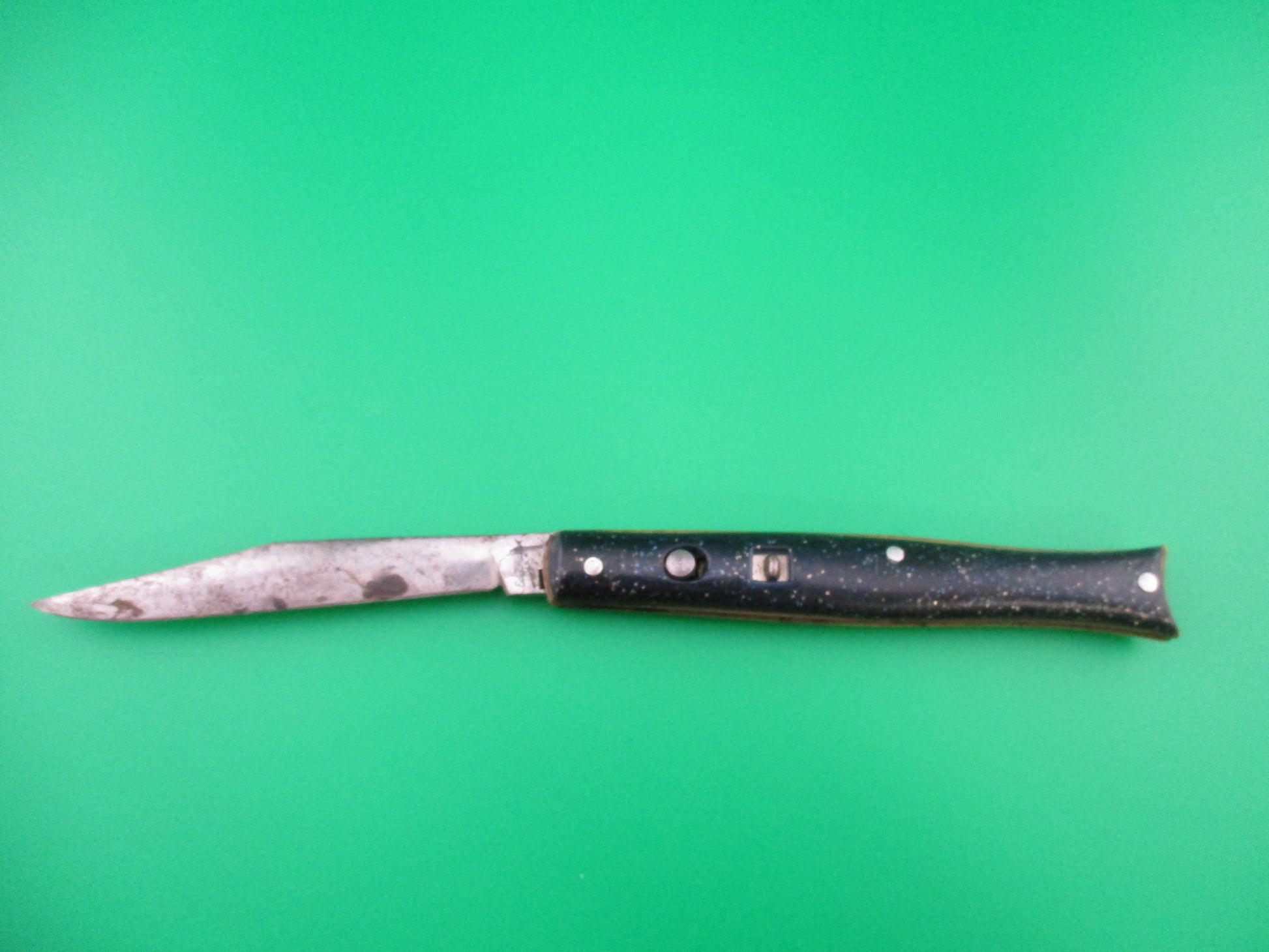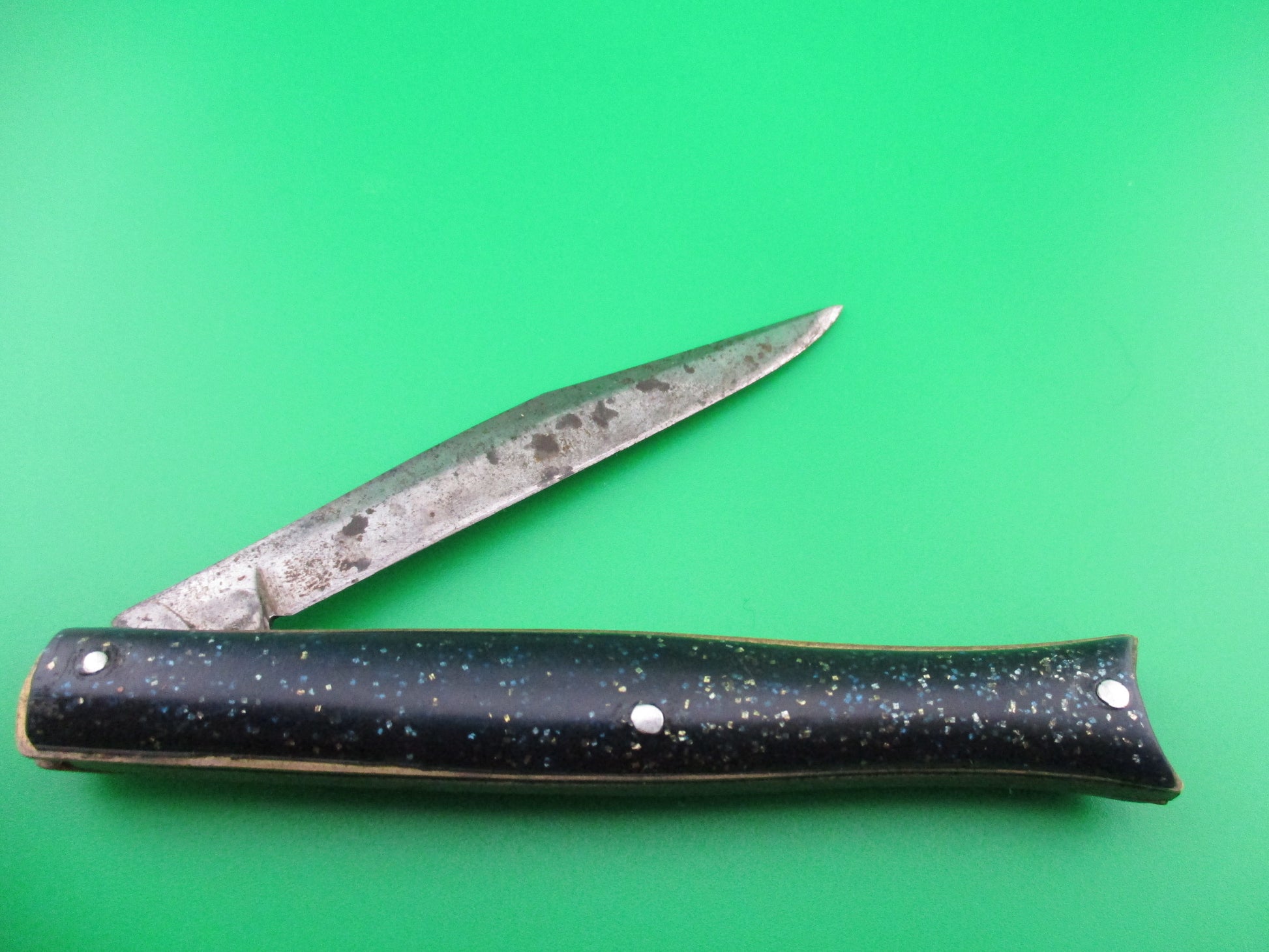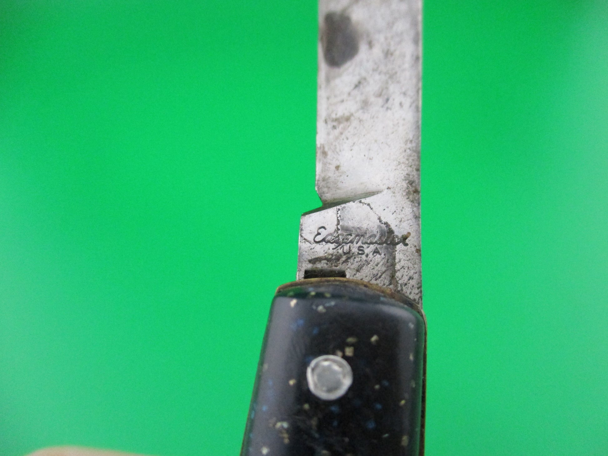Edgemaster fishtail with Blue Sparkle synthetic scales made by the Federal Knife Co of Providence, RI in the late 40s, or early 1950s. This knife was designated the model #301 and measures 4 inches closed and 7 1/8" open with brass liners. The blade is nearly full with some spotting, peppering and patina and is stamped Edgemaster USA. The Blue Sparkle scales are in great condition with minimal shrinkage. The knife functions good with blade tip seating deep, good snap and stays open with some movement each way, but doesn't actually lock. It seems to lock, but will close if you put pressure on it without pressing the button. The knife does rattle if shaken when open as most of these old 50s American switchblades do that have been used over the years. The safety does not work, but many didn't work properly when new. Overall a nice working example of a 50s vintage American made fishtail switchblade. 100% money back guarantee including return shipping if you're not happy with this knife.