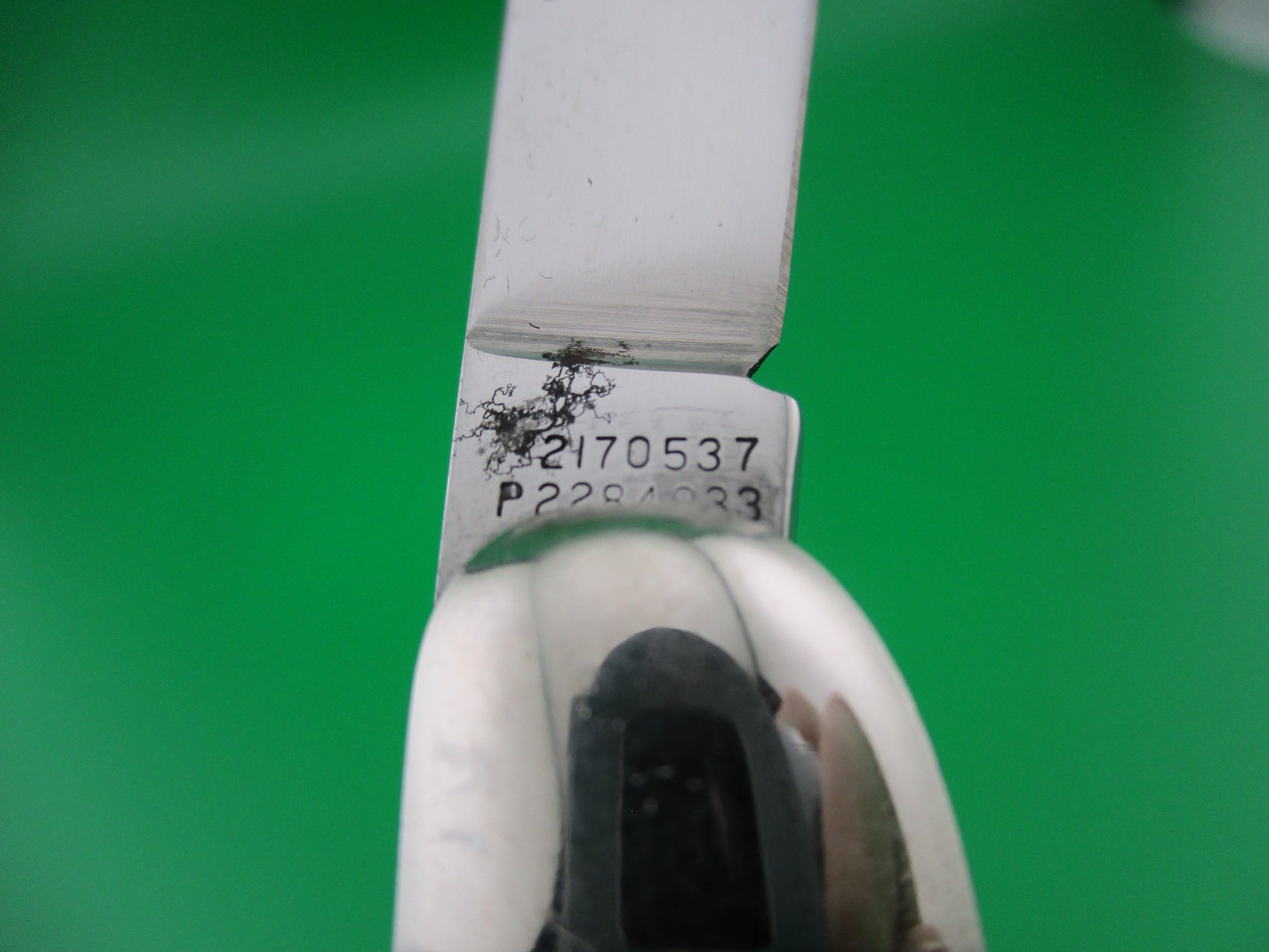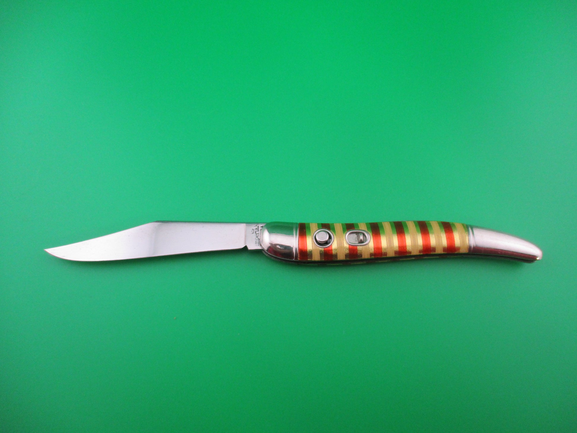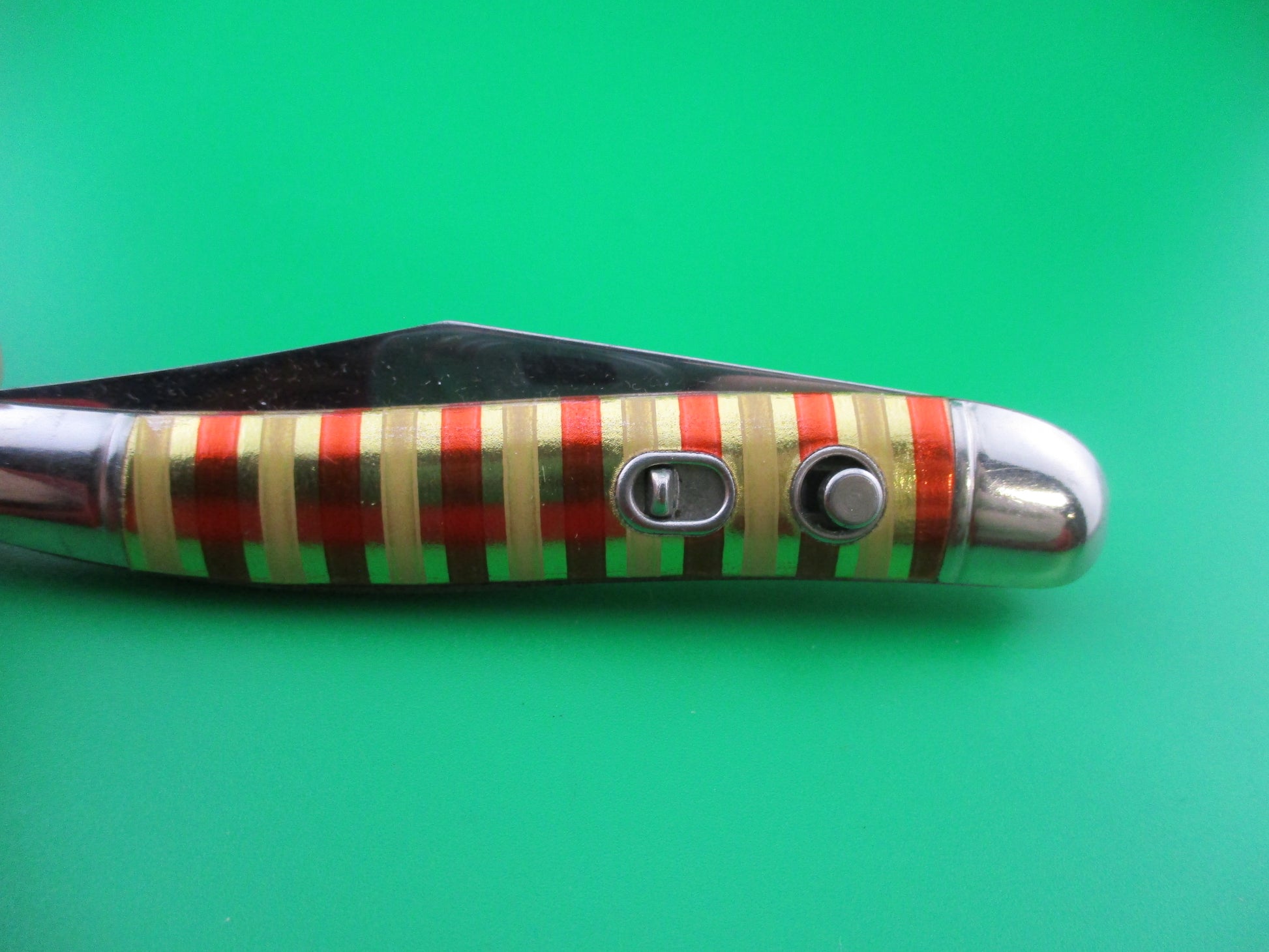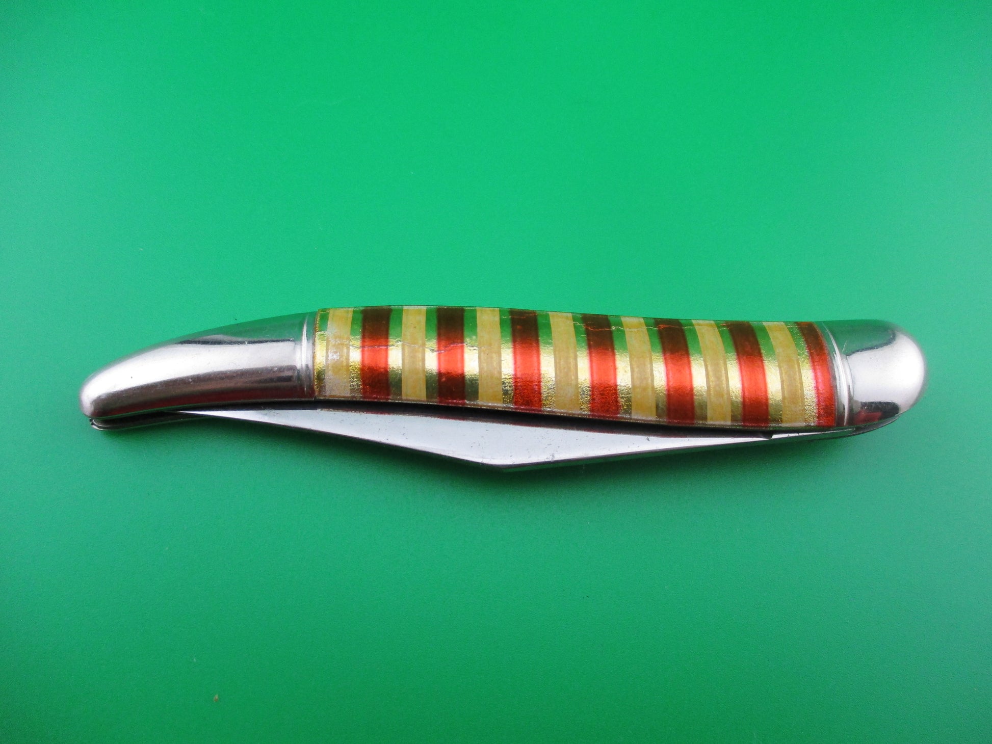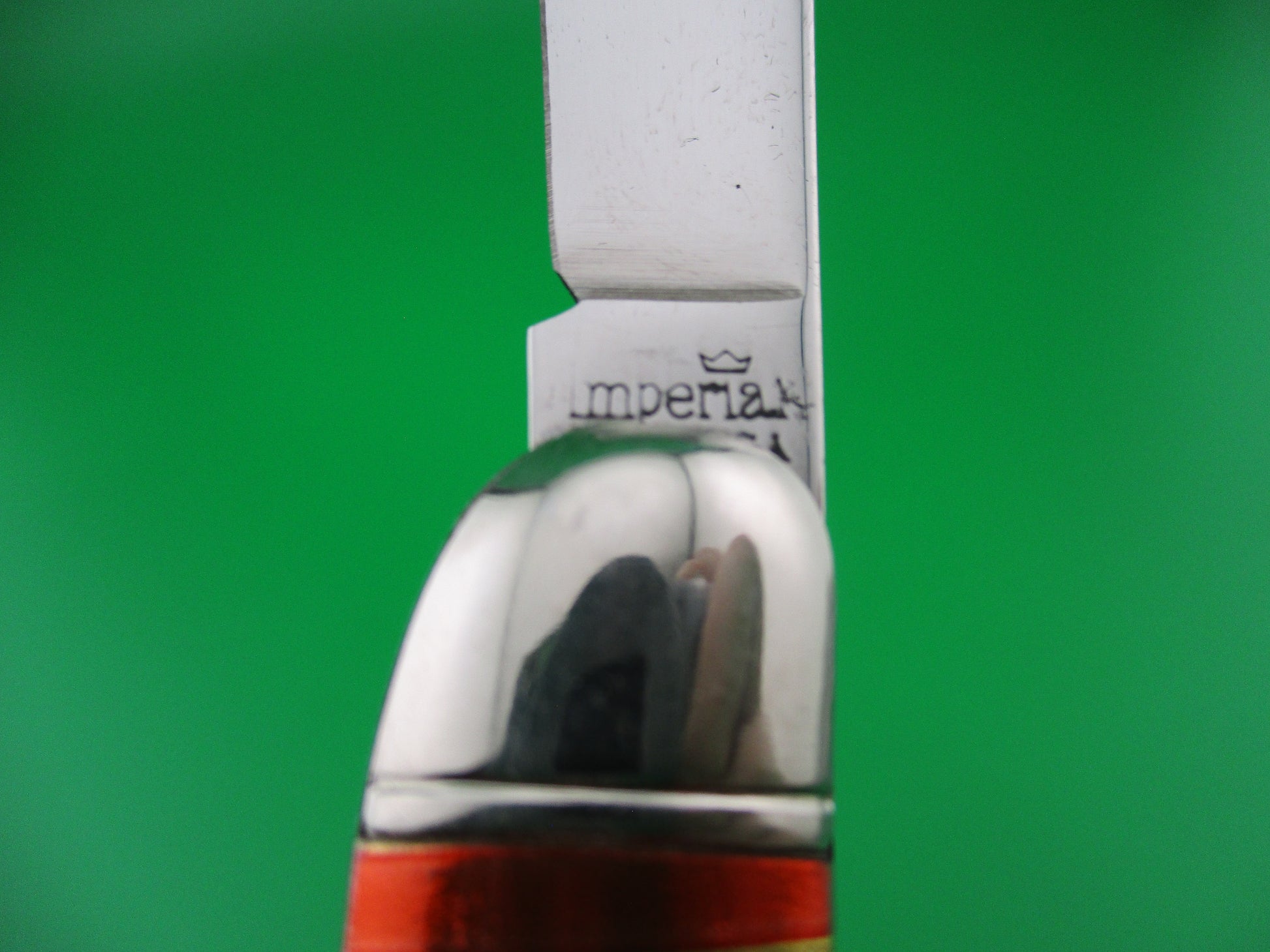 Gorgeous vintage Imperial toothpick style switchblade made in Providence, RI in the 1950s by the Imperial Knife Co. This knife measures 4.25 inches closed and just 7 5/8 inches open and has steel liners. The scales are hollow metal and are wrapped in beautiful Gold Foil candystripe material that's like new. The blade is 100% full with All of the original factory finish and is marked Imperial PROV USA on the front and the back is marked with 3 patent numbers ending in 537, 833 and 400. The knife works perfectly! Blade tip seats deep, opens with a loud thwak and locks open TIGHT, just like New! Safety works. This is nearly a new knife other than a couple of signs that the knife has been opened and closed a few times and a little light spotting over the patent numbers on the back that looks worse in the pics than in real life. Really Gorgeous old switchblade!! 100% money back guarantee including return shipping if not happy with this knife.
