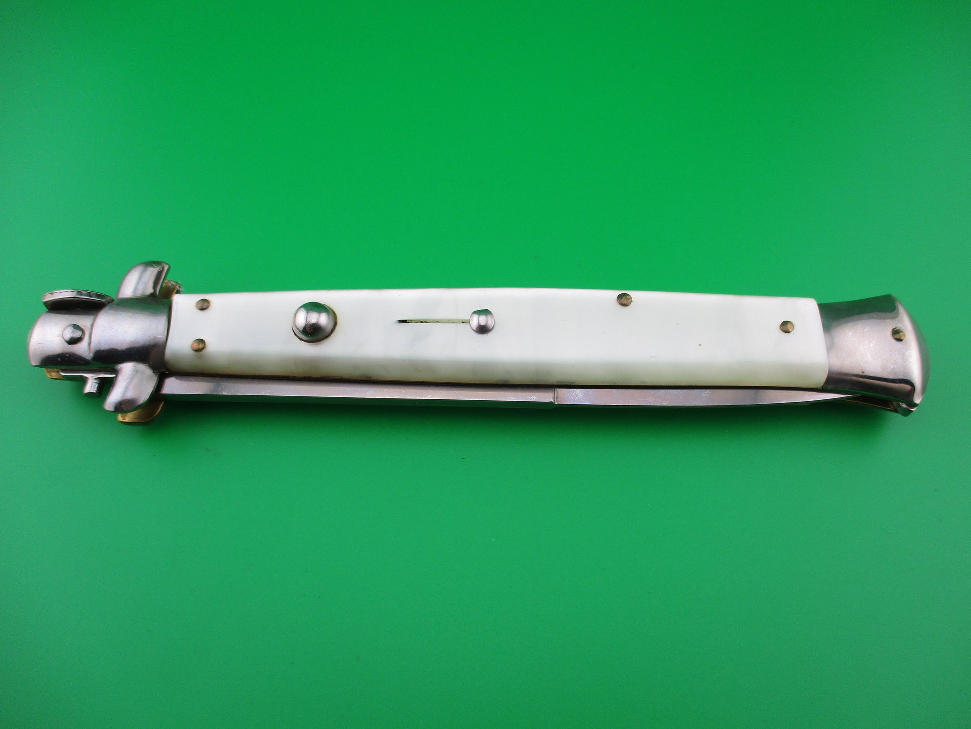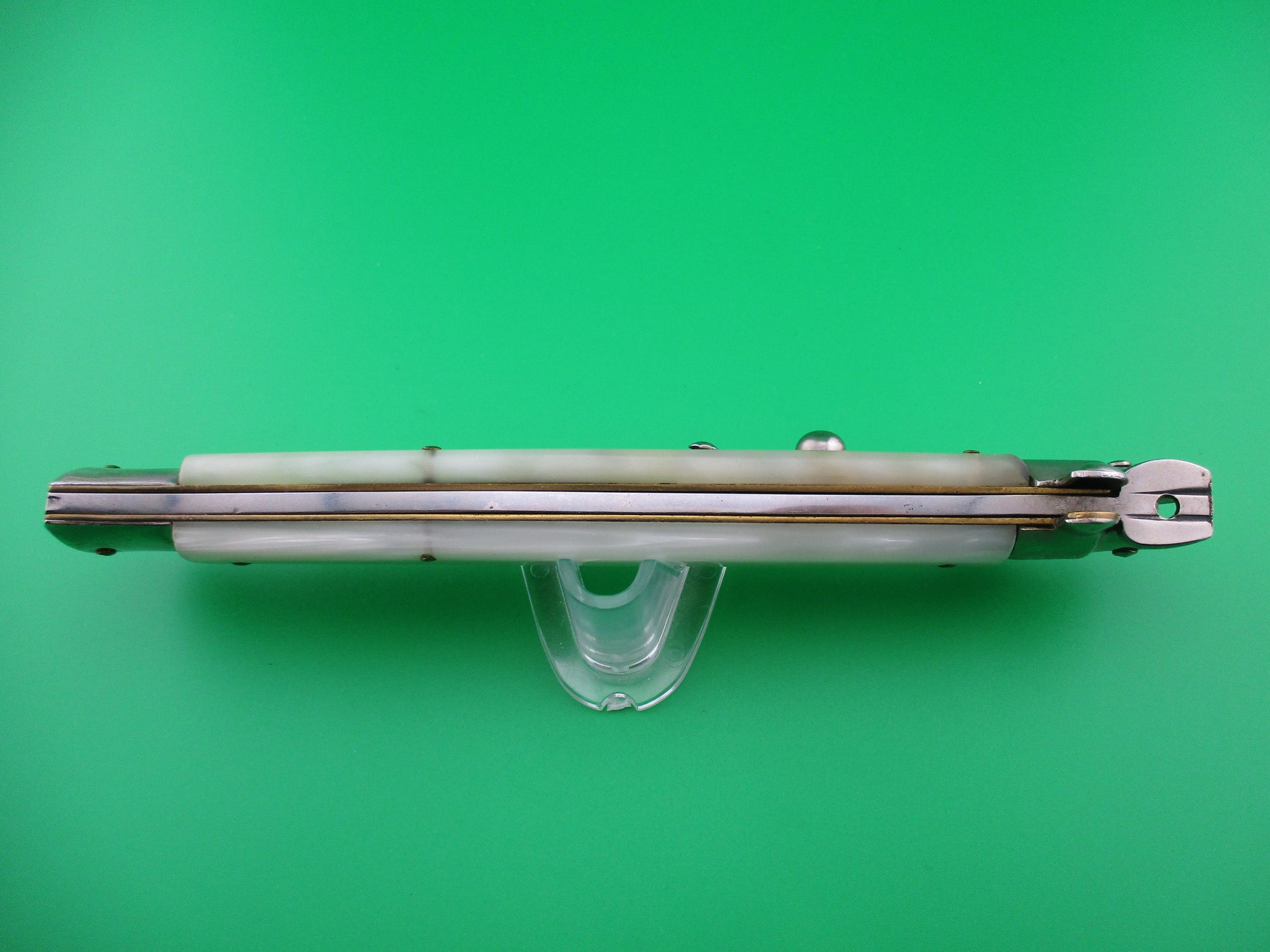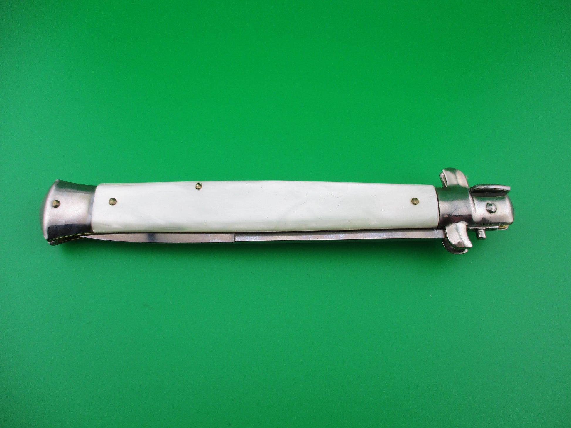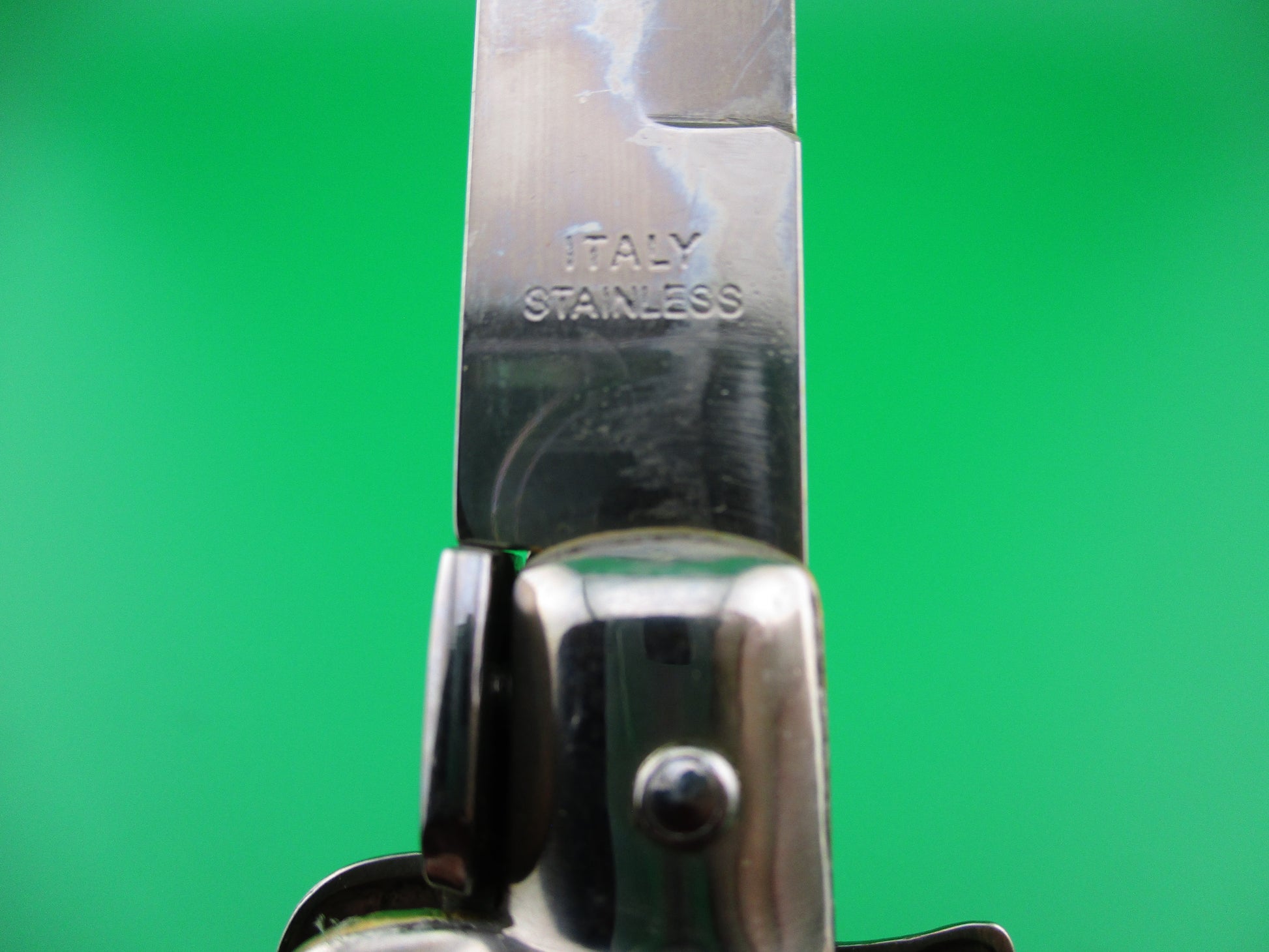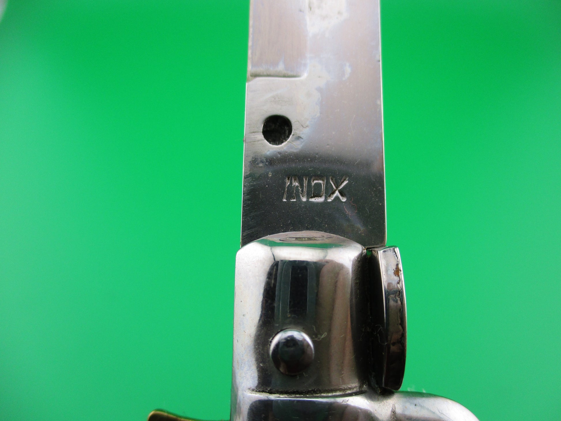 1 INOX ITALY STAINLESS 33cm Pearlex Italian swivel bolster stiletto automatic knife. Measures a little over 18cm (7.25 inches) closed and 33cm (13 inches) open with brass liners that extend behind the guards on the top rear bolster only. Also that bolster is made of Nickel silver and the others are stainless steel. I've seen this on other knives from this period (1980s & 90s). The bayonet style blade is full and retains all of the original finish and is stamped INOX on the front and ITALY STAINLESS on the rear ricasso (tang). Very attractive Pearlex (Faux Pearl) scales are in excellent condition with just a few light handling marks. Works like new. Blade tip deep in the well, strong snap and tight lockup! Safety works. Nearly new condition.