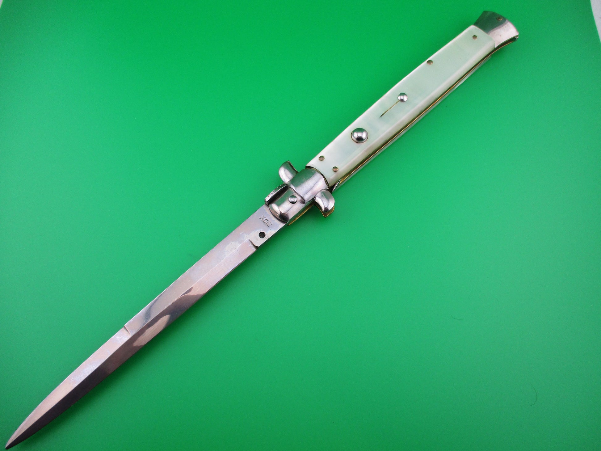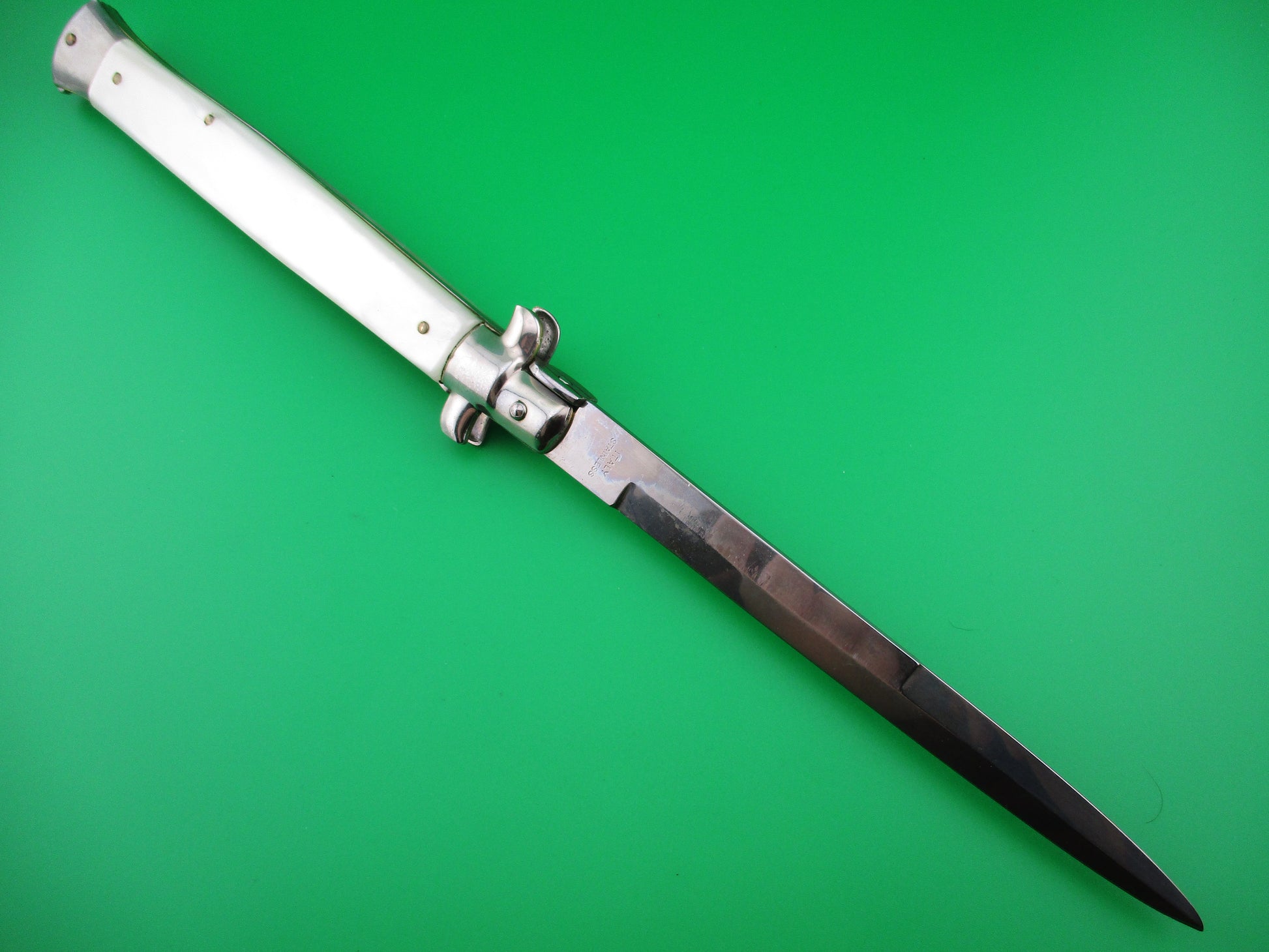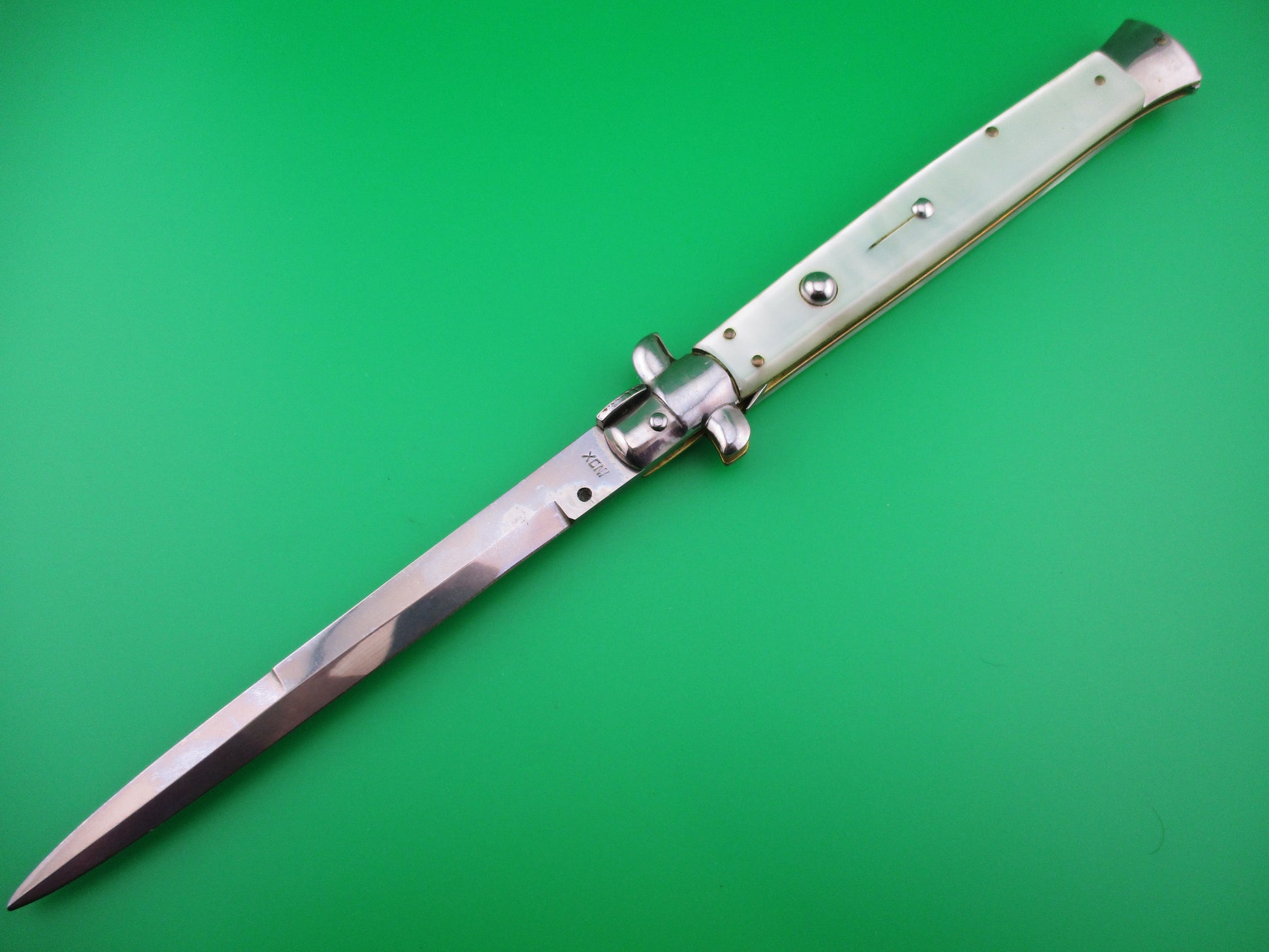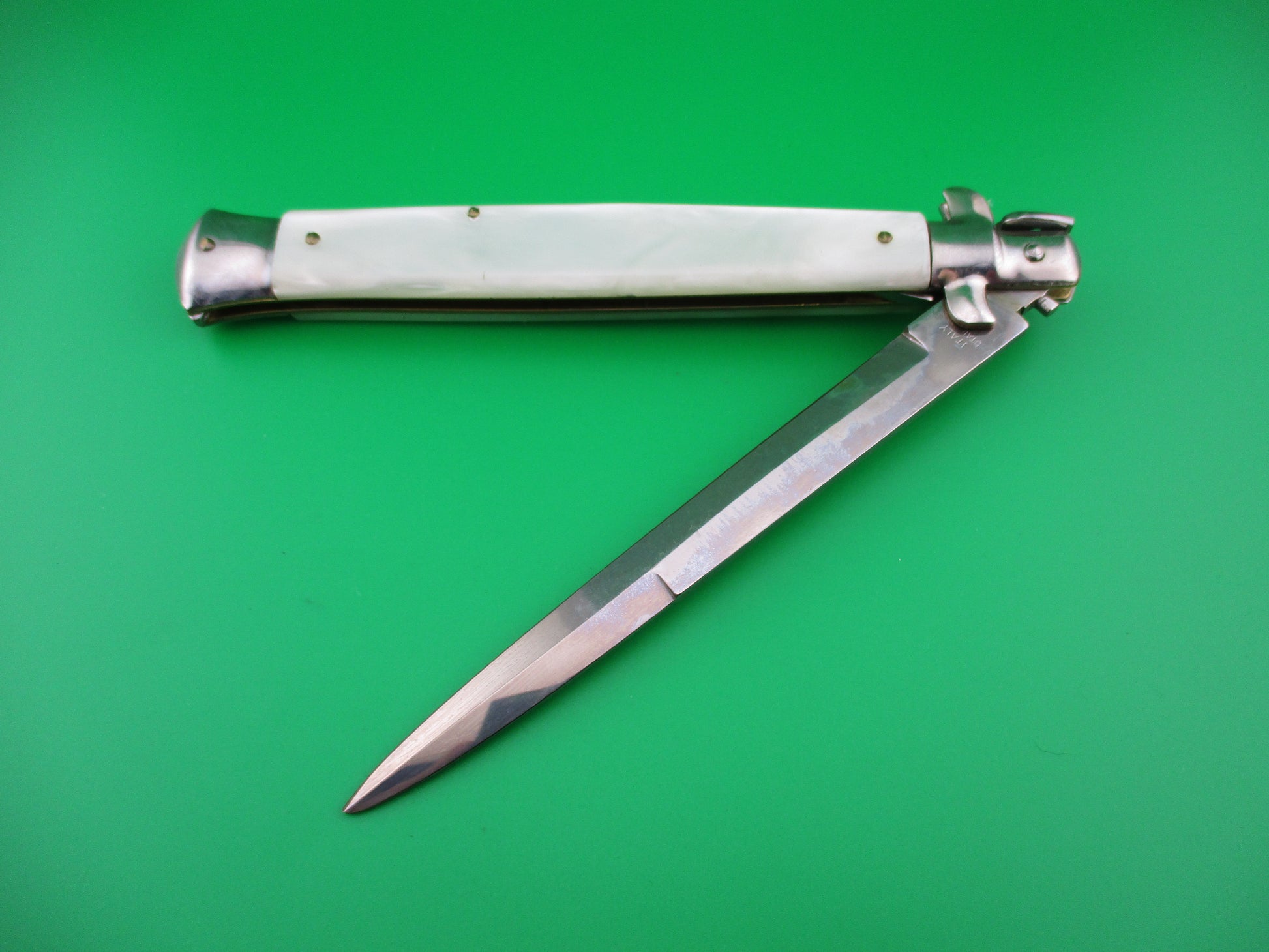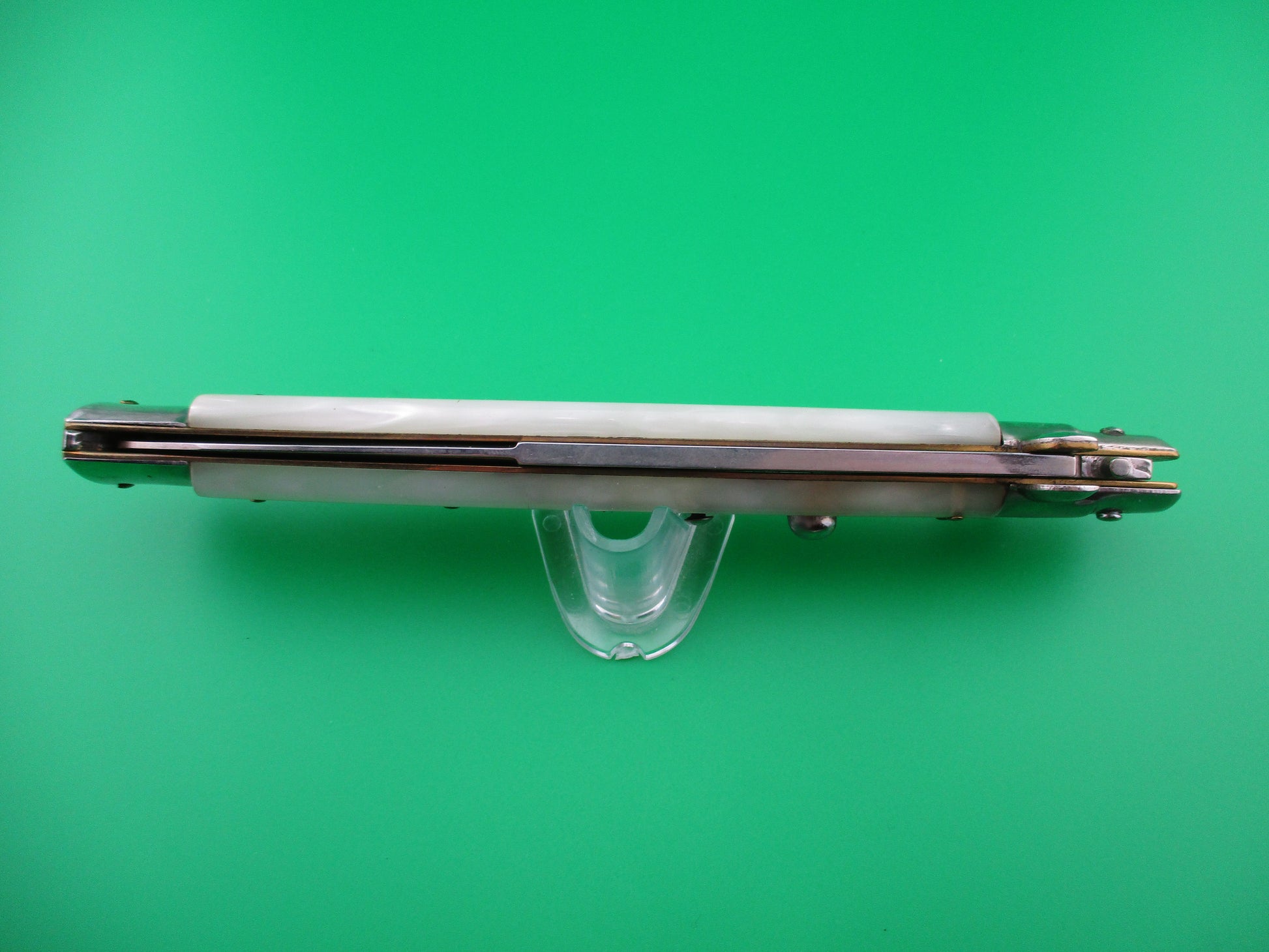 1 INOX ITALY STAINLESS 33cm Pearlex Italian swivel bolster stiletto automatic knife. Measures a little over 18cm (7.25 inches) closed and 33cm (13 inches) open with brass liners that extend behind the guards on the top rear bolster only. Also that bolster is made of Nickel silver and the others are stainless steel. I've seen this on other knives from this period (1980s & 90s). The bayonet style blade is full and retains all of the original finish and is stamped INOX on the front and ITALY STAINLESS on the rear ricasso (tang). Very attractive Pearlex (Faux Pearl) scales are in excellent condition with just a few light handling marks. Works like new. Blade tip deep in the well, strong snap and tight lockup! Safety works. Nearly new condition.