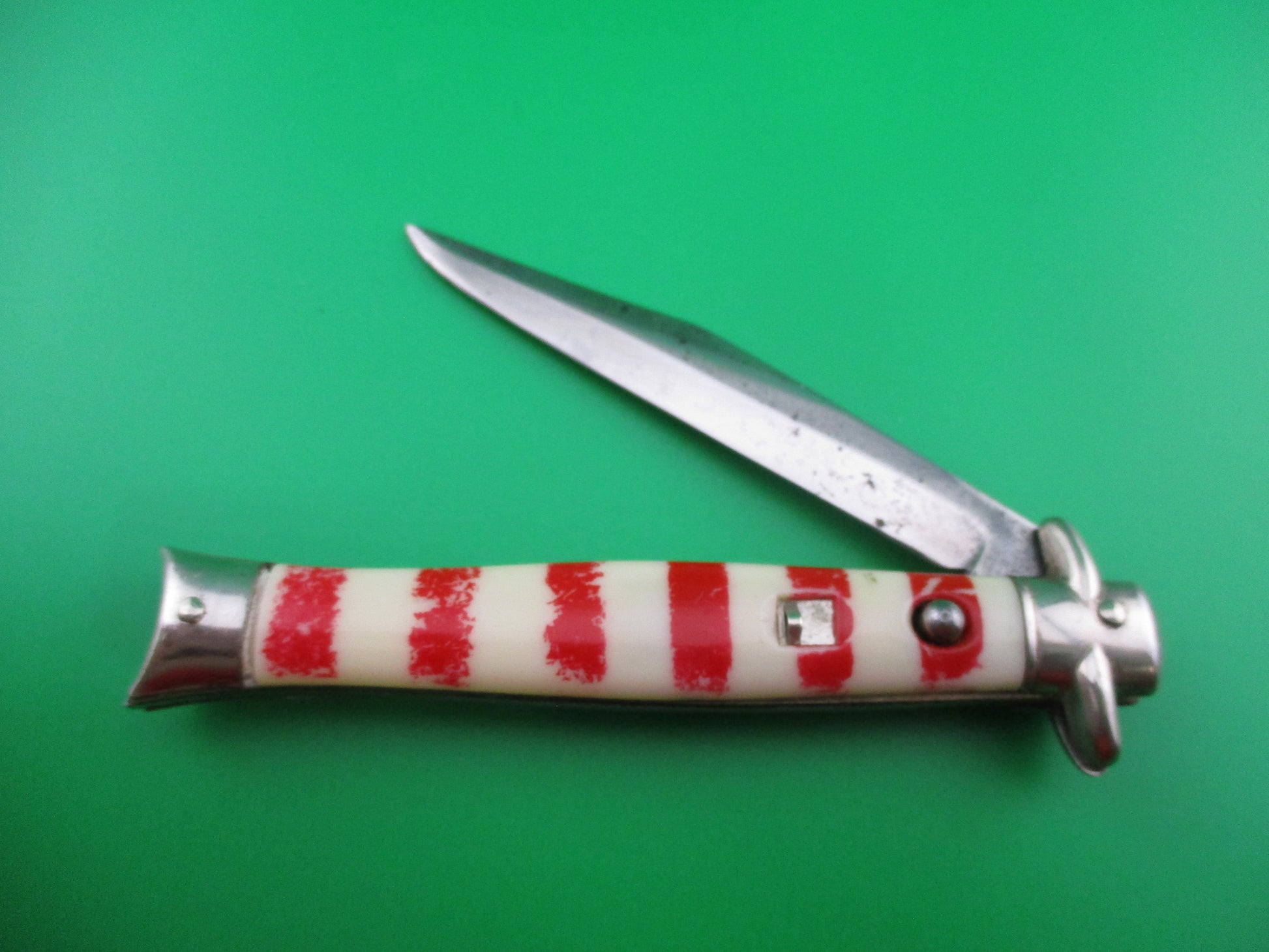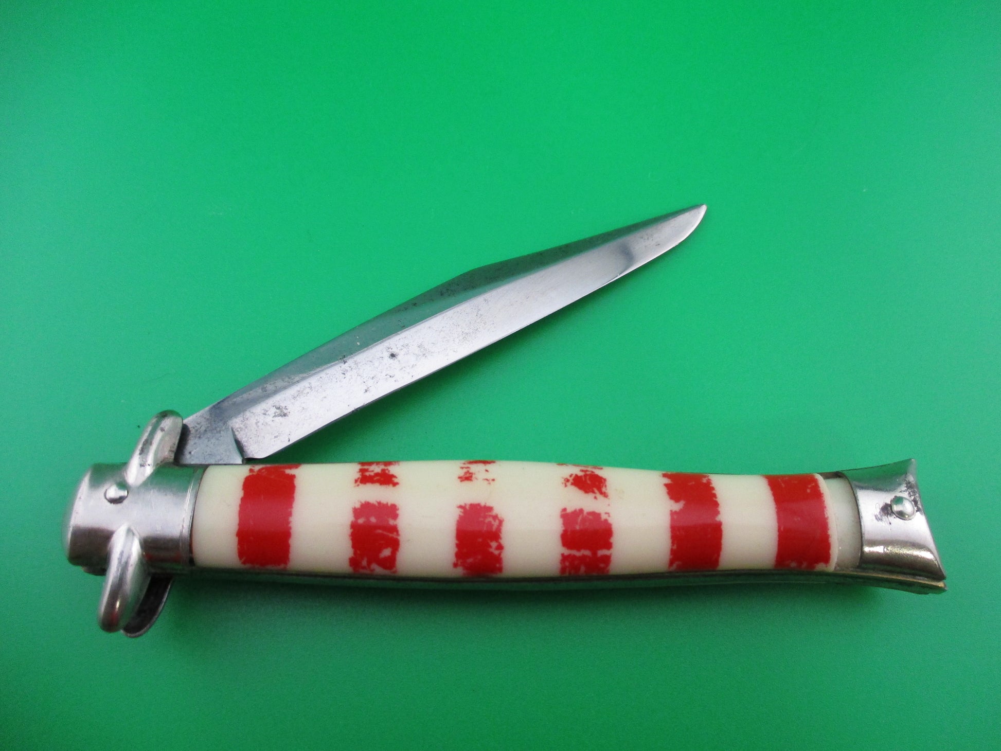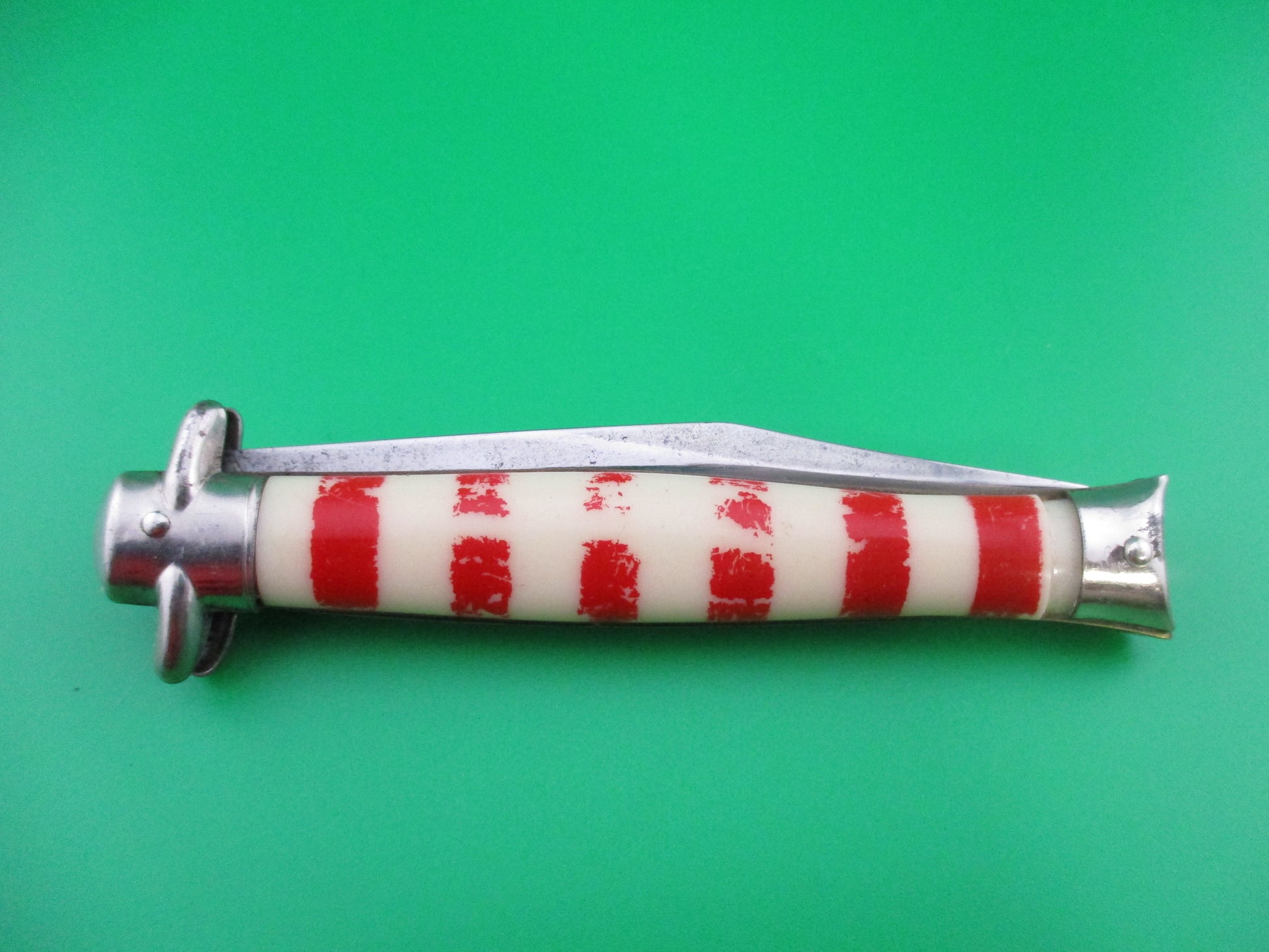 Colonial Knife Co made Shur Snap bowtie switchblade. This is an early model made before 1955 in Providence, RI. We can date it by the characteristics of small domed button and bolsters. The blade is stamped SHUR-SNAP COLONIAL PROV USA. This knife measures 4 inches closed and 7.25 inches open with brass liners. The blade is mostly full and shiny with some pitting, but nice overall. The scales are Barber shop Red/white striped and are in vg condition with minimal shrinkage near bottom bolsters. The knife works well, tip below liners, good snap and average lockup for a knife like this that has seen use over the past 70 years. Some movement each way, but it does lock and safety does work with approx 3/16" at the tip. This is original factory painted scales.