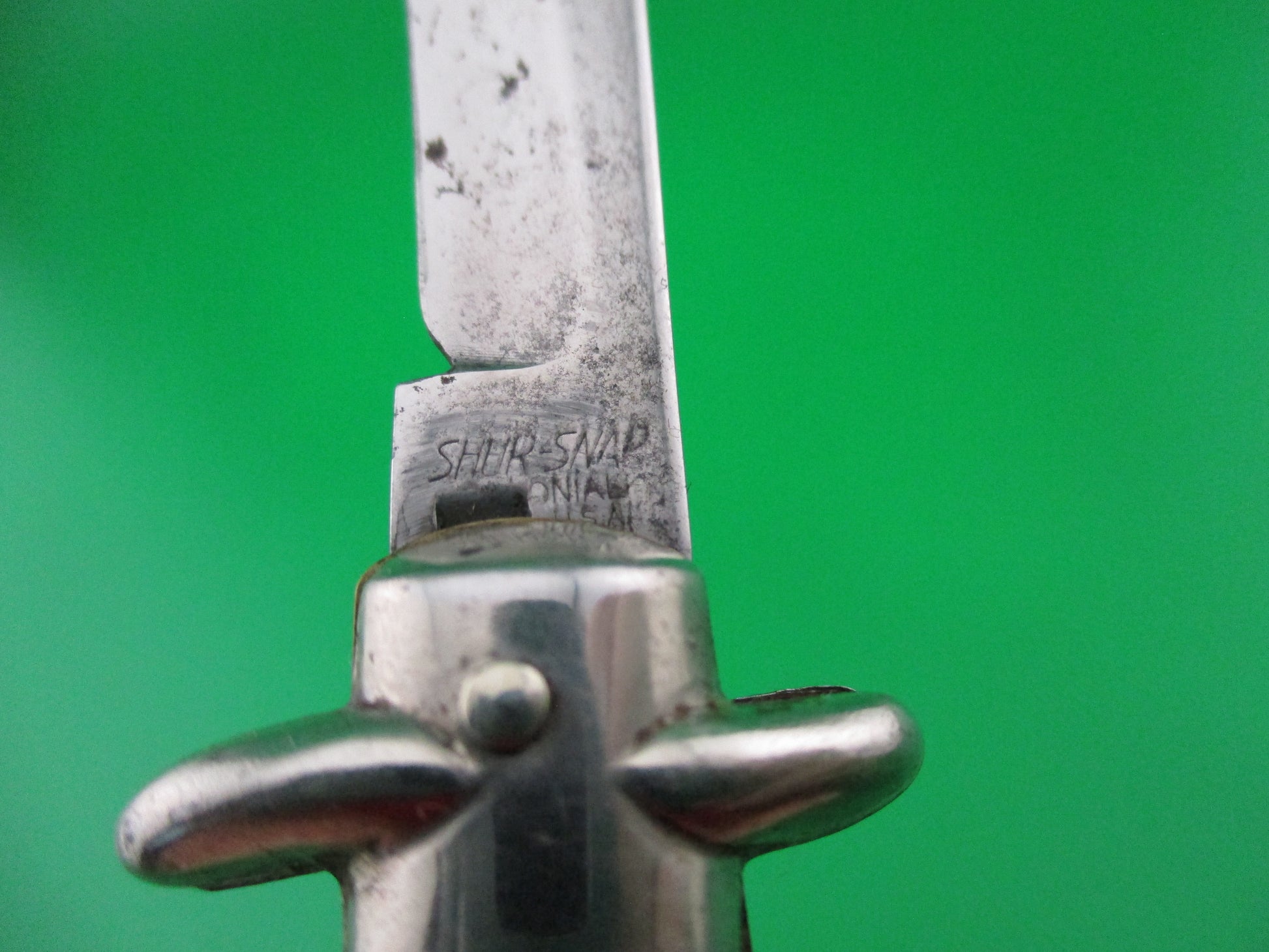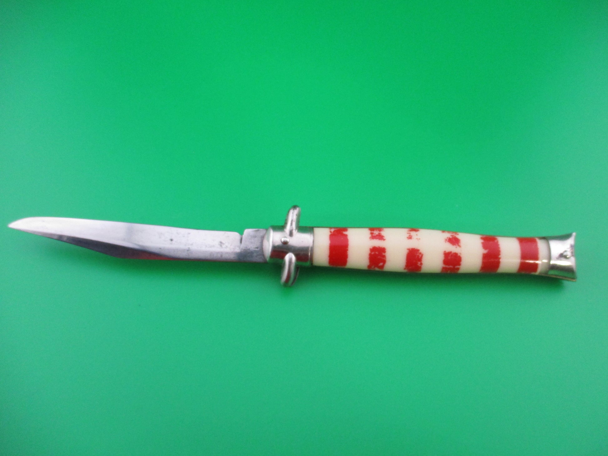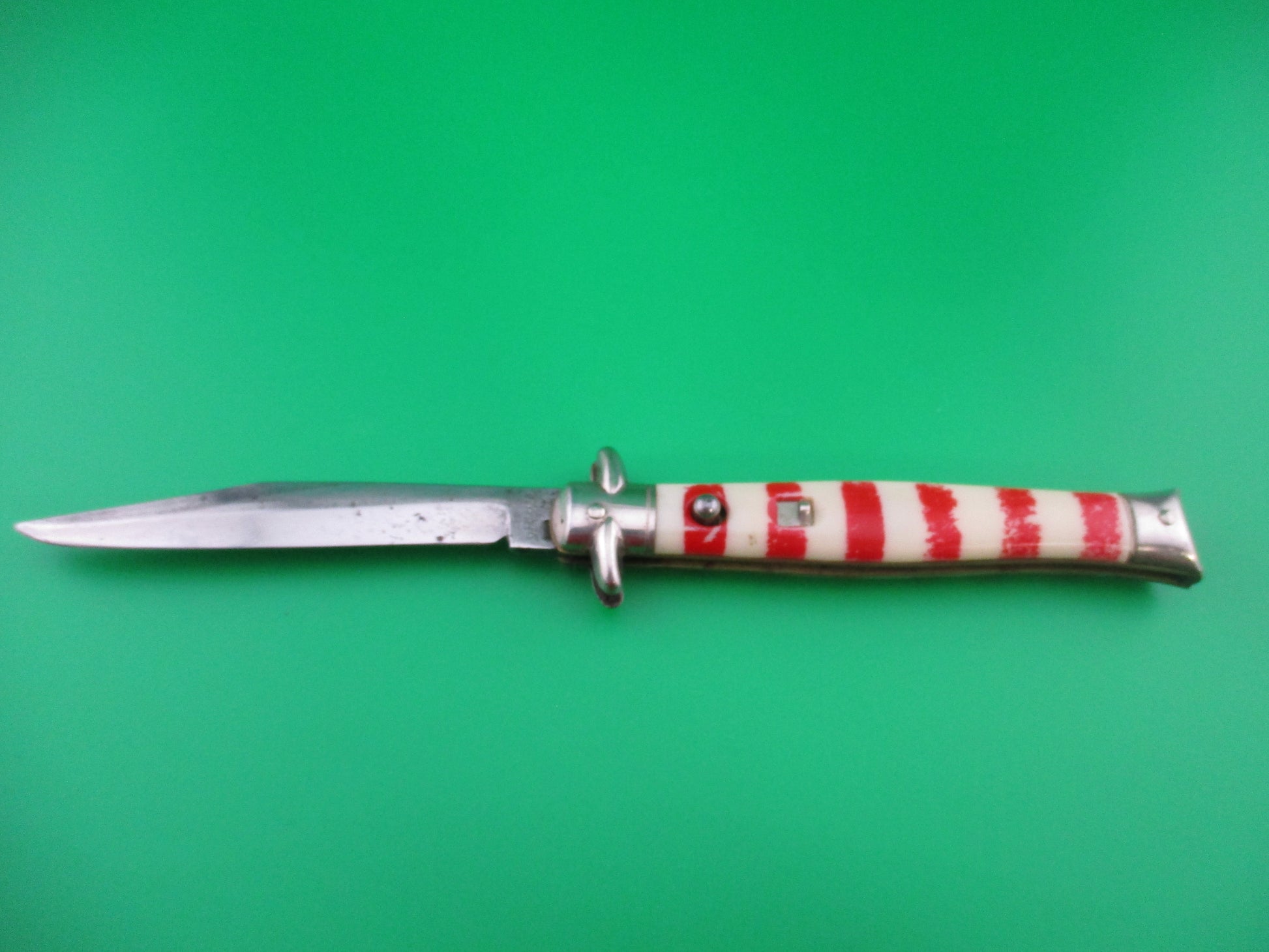 Colonial Knife Co made Shur Snap bowtie switchblade. This is an early model made before 1955 in Providence, RI. We can date it by the characteristics of small domed button and bolsters. The blade is stamped SHUR-SNAP COLONIAL PROV USA. This knife measures 4 inches closed and 7.25 inches open with brass liners. The blade is mostly full and shiny with some pitting, but nice overall. The scales are Barber shop Red/white striped and are in vg condition with minimal shrinkage near bottom bolsters. The knife works well, tip below liners, good snap and average lockup for a knife like this that has seen use over the past 70 years. Some movement each way, but it does lock and safety does work with approx 3/16" at the tip. This is original factory painted scales.
