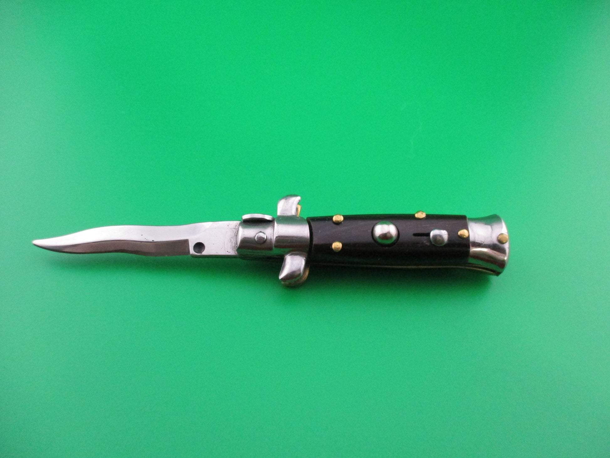 Cute little 12cm Italian stiletto with a KRIS blade. This is a recently made knife that measures 2 5/8" closed and 4 5/8" open with brass liners. There are no markings on the knife. Blade is full and has been sharpened a bit on one edge. The scales are dark horn with some tan streaks. The knife works great with blade tip seating deep, good snap and tight lockup. This is a swivel bolster so you have to push on the right front finger guard to pivot/swivel the bolster to release the blade to be closed. Cool little automatic Italian stiletto with Kris blade.