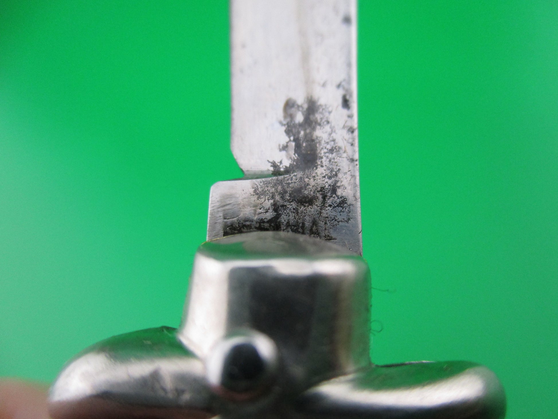 This is a Snappy keychain switchblade made by the Colonial Knife Co of Providence, RI in the late 1950s. You can tell it's a later one by the large domed button and bolsters. The blade is stamped SNAPPY COLONIAL PROV USA, but stamp is weak and hard to read any of it. It was designated the model #1600CB. The knife measures 2.5 inches closed and 4 3/8 inches open with brass liners. The blade is full and retains much of the original factory finish with some tiny pit spots. The Yellow colored synthetic scales are in good condition with no cracks, or chips with minimal shrinkage and slight warp of the front scale. The knife works great with the blade tip seating deep, good snap and locks up with approx 1/16' up and down which is very good for these knives when they've seen some use over the past 60 years. Safety works great. This is a very nice example that grades EX.