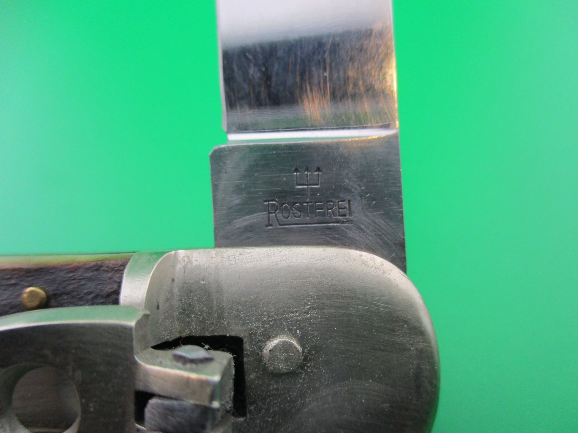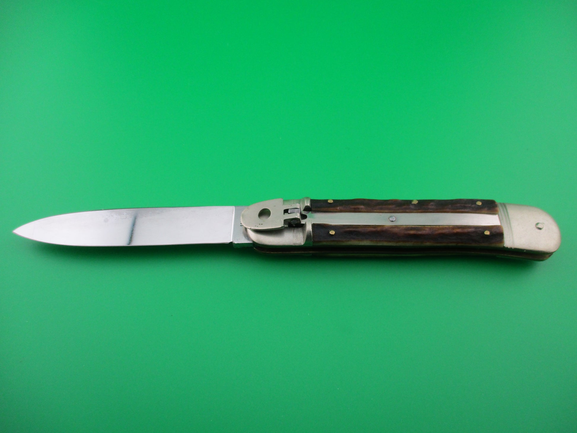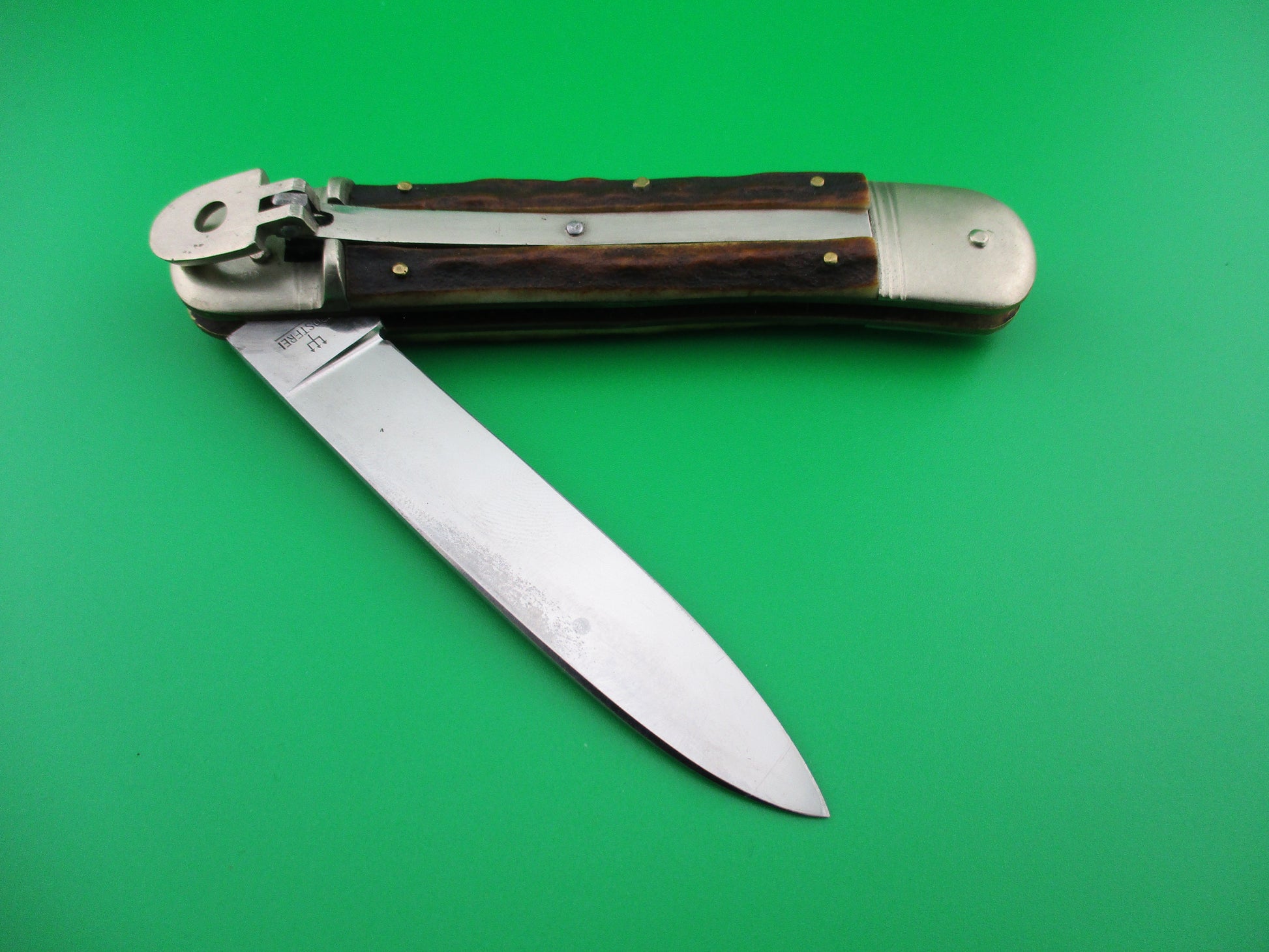 Nice vintage German lever switchblade marked Ed Wusthof in an arch over SOLINGEN with a Trident between on the rear of the tang and a Trident over ROSTFREI on the front. The knife measures 4.5 inches closed (11.5cm) and just under 8 inches open with brass liners and German silver bolsters and lever. The scales are stag and very nice with no cracks or chips. The blade is full with all of the original factory finish! The knife works great with the blade tip seating deep, super strong snap and tight lockup!