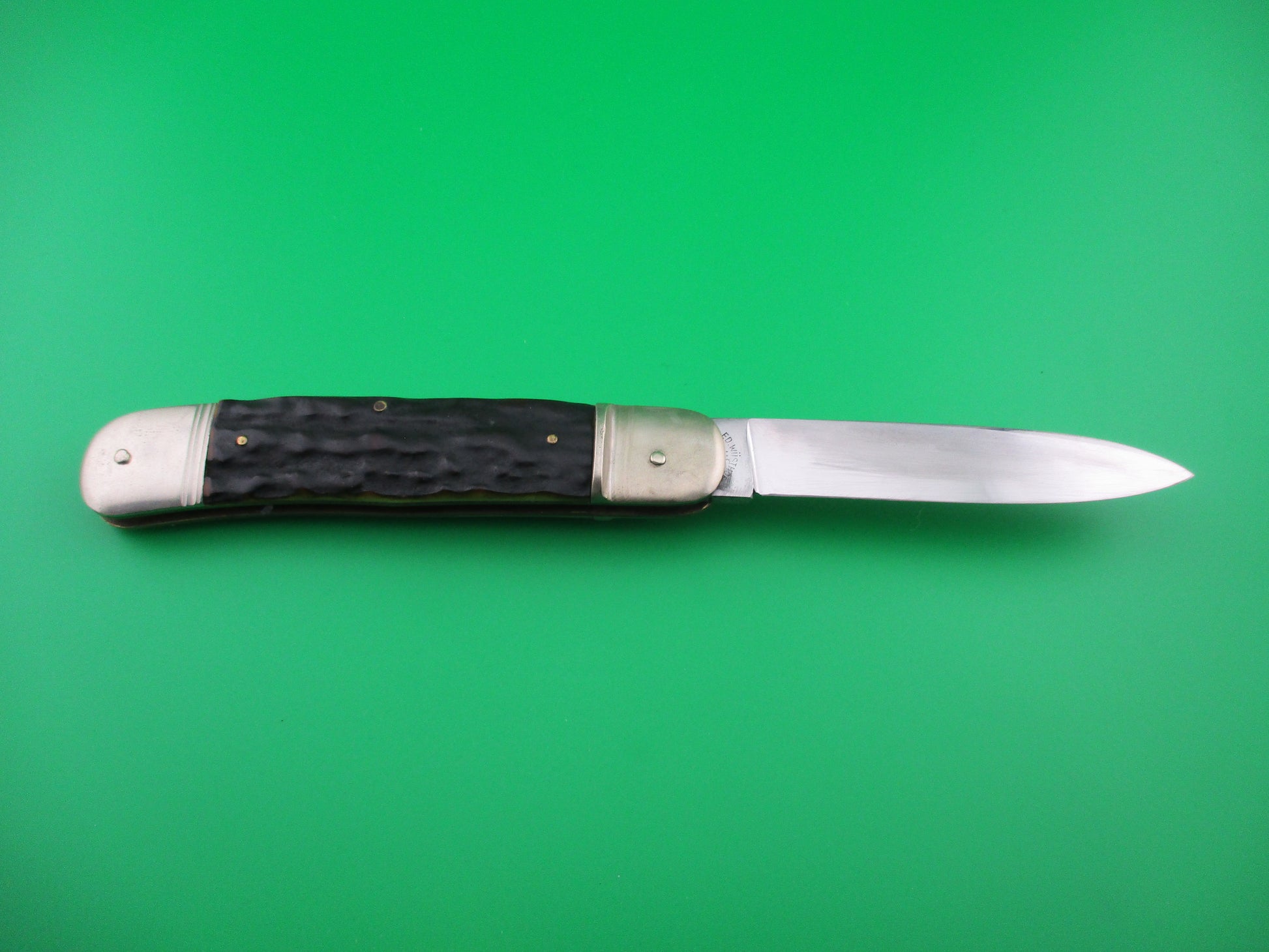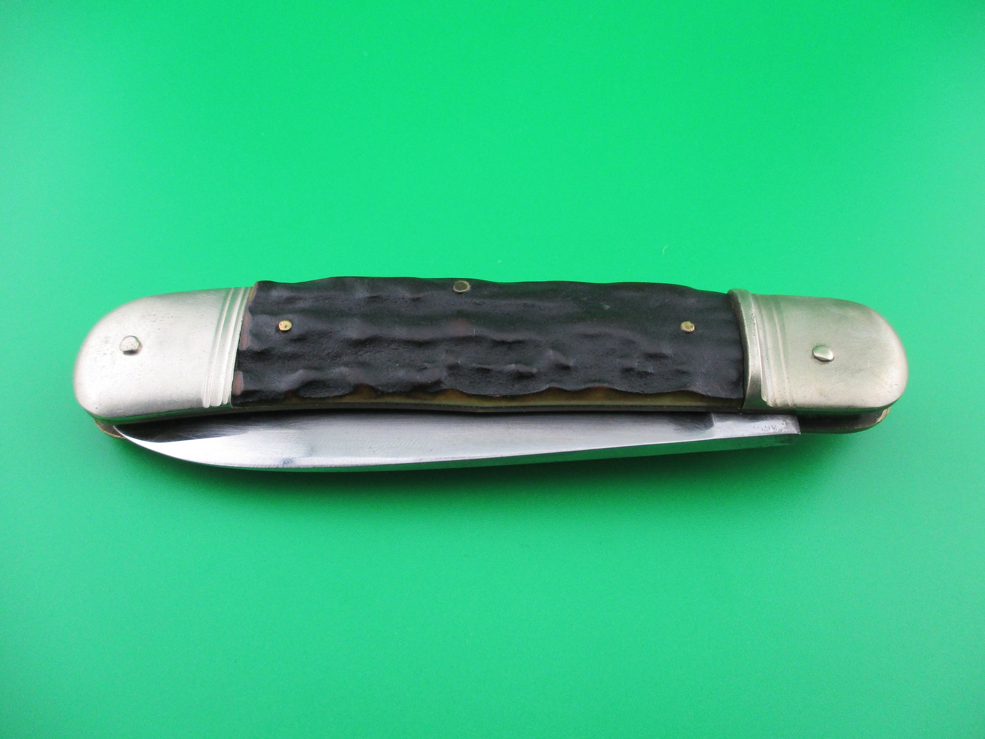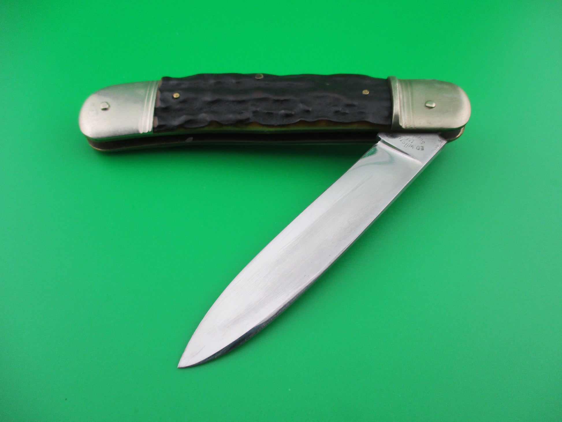 Nice vintage German lever switchblade marked Ed Wusthof in an arch over SOLINGEN with a Trident between on the rear of the tang and a Trident over ROSTFREI on the front. The knife measures 4.5 inches closed (11.5cm) and just under 8 inches open with brass liners and German silver bolsters and lever. The scales are stag and very nice with no cracks or chips. The blade is full with all of the original factory finish! The knife works great with the blade tip seating deep, super strong snap and tight lockup!