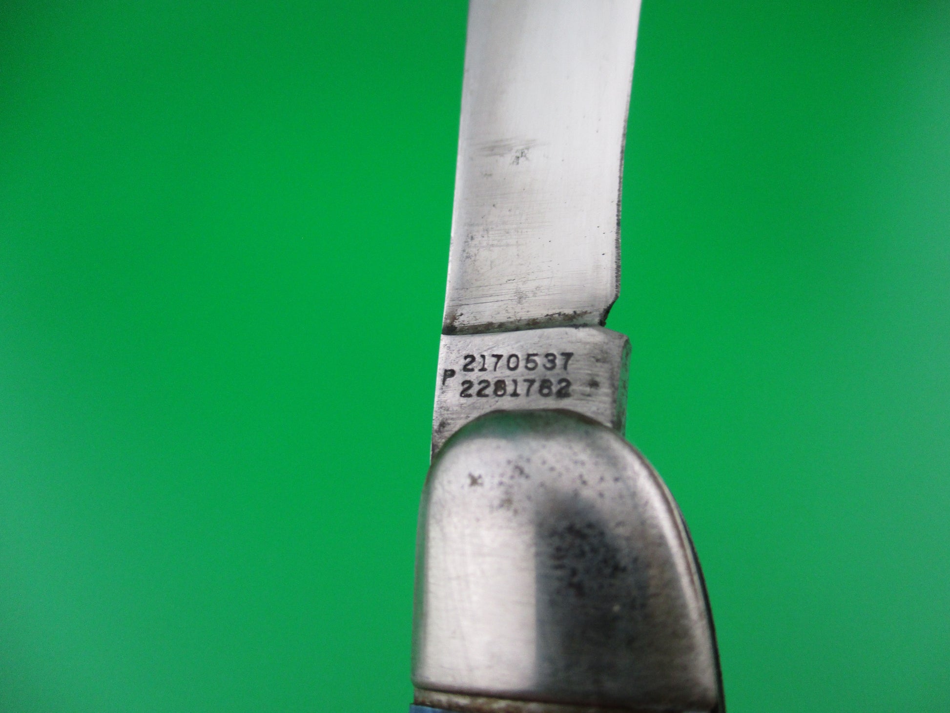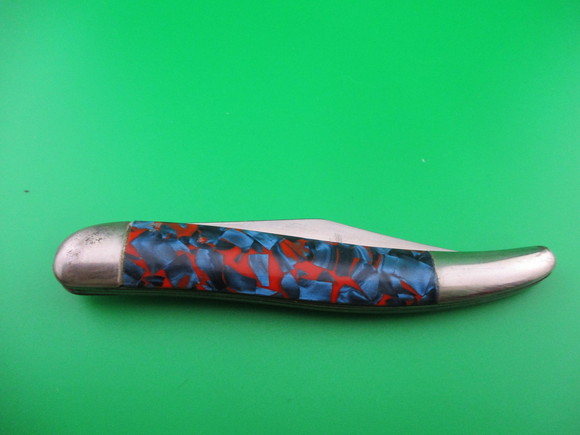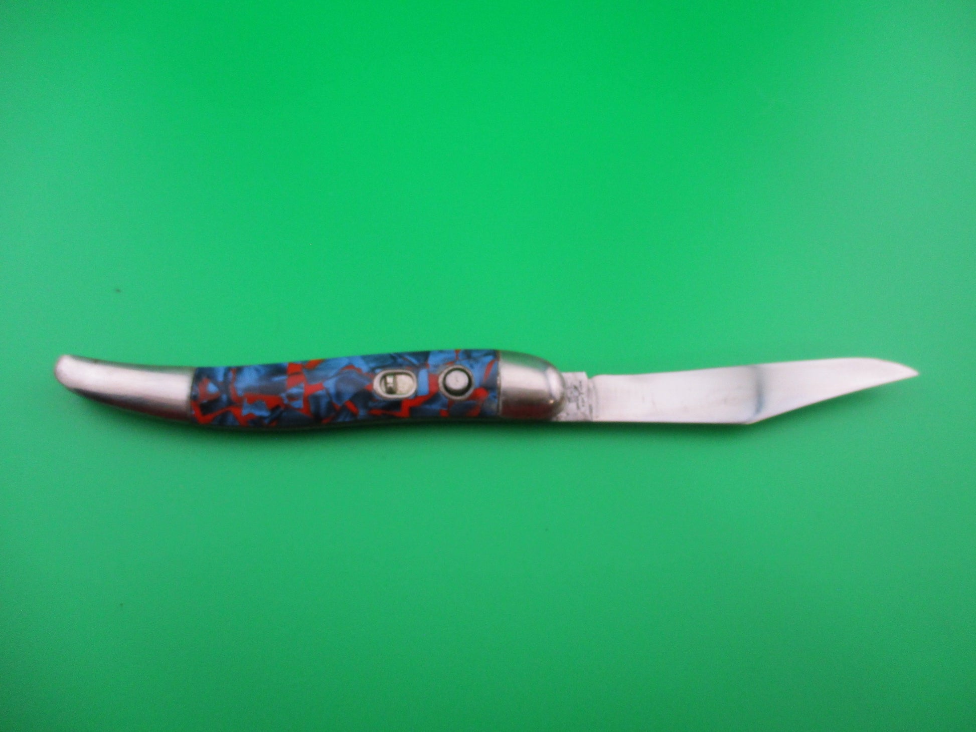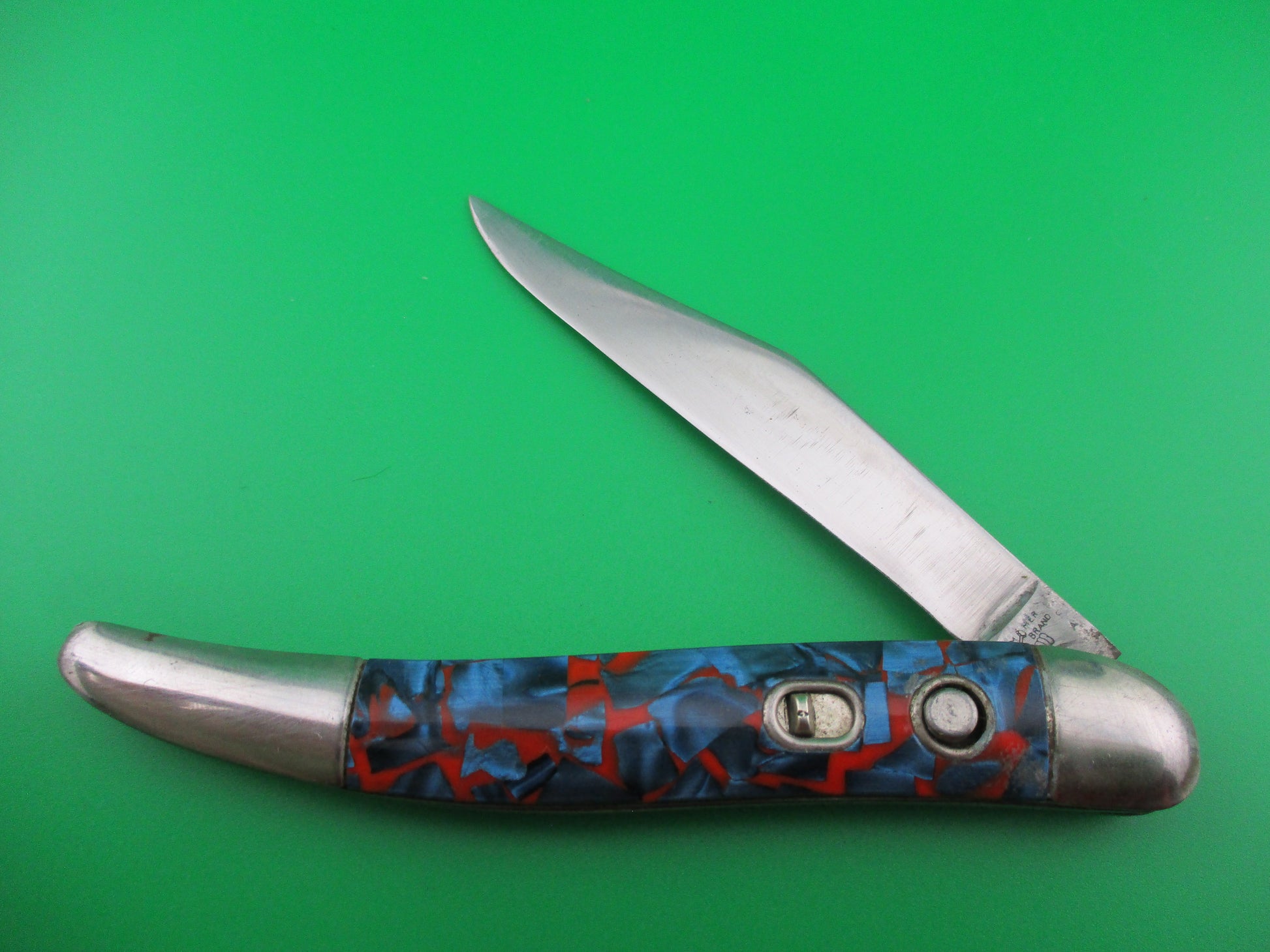 Vintage Hammer Brand toothpick style switchblade made in Providence, RI in the 1950s by the Imperial Knife Co and designated model #JM-90-PBC. This knife measures 4.25 inches closed and just over 7.5 inches open and has brass liners. The scales are hollow metal wrapped in Blue Pearl Red swirl celluloid. The blade is mostly full and shiny with some light scratches. It's marked Hammer Brand USA on the front with a picture of an arm holding a hammer. The back is marked with 2 patent numbers. The knife works well. Blade tip seats deep, opens fully and average lockup with approximately 1/4 inch up and down at the tip. Safety works. Nice old American fisherman's switchblade. Helpful tip: These knives open best with a downward sweeping motion on the button rather than a direct push straight down. This is one that opens better using this tip.