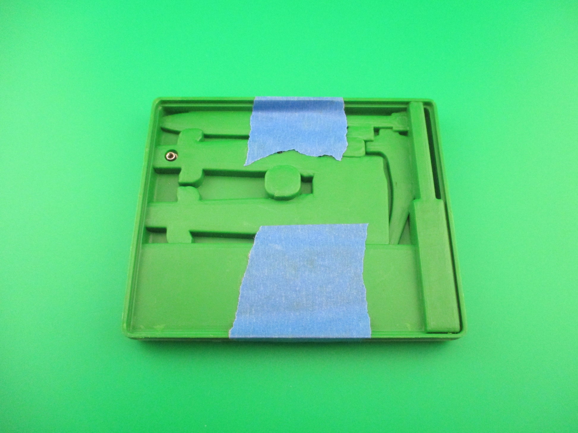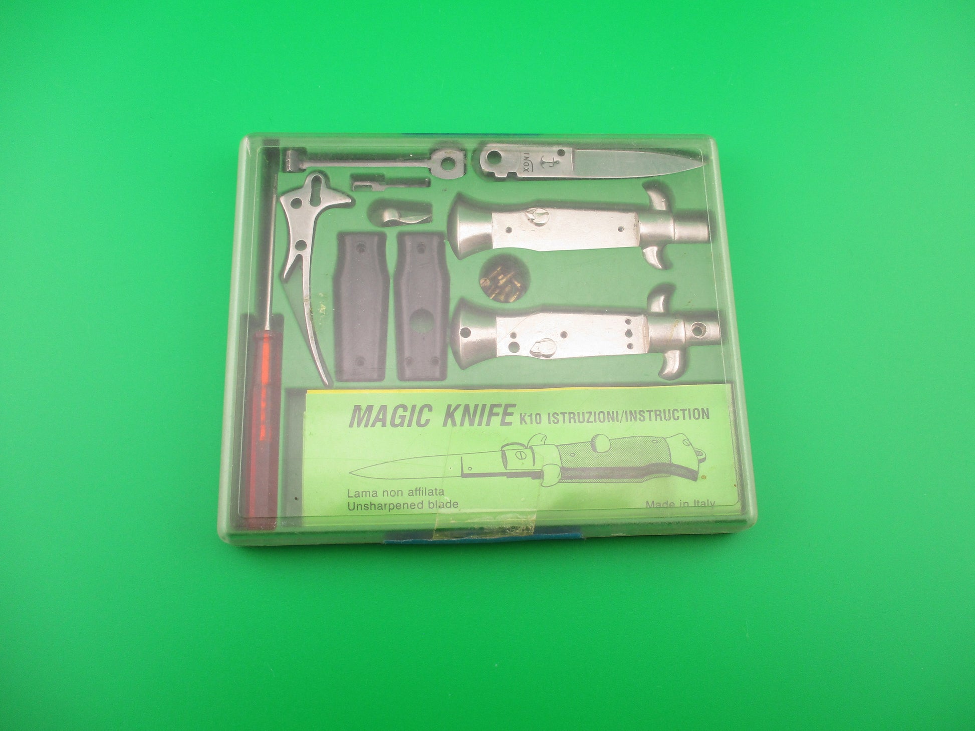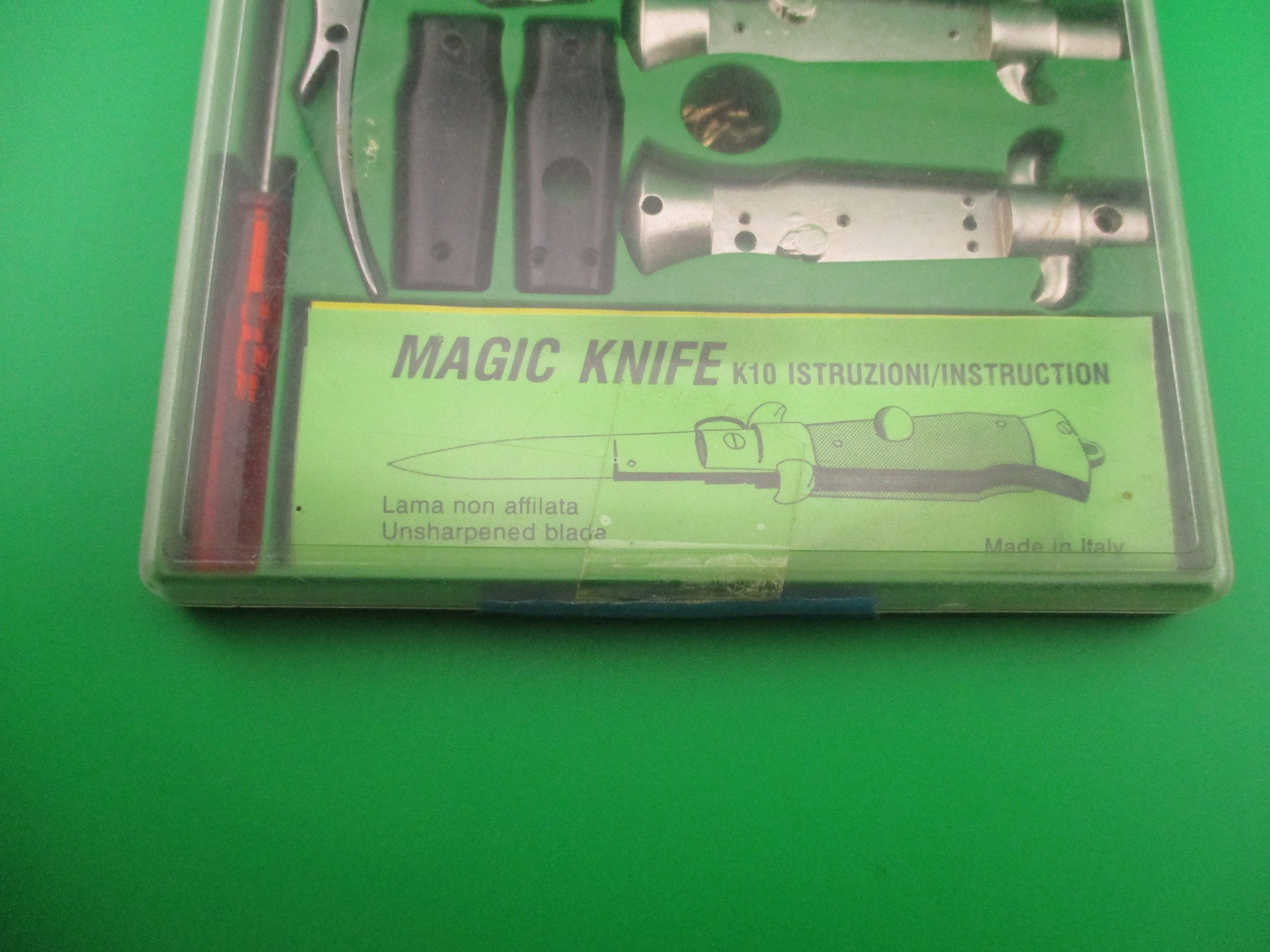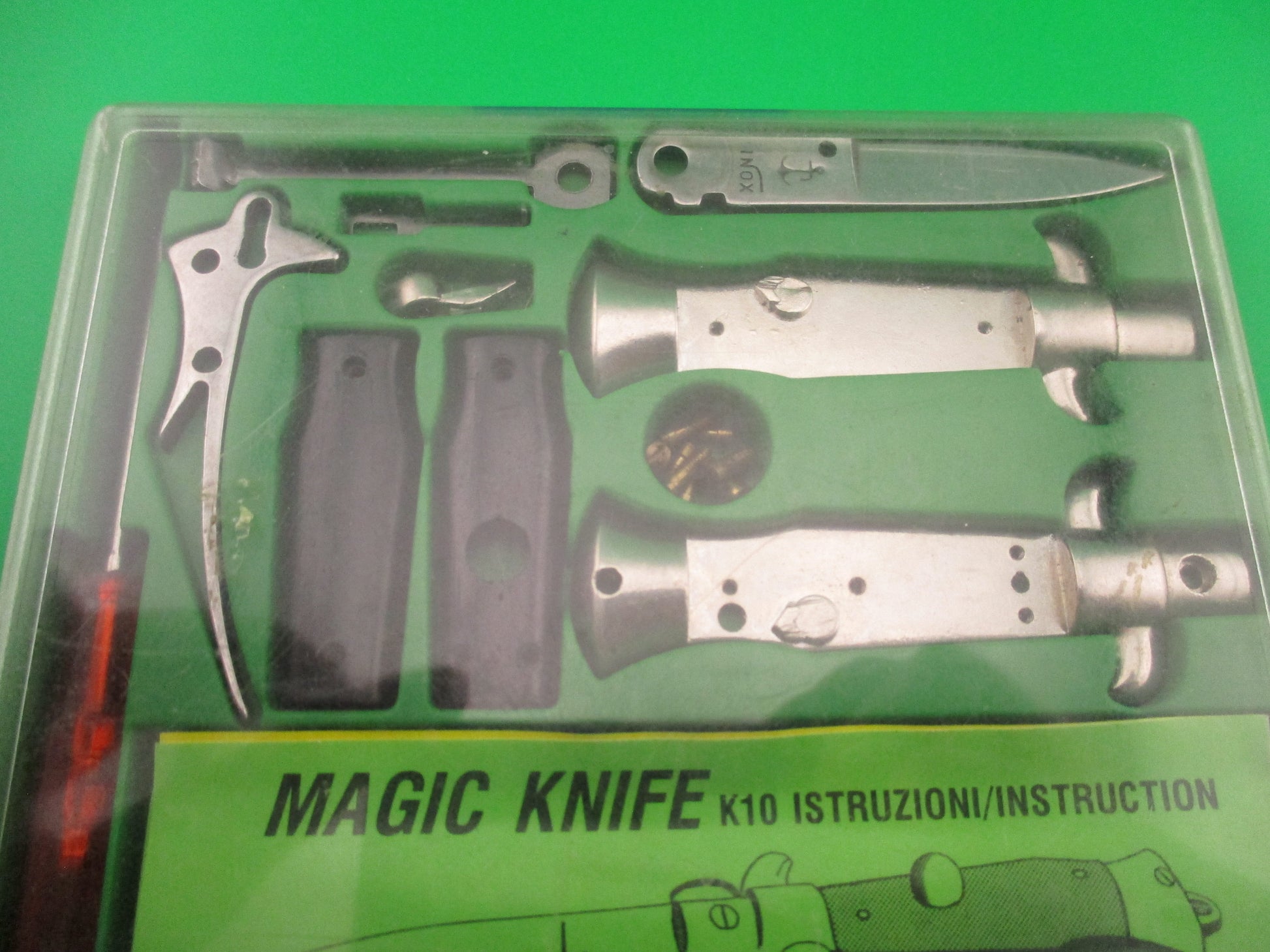 Magic Knife Kit Green background black scales vintage stiletto made in Italy 1980s or 90s. Cute little kit made in Italy to assemble your own little Italian stiletto. Everything you need to make your own functional switchblade knife. Kit has green background. New Old Stock sealed.
