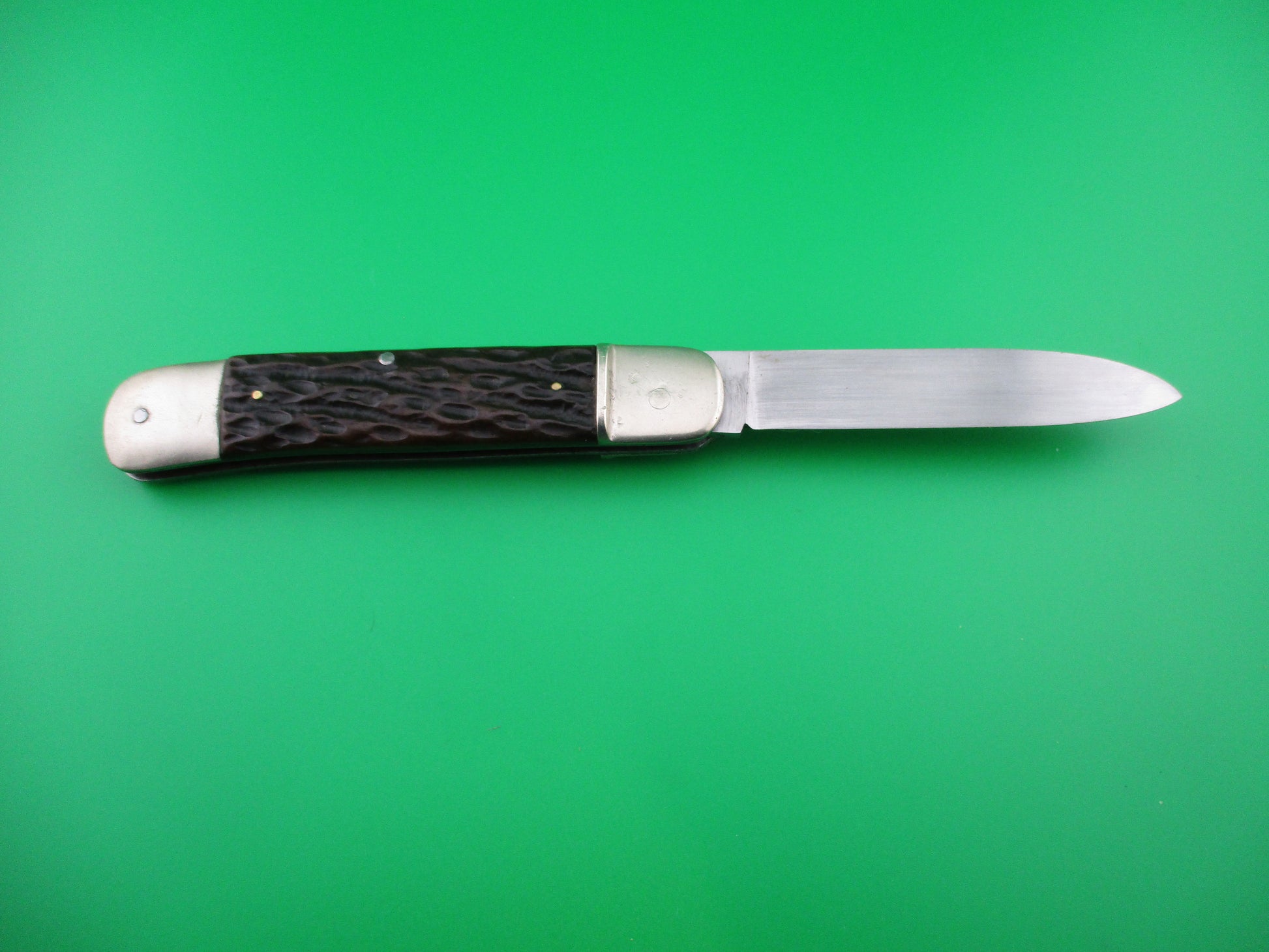 This is a German lever knife with jigged bone handles (scales). made by Bonsa, most likely before 1980. The knife measures a little over 10cm (4 1/2") closed and just under 8 inches open with steel liners and German silver bolsters and lever. The blade is nearly full and shiny with some light scratches and is not marked, which is odd for a German lever knife. It's possible that the blade is not original, or stamps were sanded off. Either way it's a GREAT blade with a full profile. The knife works well with blade tip deep in the well closed, good snap and good lockup. Nice old German lever knife.