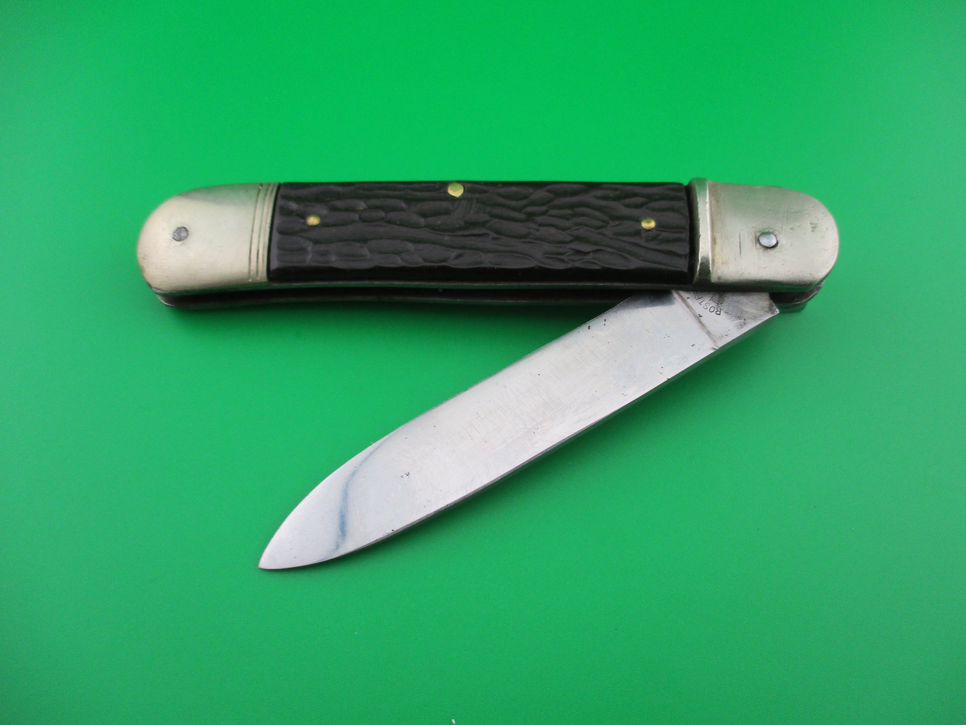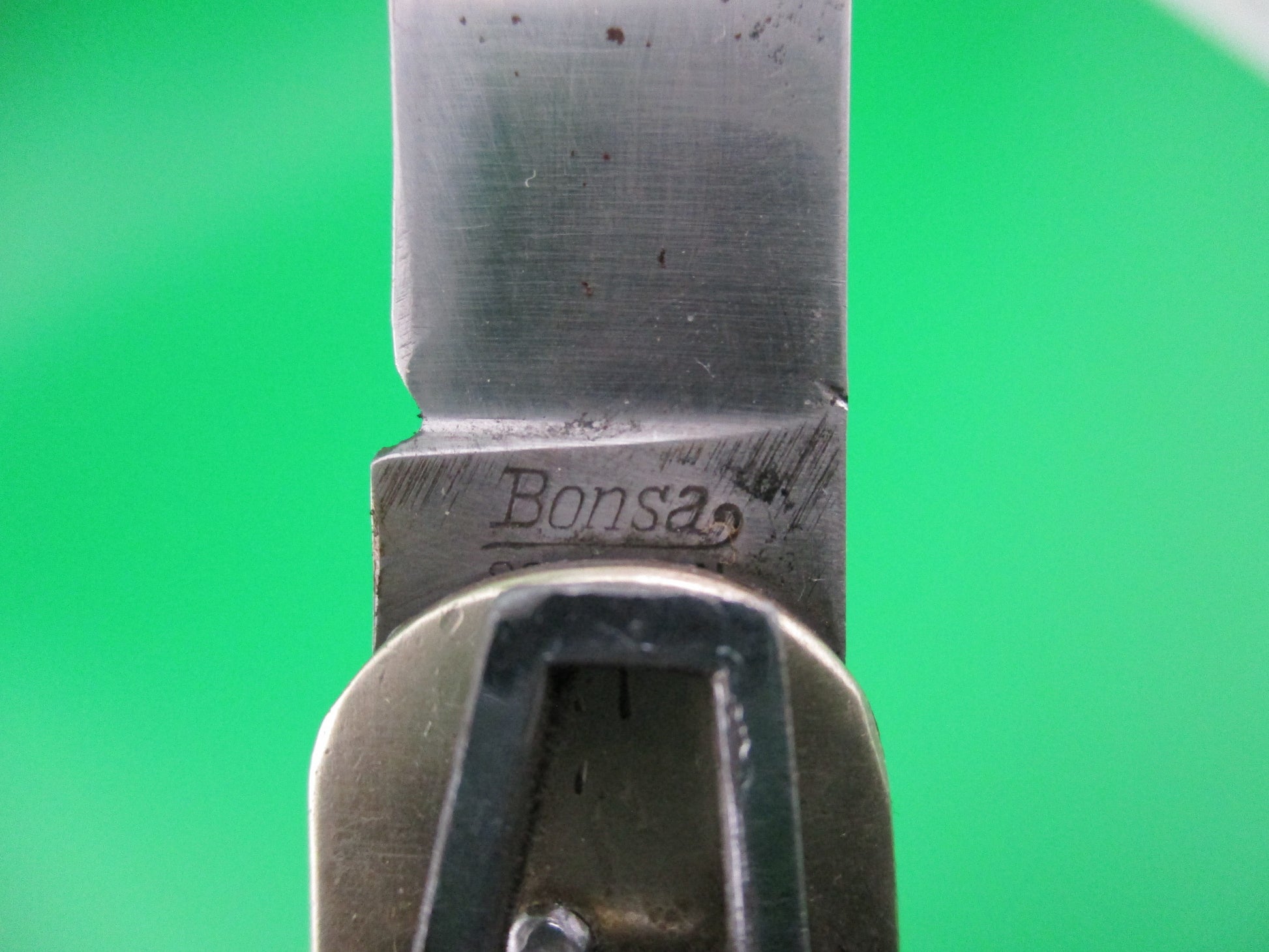 This is a German lever knife with jigged bone handles (scales) made by Bonsa, most likely before 1980. The knife measures a little over 11cm (4.5") closed and 7.75 inches open with steel liners and German silver bolsters. The blade is nearly full and shiny with a lot of light scratches and is marked Bonsa SOLINGEN GERMANY on the front and ROSTFREI in an arch over a leg kicking a ball on the rear. Works well with blade tip below liners when closed, good snap and good average lockup. Nice old German lever knife.