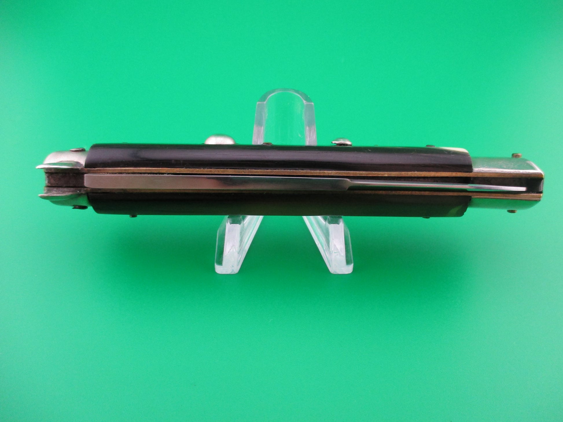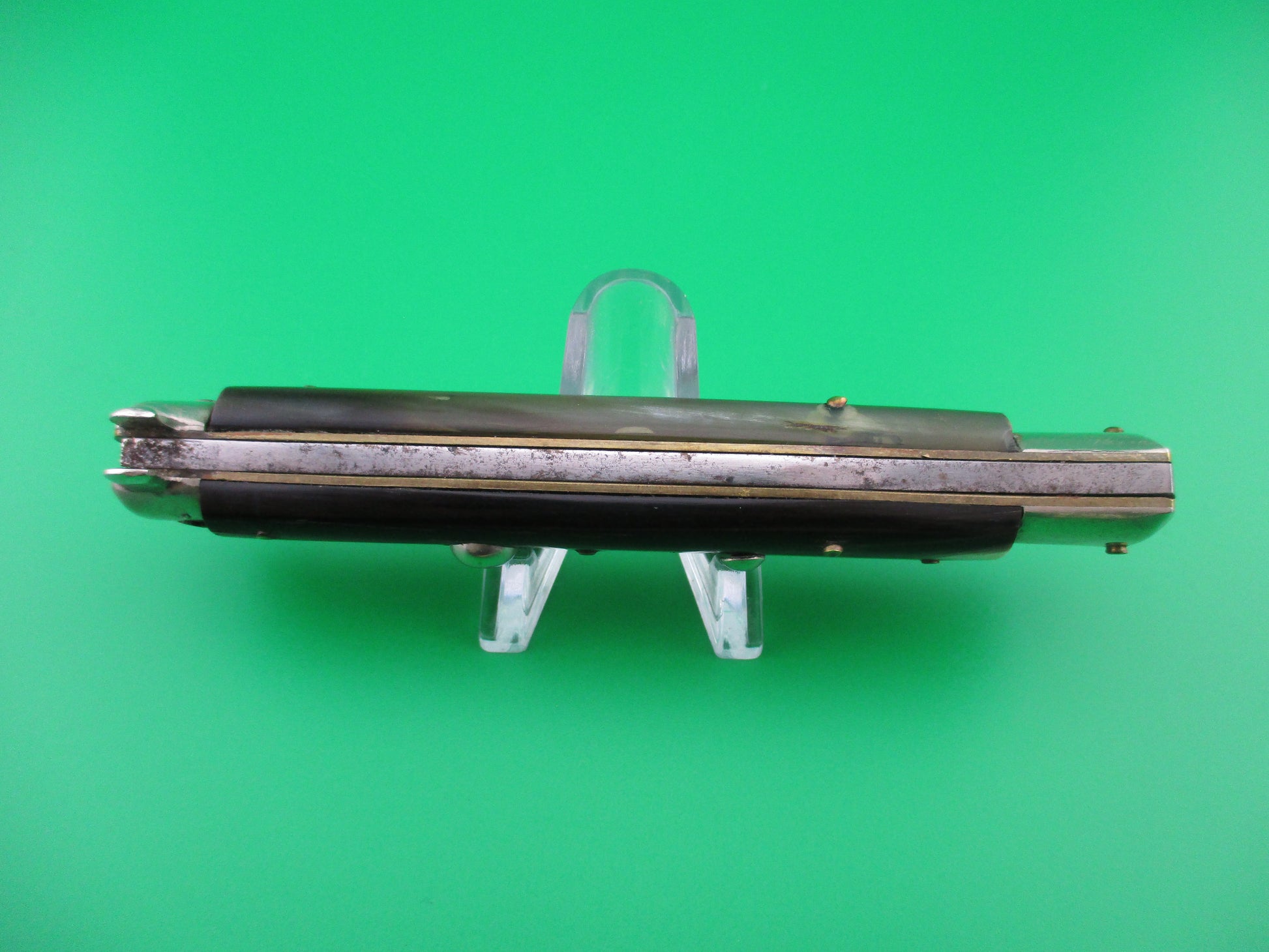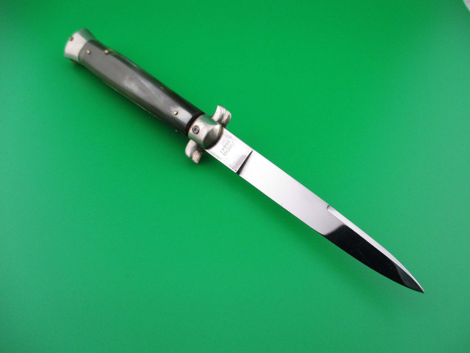 Hard to find Derby Bolster 1960s vintage Italian BoBc automatic knife. The knife measures 22cm (just under 9 inches) open with brass liners and nickel silver bolsters, button and safety cap. The flat grind swedge blade is full with original factory finish and is marked INOX in a circle on the front and PATENT 96847 on the rear ricasso with a few light scratches and scuffs. The horn scales are in nice condition with no bug bites or cracks. The front scale is mostly dark with some tan and cream streaks while the back scale is translucent green with some cream streaks. The knife works well with the blade tip seated below the liners closed, good snap and good lockup. Safety works. EX+ condition.