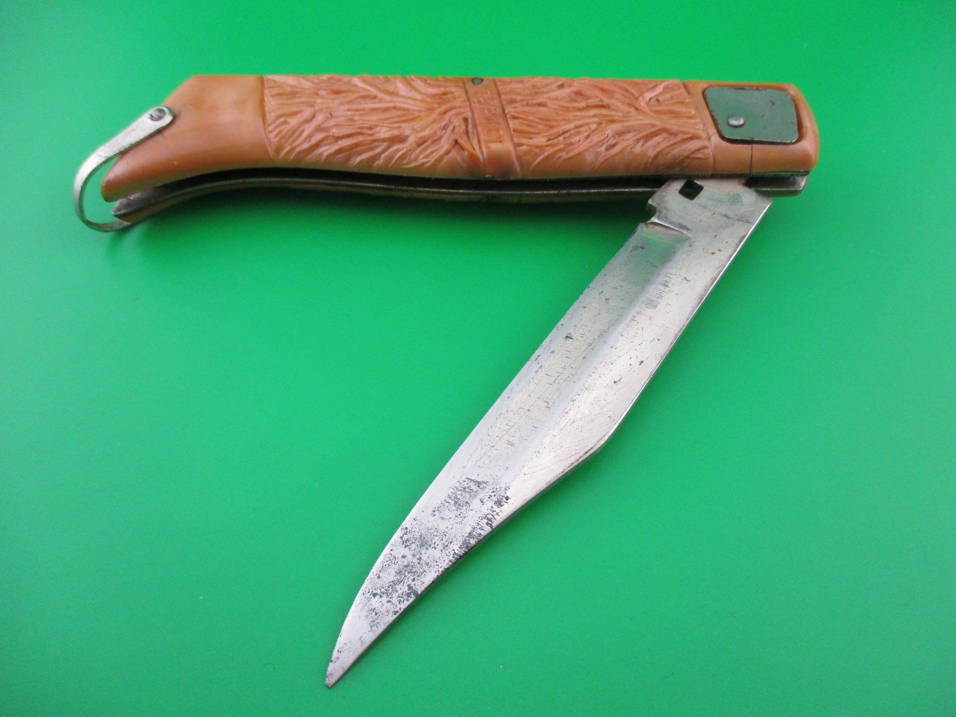 Vintage Russian tourist switchblade knife. These knives were made to be souvenirs for visitors to Russia in the 70s. This knife measures 24cm (9 3/8 inches) open with a coined steel liners. The scales are plastic with a hoof on the back and a lanyard ring. I believe that it's supposed to resemble an animal's leg with a pattern and a band with a word in Russian that I believe translates to Tourist. The carbon steel clip blade appears to be full and has some of the original finish with patina, scratches and some pitting with no markings. The knife works well with the blade tip seating deep in the well when closed, smooth snap and fair lockup when open. There is some movement each way at the tip, but springs back. It is button open backspring release to close. Very cool vintage Russian RPK tourist switchblade.