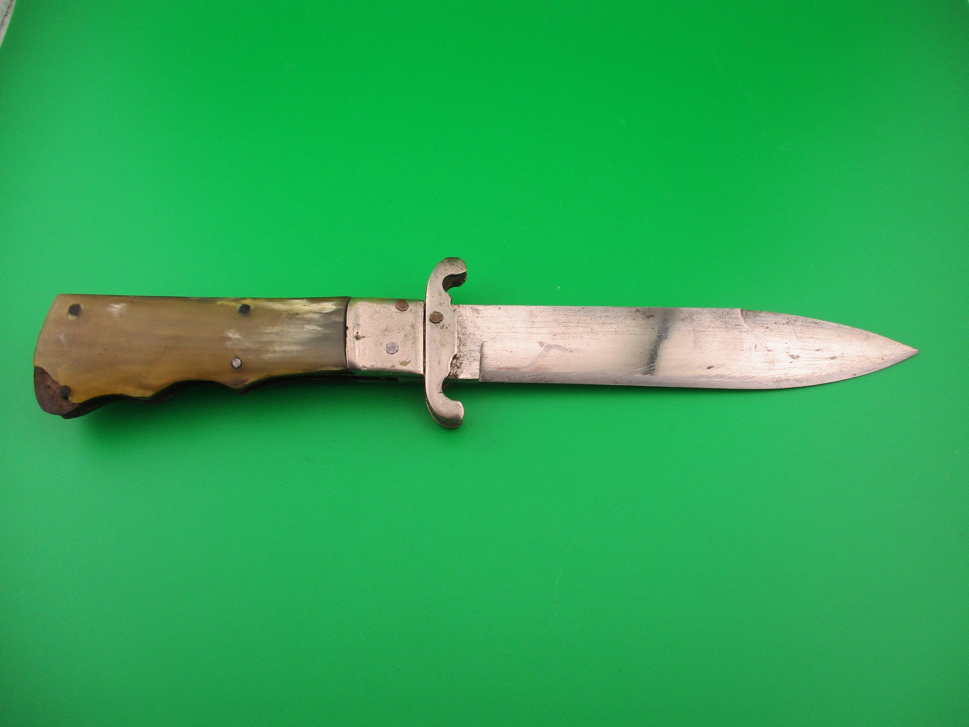Vintage Spanish Pig Sticker Automatic BoBc sheath knife with folding guards made in Spain most likely in the 1960s or 70s. It measures 25.3cm (10 inches) open and 6.5 inches closed with steel liners and nickel silver plated bolsters, guards & button. The bayonet style spear point blade is nearly full with much of the original finish and lots of light scratches from sharpening/use with no maker's mark that I can see. Might have originally been lightly etched Toledo. The scales are Brazilian horn and in very good condition except for one missing chunk on the back scale near bottom. Scales range in color including Black, green, tan, honey & cream. The knife does open automatically thought it's a little slow opening and opens fully and locks open with about 1/4 inch up and down at the tip. The matching leather sheath is in fair condition and missing the strap with snap, but does have the belt loop. VG- condition.
