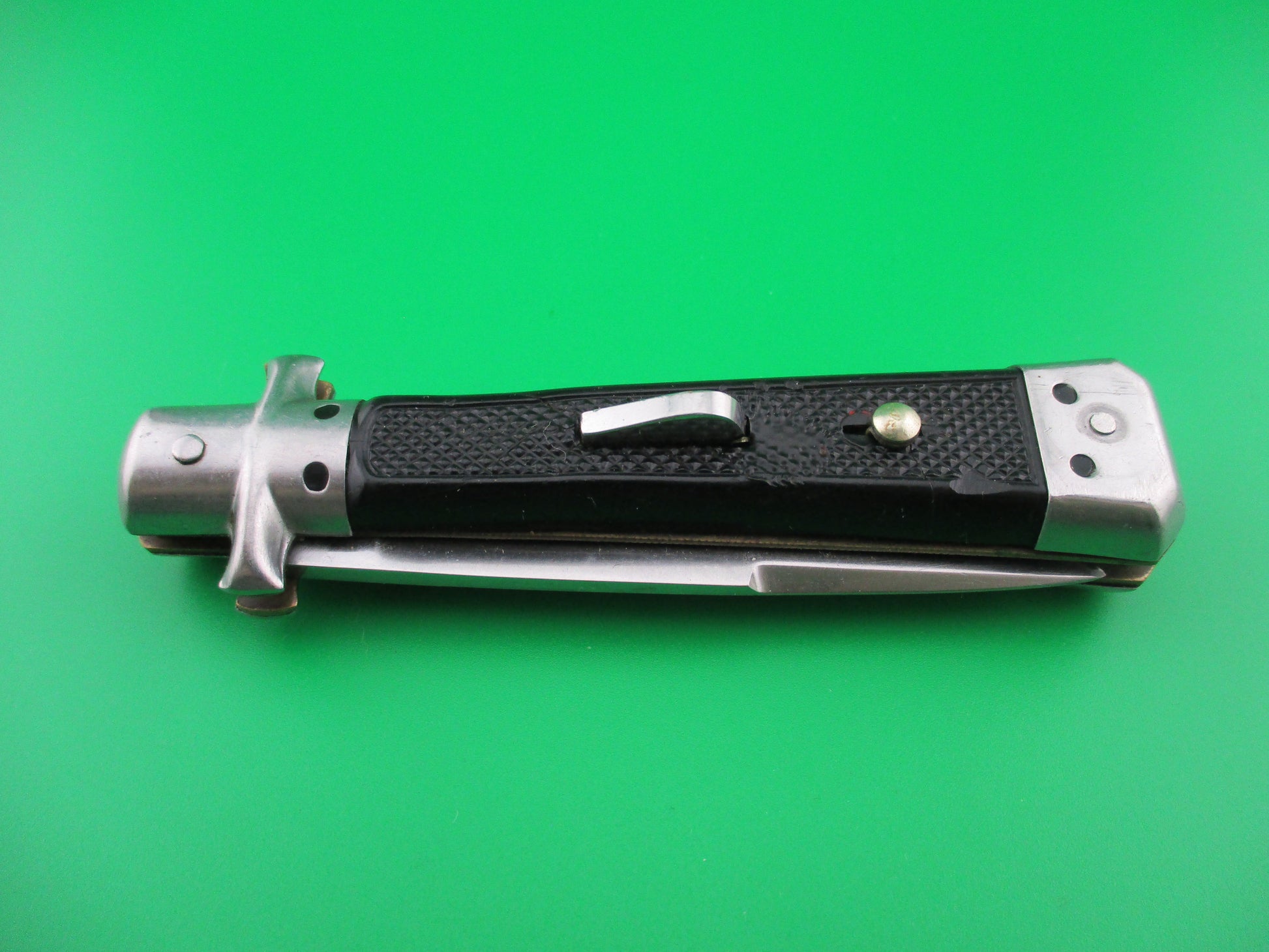Nice little French Bargeon with finger guards on the bolsters. The knife is marked BARGEON INOX and measures 18.5 cm open (7.25 inches) with brass liners. The flat grind swedge blade is mostly full and shiny. The black plastic scales are in good condition with no shrinkage, but there is a small "melted" area between the rectangular button and the safety. The knife functions well with the blade tip seating below the liners, good snap and good lockup. The safety works, but is a little loose. Nice old French switchblade.