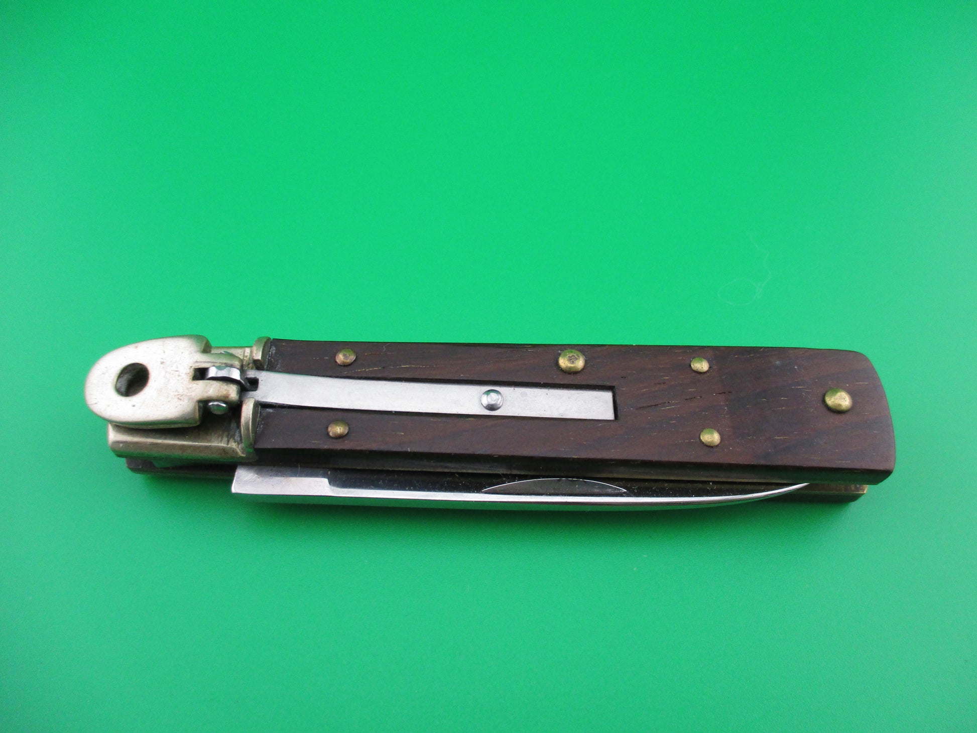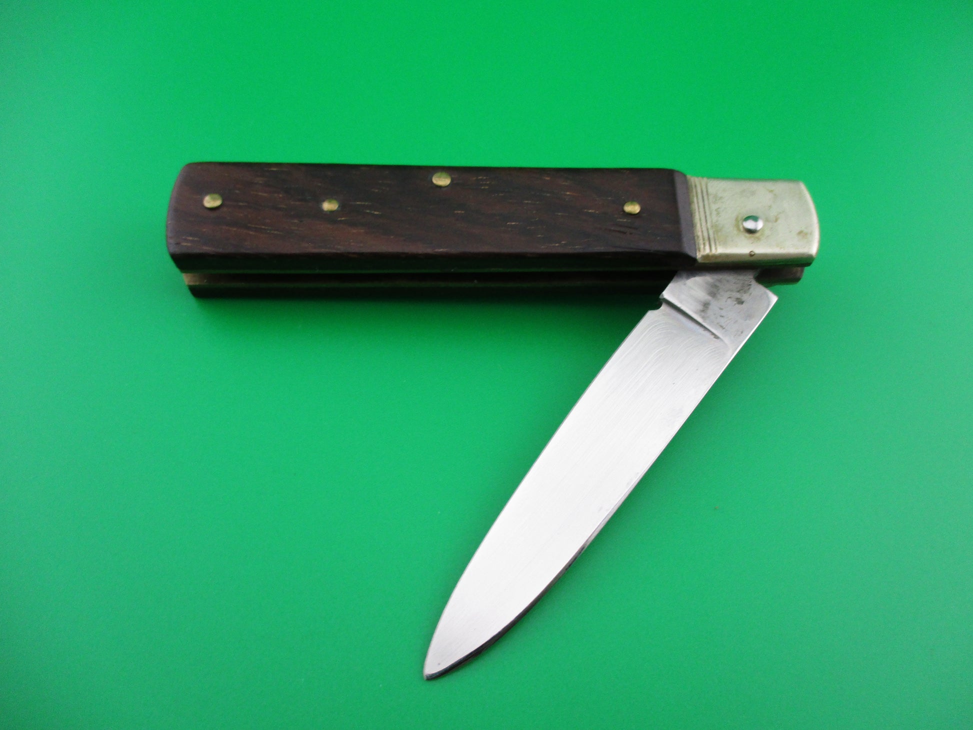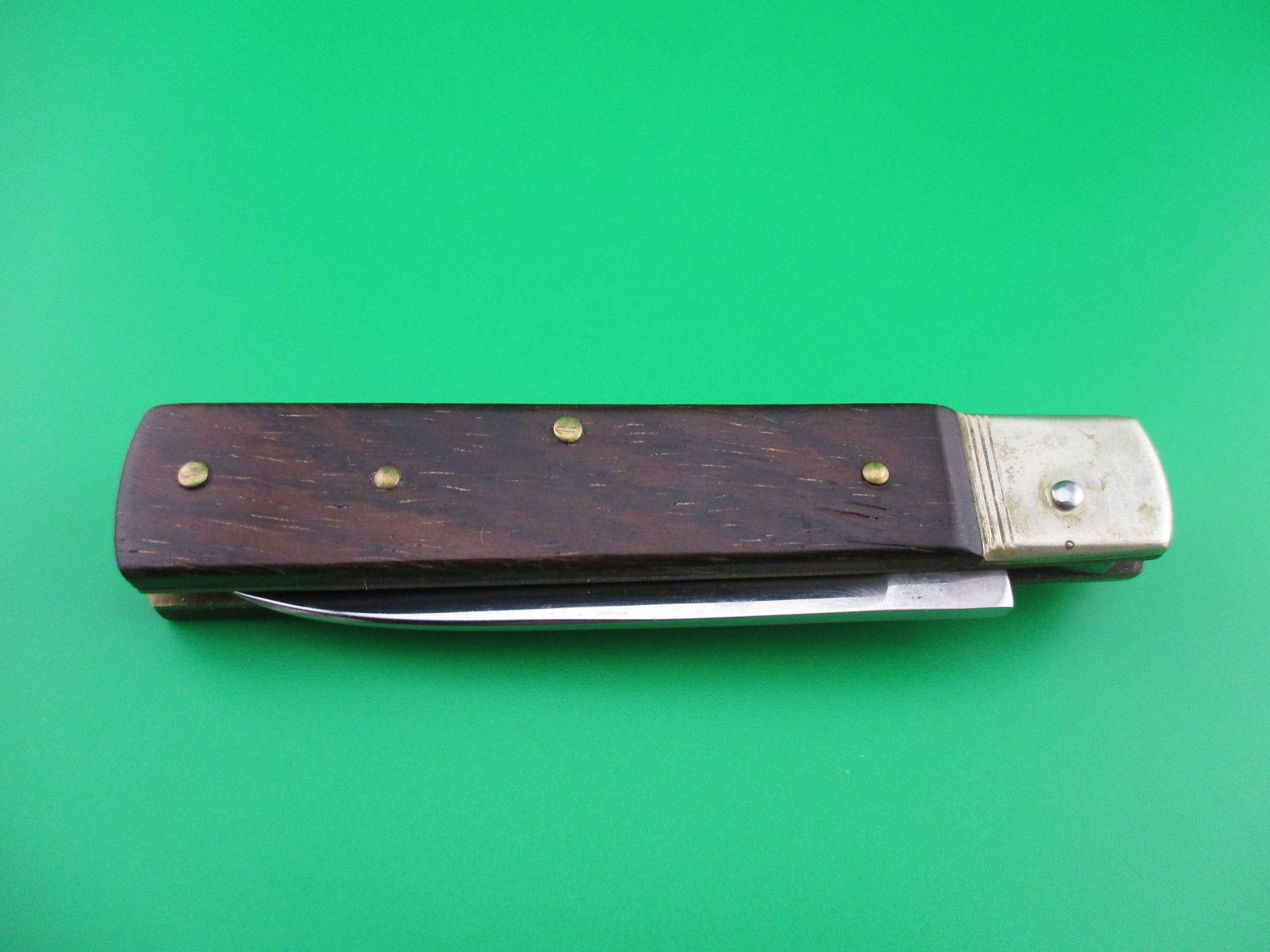 Hubertus short slimline lever knife with wood scales. This knife was made in Germany and the full blade is etched HUBERTUS SOLINGEN ROSTFREI GERMANY. It measures 3.75" (9cm) closed and 6 3/8" open with brass liners and German silver bolsters and lever. The blade does not appear to have ever been sharpened. The wood scales are in nice condition. The knife works great with the blade tip seating deep, good snap and tight lockup when open. Nice German lever 9cm switchblade knife.