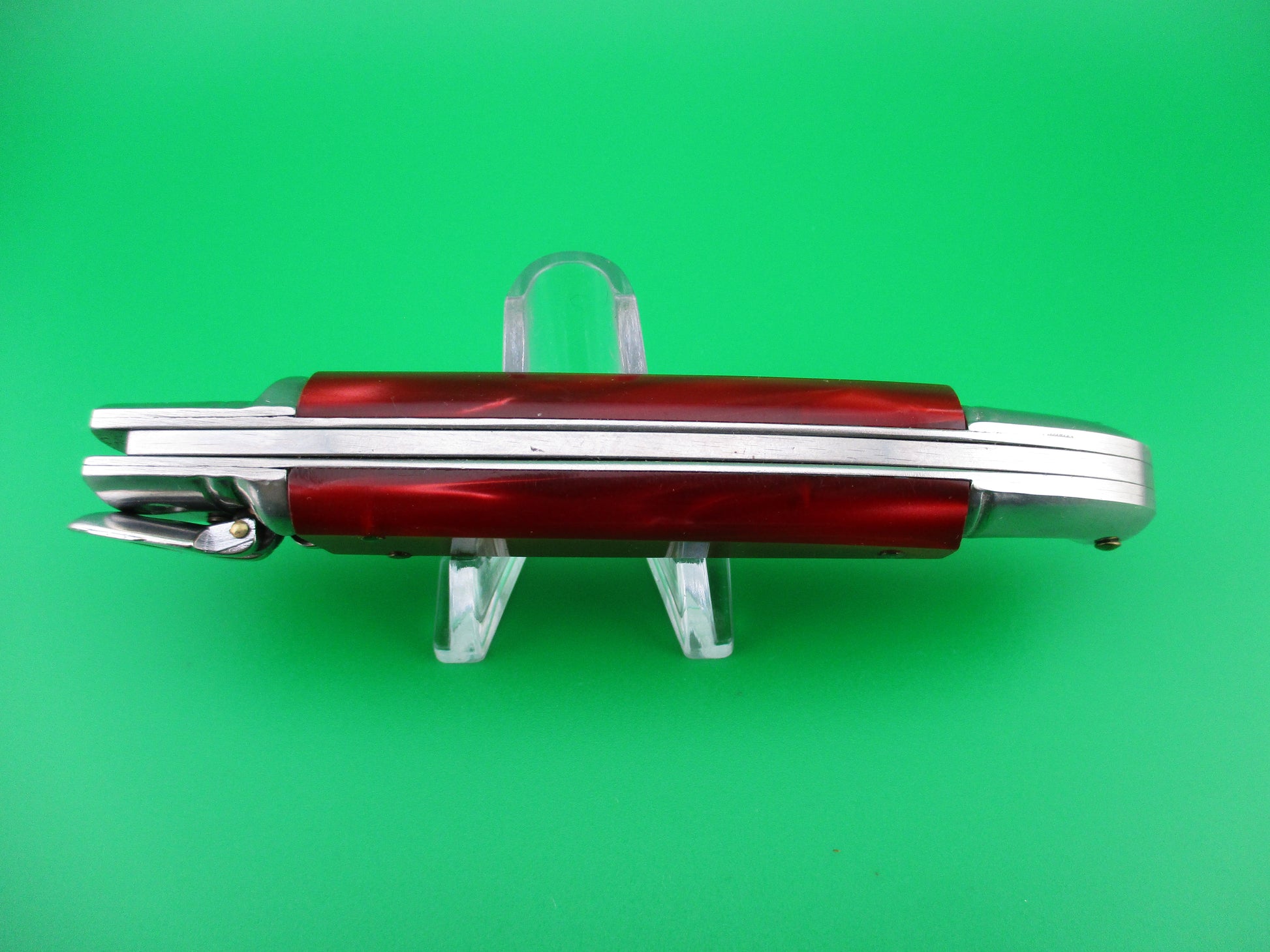 Vintage INOX 21cm Italian Birds head Lever Red pearlex automatic knife from 1980s or 90s. Measures 20.5cm (8 inches) open with stainless steel liners & bolsters and nickel silver lever. The bayonet style blade is 100% full and original finish with an engraved design and is stamped INOX. The scales (handles) are red pearlex and in Great condition. The knife works great with blade tip deep and centered, STRONG snap and TIGHT lockup! Like new condition.