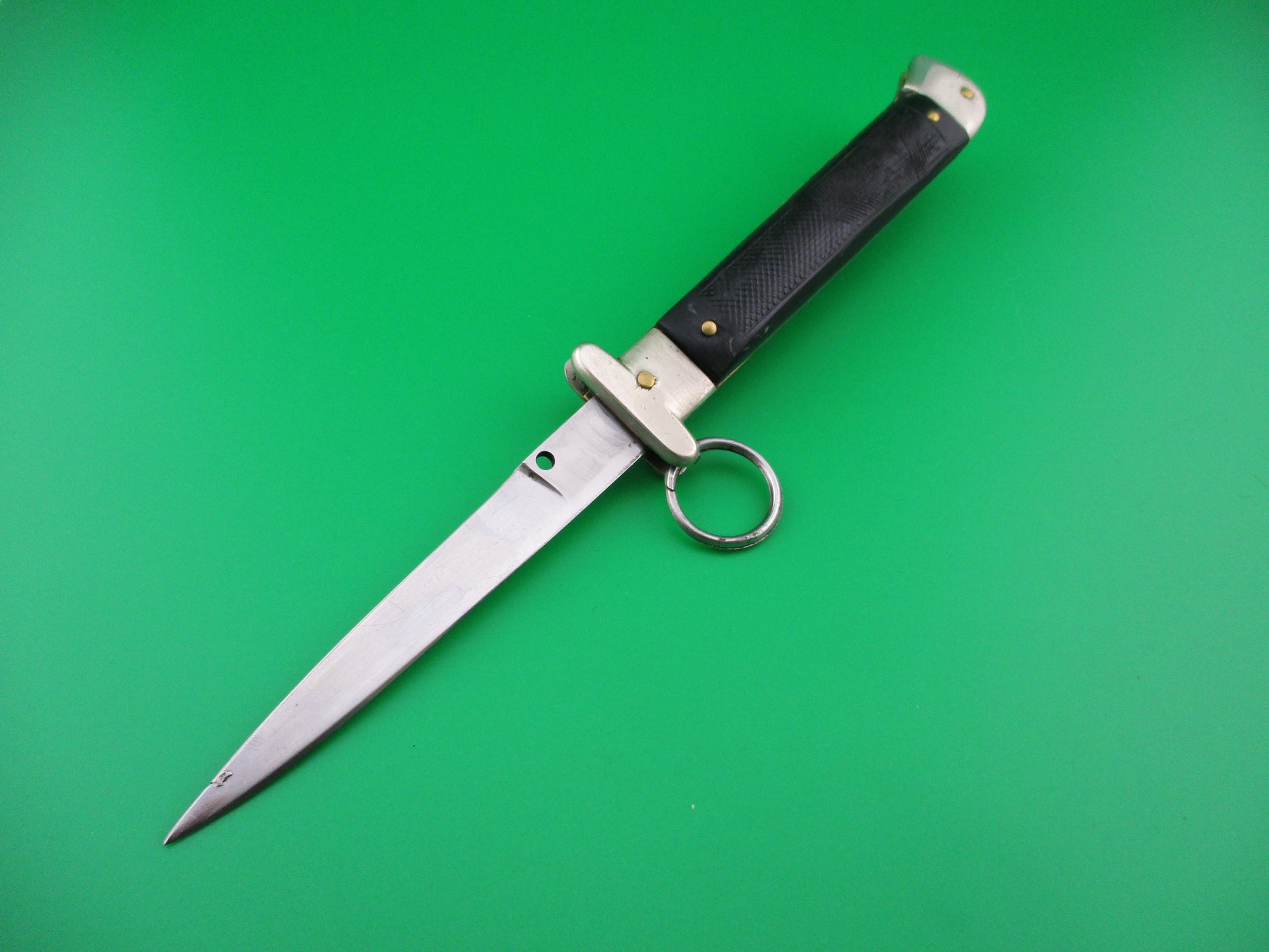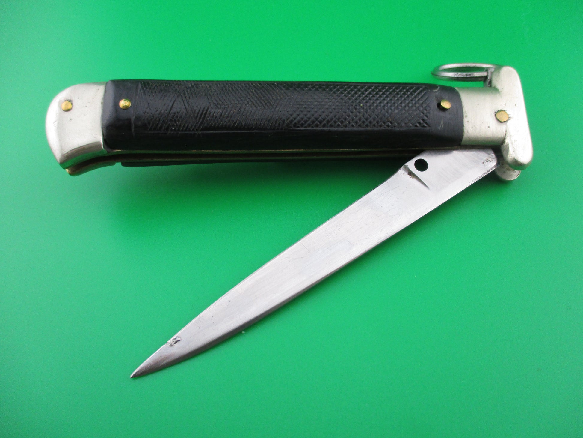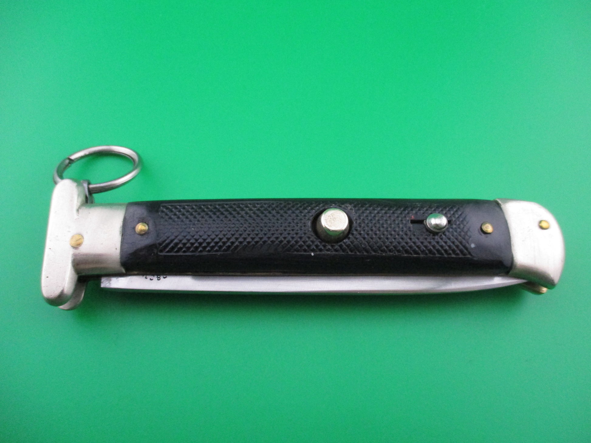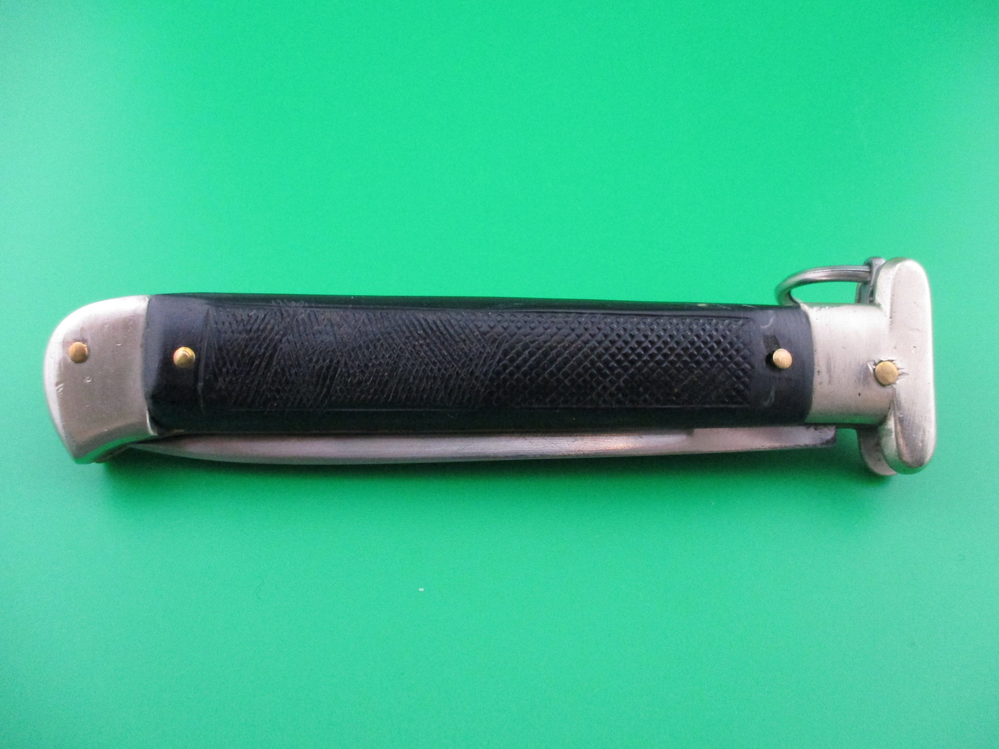 Nice old French ring pull release switchblade with worn red dot safety. This knife measures 22cm open (8 5/8 inches) and has brass liners and Nickel silver bolsters and button. The blade appears to be nearly full with lots of light scratches. The blade is marked CARTAILLR D&Co FRANCE LAME INOX. The black checkered scales are in fair condition with no cracks, but there is some shrinkage and someone tried to enhance the checkering on the back scale. The knife works well with the blade tip seated deep when closed, good snap and good lockup. Safety works. Good working model that would make a nice EDC (every day carry).