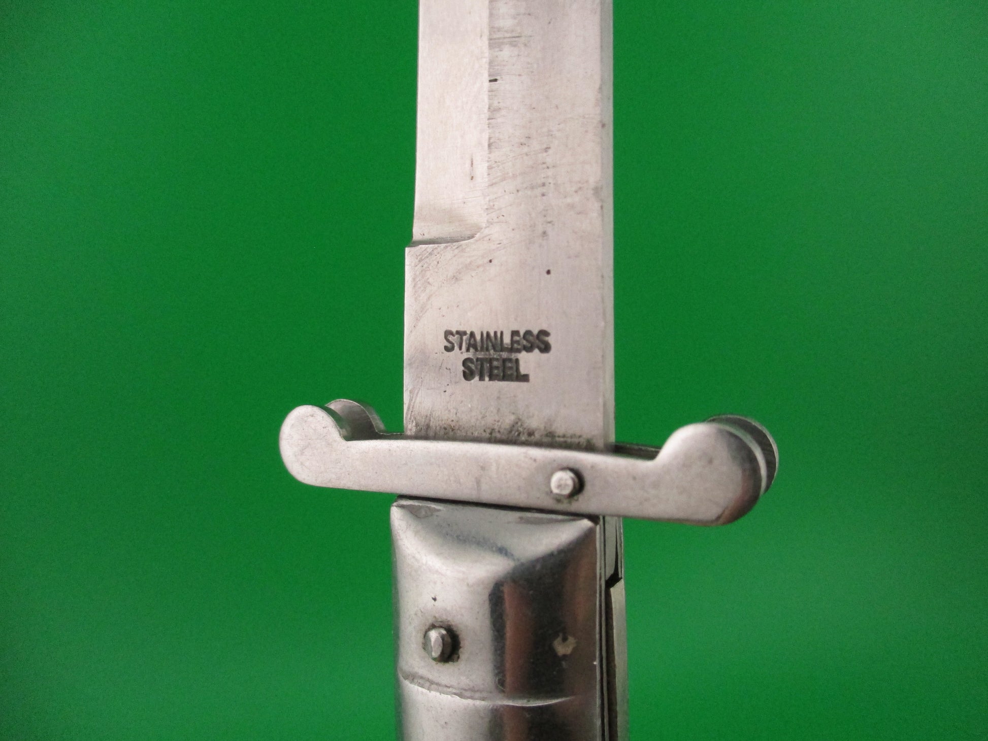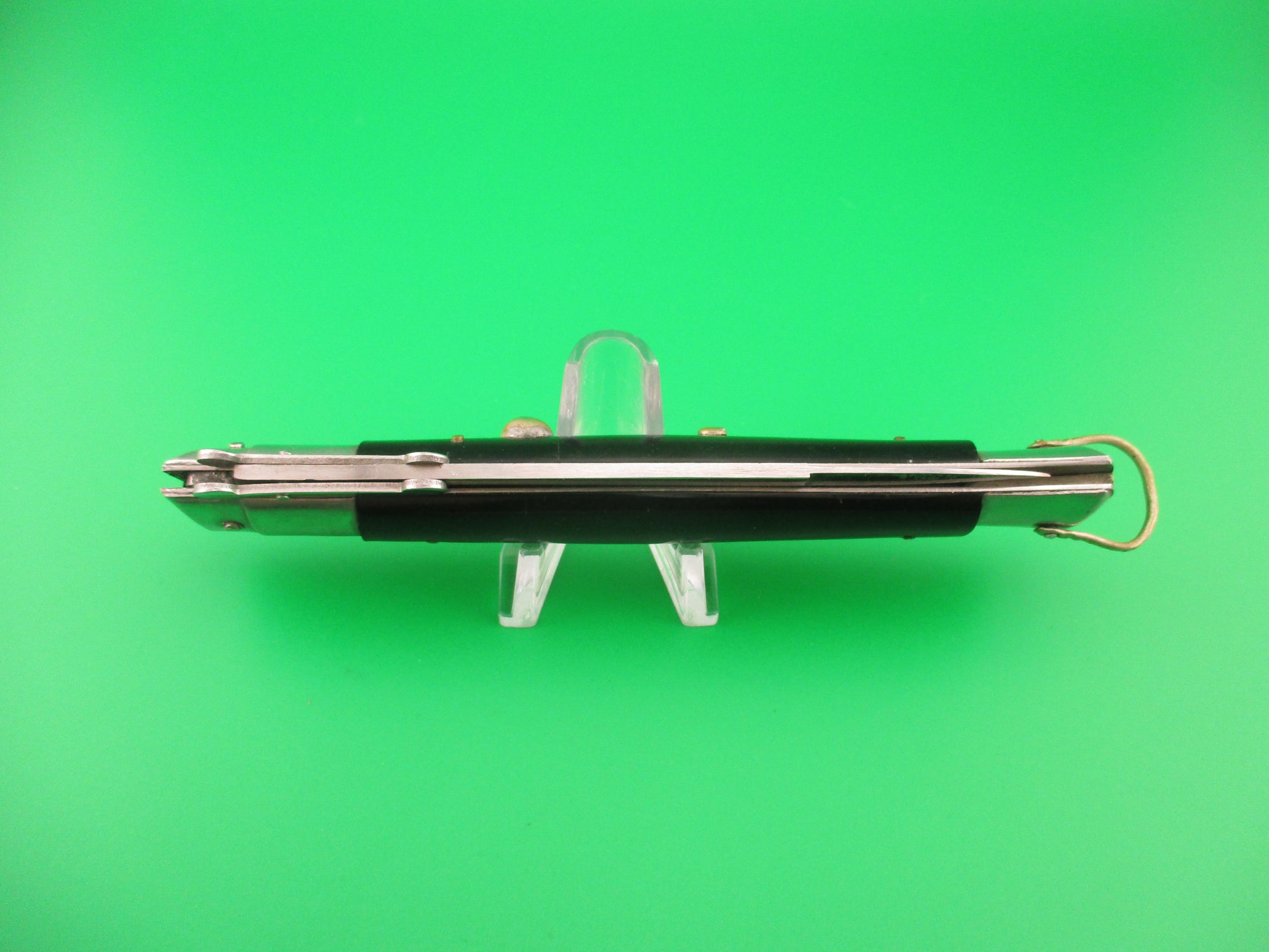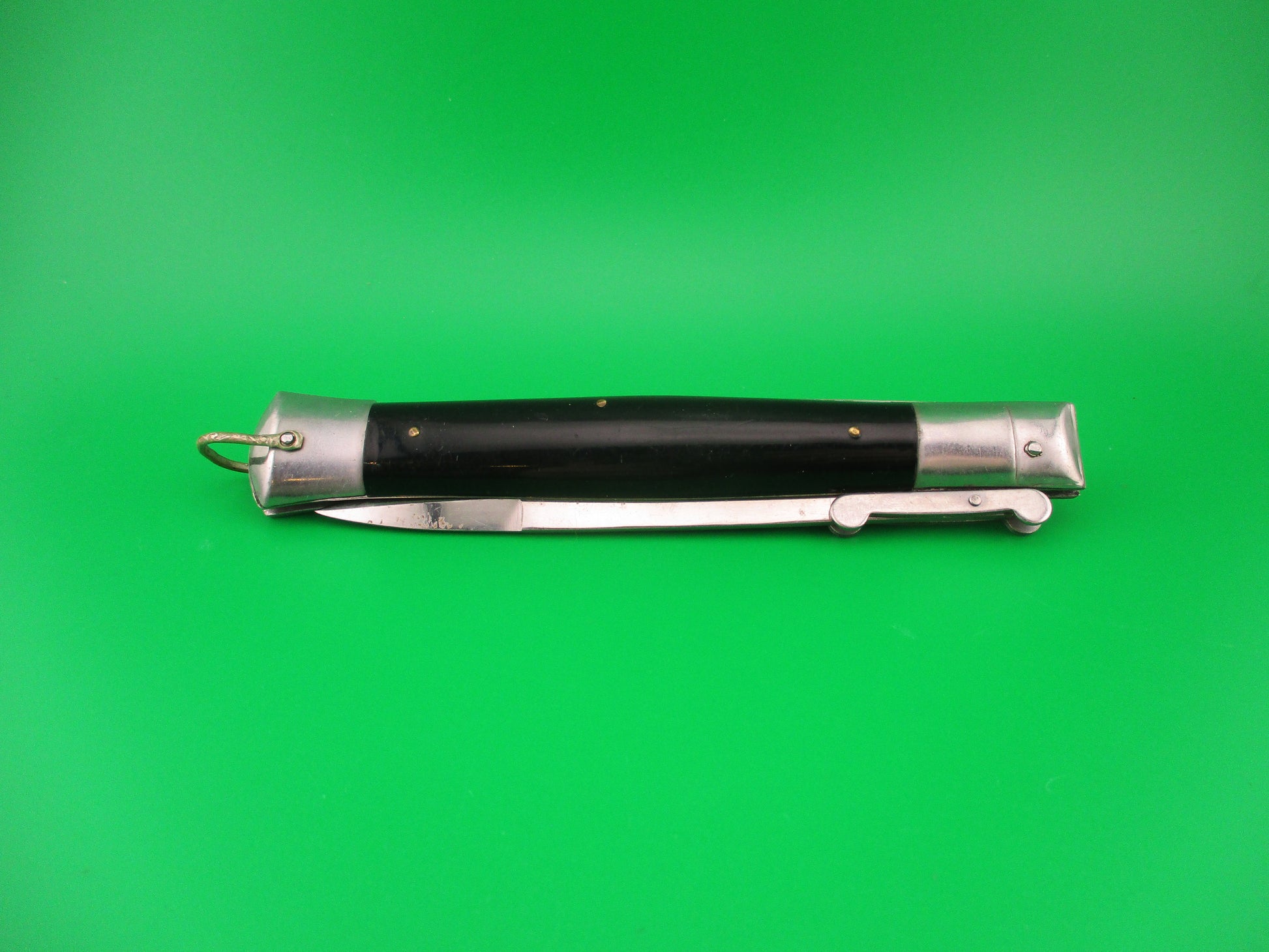 Vintage Rizzuto Estileto Milano 27cm Japanese Swing guard Step bolster Black vintage automatic knife with regular guards made in Japan in the 1960s. It measures 26.5cm (10 9/16 inches) open and 5.75 inches closed with steel liners, bolsters & guards, and nickel plated brass button and safety cap & nickel silver decorated lanyard ring. The bayonet style blade is 99% full or better with original factory finish, some light scratches and spotting and the ricasso is stamped STAINLESS STEEL and the face of the blade below the spine is stamped RIZZUTO ESTILETO MILANO. The black synthetic scales are in very good condition with slight shrinkage, light handling marks and are held on with 7 brass pins. The top (front) bolsters are called Step bolsters because they step down in size near the (top) front. The knife works well with blade tip just above the liners closed, strong snap and excellent lockup with less than 1/16" up and down at the tip, but springs back when you let go and stays open nicely. Does not rattle if shaken with blade open except the guards. Safety works. EX+ condition.