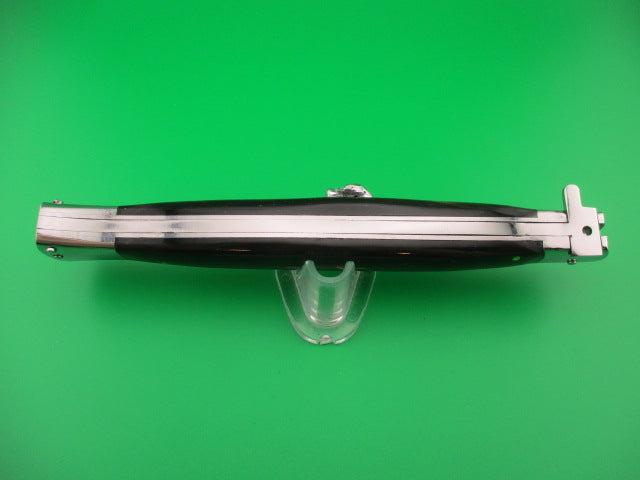 Custom 35cm Skull Button Wicked Stiletto Dagger Horn automatic knife by Orang Zaib. The knife measures just under 35cm (13.75 inches) open and 7 3/8 inches closed with steel liners & bolsters. The needle point dagger grind blade is gorgeous and 100% full with no markings. The genuine horn scales (handles) are thick and nice with Skull button. The spring looks a little crude if you look inside, but the strength is good. The knife works well with blade tip seating deep, good snap and very good lockup with less than 1/8 inch up and down at the tip. Does not rattle if shaken with blade open. To close the blade you lift on the tab by the top front bolster to release. Nearly new condition.
