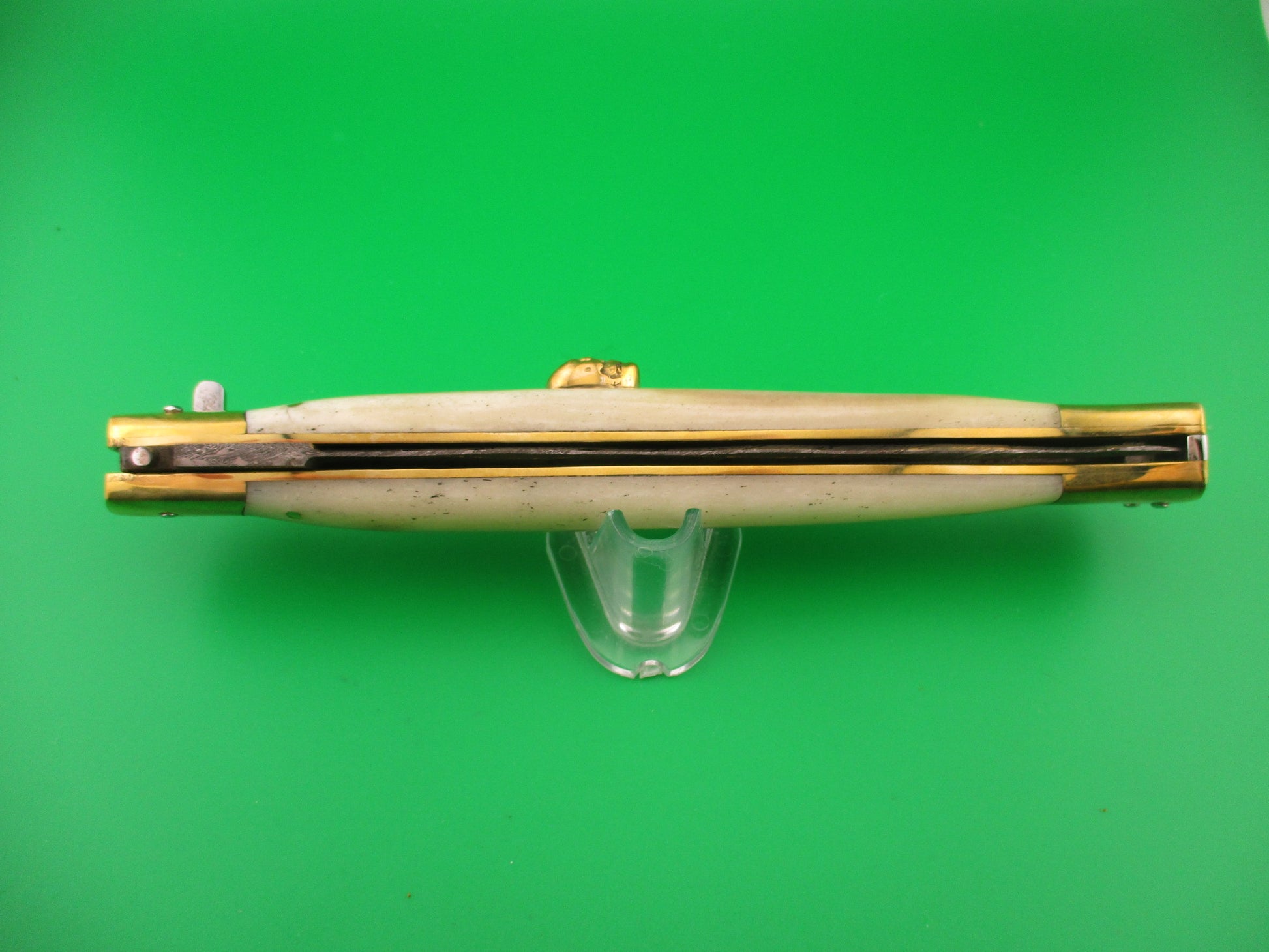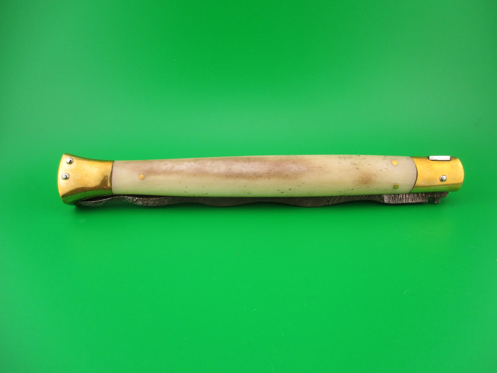 Custom 35cm Skull Button Wicked Stiletto Dagger light smooth Bone automatic knife by Orang Zaib. The knife measures just under 35cm (13.75 inches) open and 7 3/8 inches closed with brass liners & bolsters. The needle point Kris Damascus blade is gorgeous and 100% full with no markings. The genuine smooth bone scales (handles) are thick and nice with a brass Skull button. The spring looks a little crude if you look inside, but the strength is good. The knife works well with blade tip seating deep, good snap and very good lockup with just ahint of movement at the tip. Does not rattle if shaken with blade open. To close the blade you lift on the tab by the top front bolster to release. Nearly new condition.