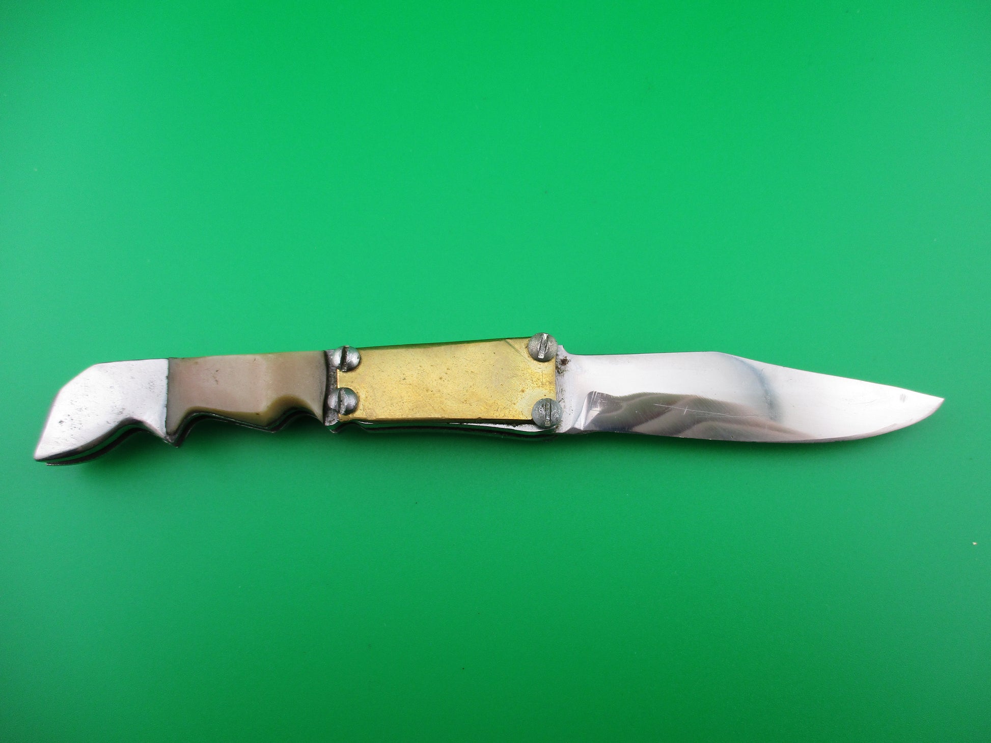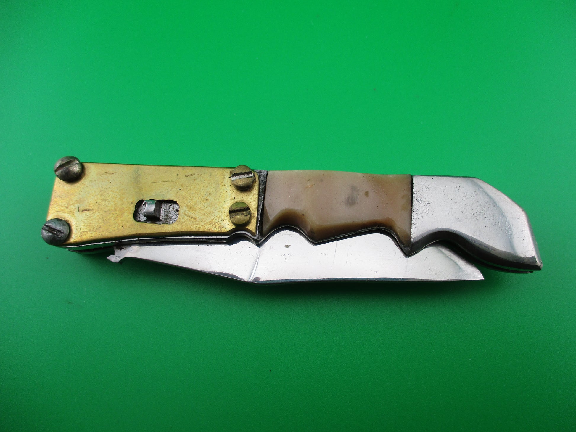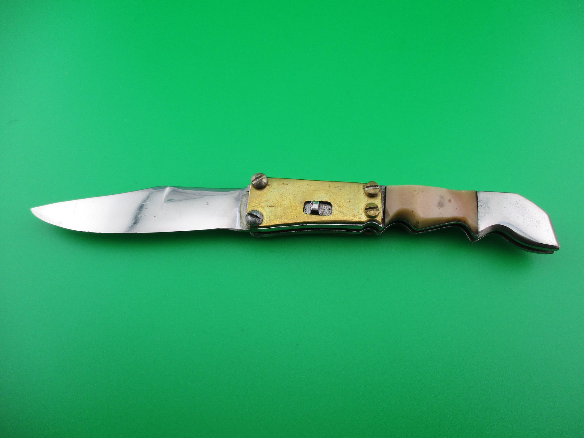 RPK Russian Prison Knife Vintage switchblade knife. These knives were made by inmates of Russian prisons back in the 1960s and 70s to be sold to raise capital for the prisons. They are all hand made and very unique pieces of Russian cutlery Folk Art. This knife measures 16.5cm (6.5 inches) open with a steel frame, button and bottom bolsters and brass cover plates. The blade is nearly full and has all of the original finish with some light scratches and no markings. The scale inserts are tan synthetic and are in nice condition. The knife works well with the blade tip seating about 1/8" above the liners when closed, smooth strong snap and locks open with nearly 1/4" movement, but springs back when you let go of the tip. Does not rattle if shaken when open. The blade is activated by sliding the knob and is closed the same way. Cool vintage Russian RPK switchblade. VG condition.