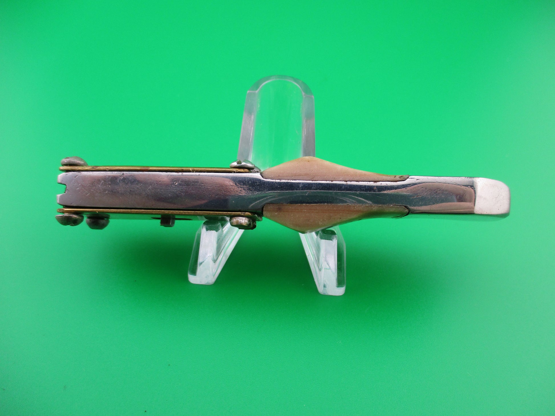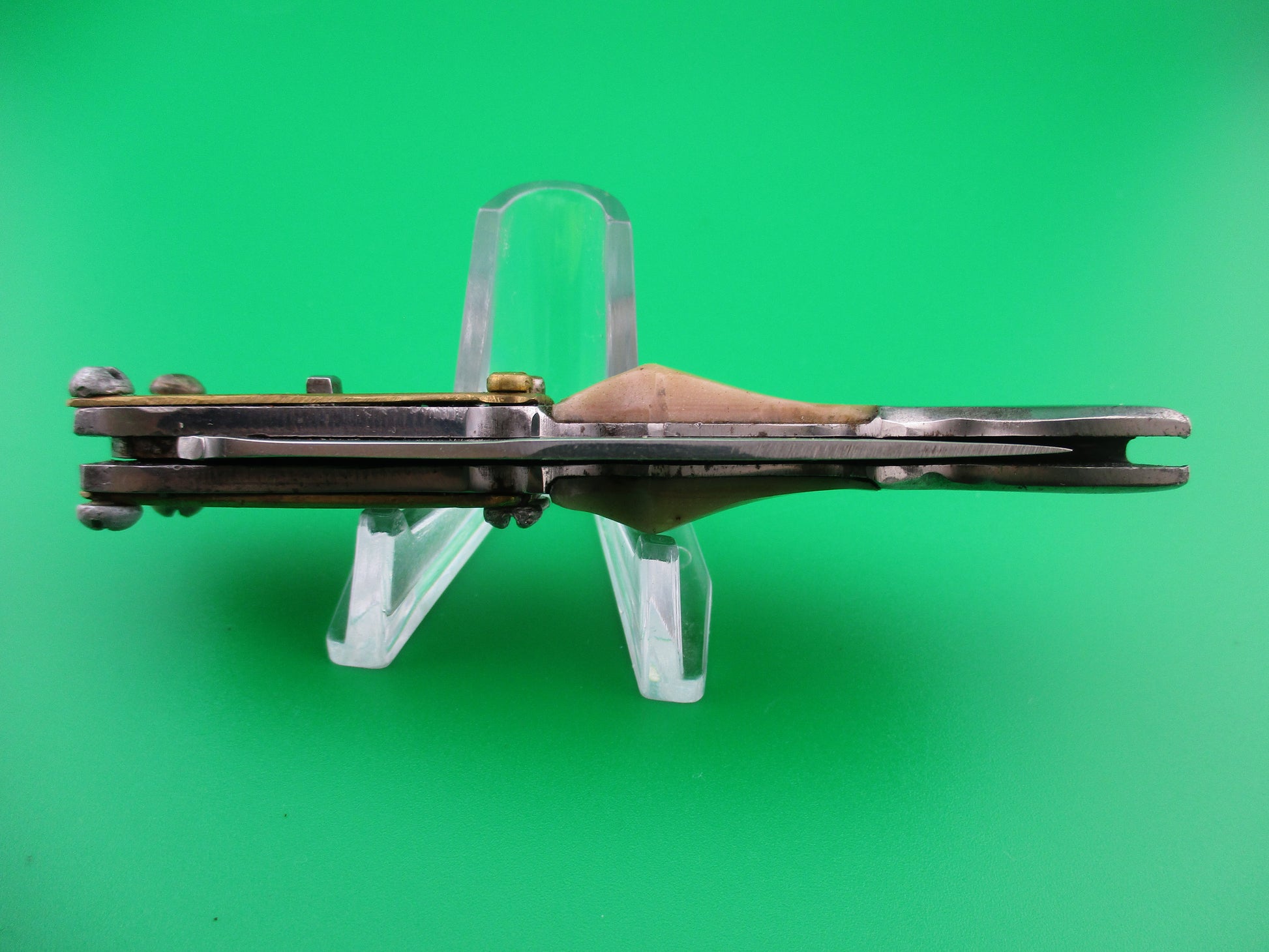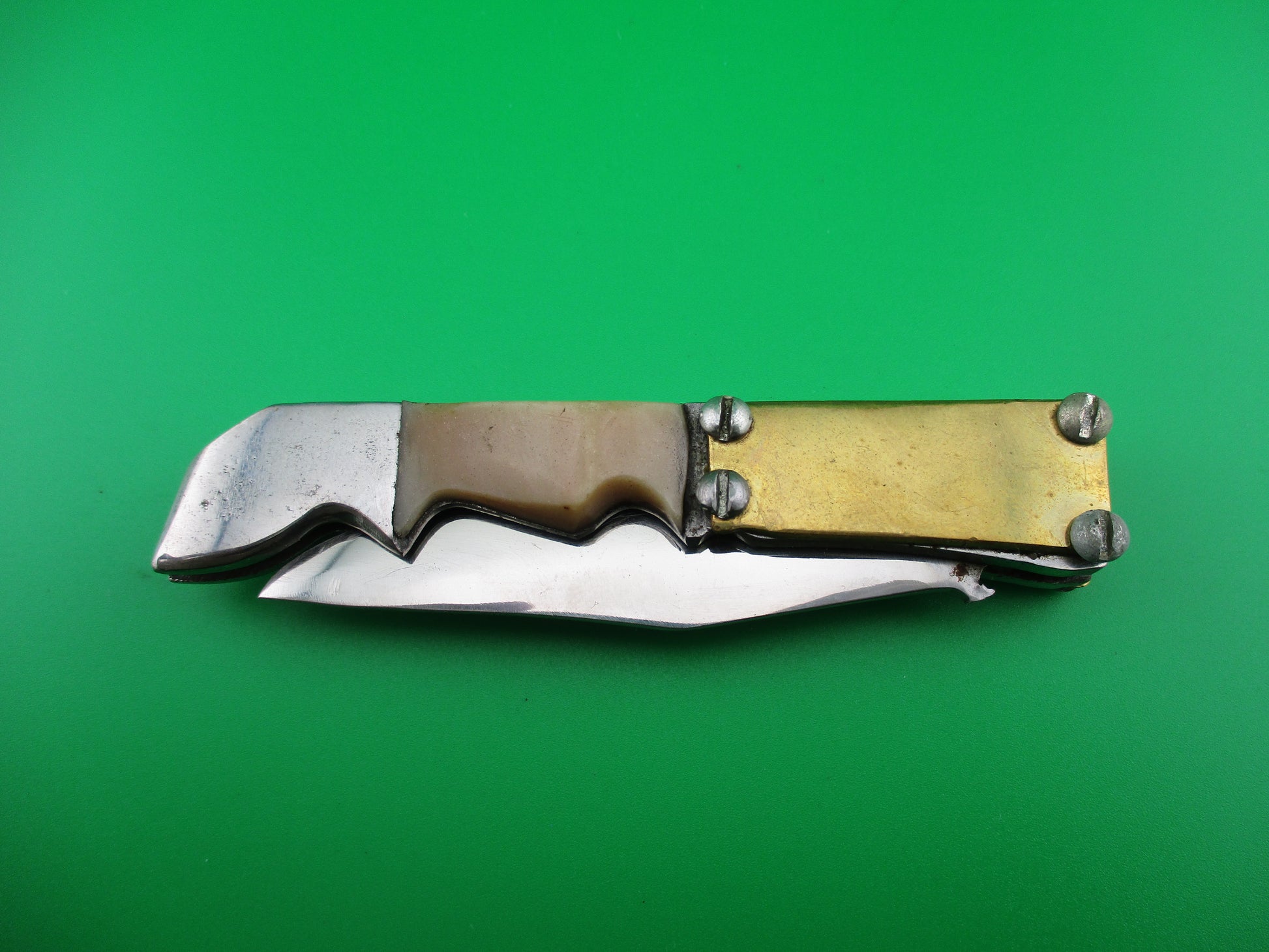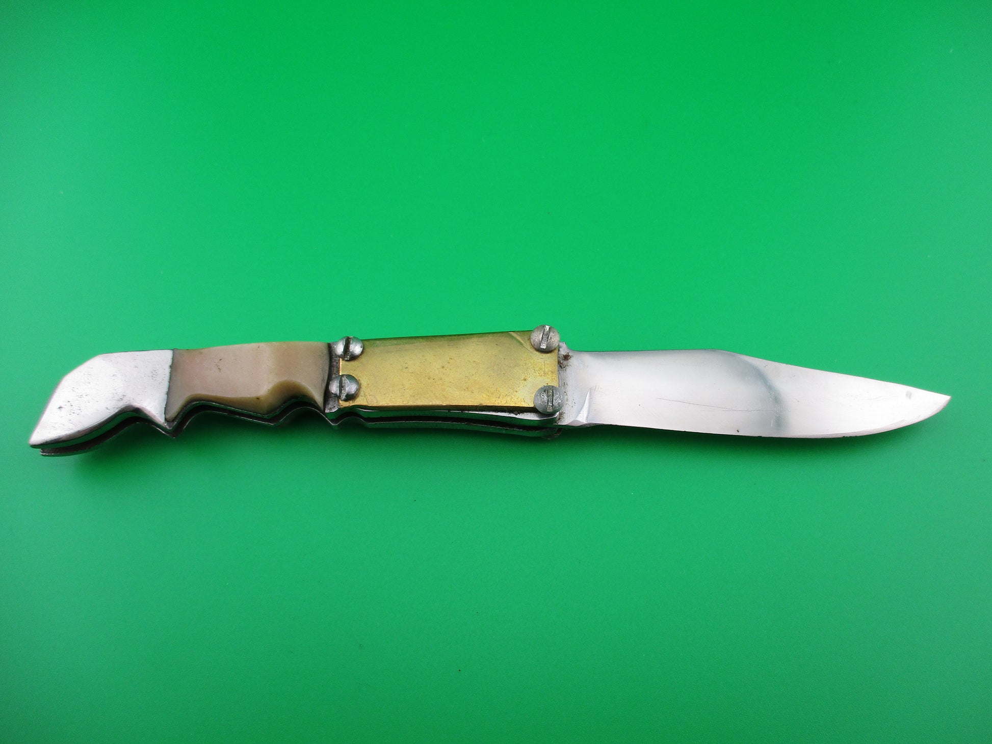 RPK Russian Prison Knife Vintage switchblade knife. These knives were made by inmates of Russian prisons back in the 1960s and 70s to be sold to raise capital for the prisons. They are all hand made and very unique pieces of Russian cutlery Folk Art. This knife measures 16.5cm (6.5 inches) open with a steel frame, button and bottom bolsters and brass cover plates. The blade is nearly full and has all of the original finish with some light scratches and no markings. The scale inserts are tan synthetic and are in nice condition. The knife works well with the blade tip seating about 1/8" above the liners when closed, smooth strong snap and locks open with nearly 1/4" movement, but springs back when you let go of the tip. Does not rattle if shaken when open. The blade is activated by sliding the knob and is closed the same way. Cool vintage Russian RPK switchblade. VG condition.