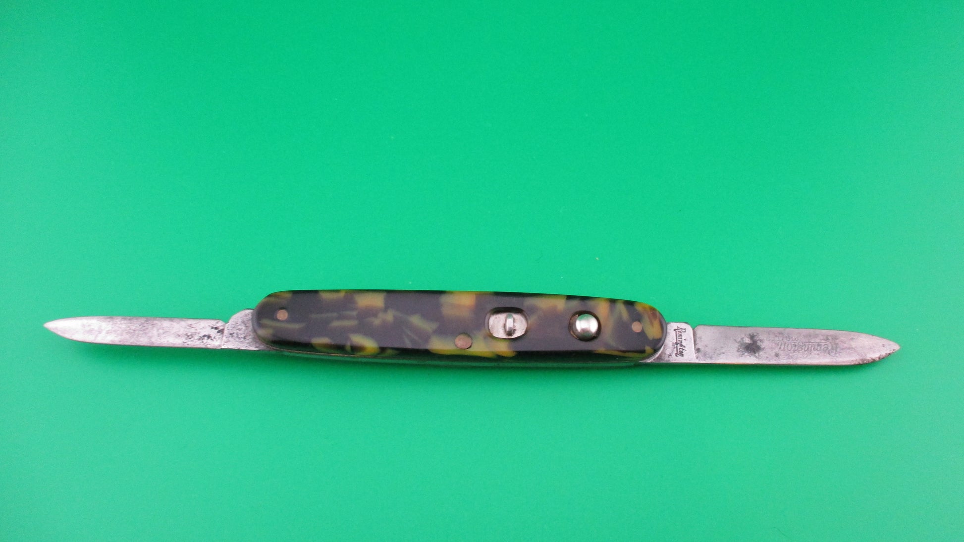 Remington R8065 double switchblade made by the Geo Schrade Knife Co of Bridgeport, CT most likely between 1938 and 1943. The knife measures 3 3/8 inches closed and 7 1/8 inches with both blades open and has brass liners and nickel silver buttons & safeties. Both blades stamped Remington on the front tang & big blade stamped R8065 on the rear. Blades are both mostly full (90-94%) still has most of the Remington Master Knife etch on the front of the big blade under heavy patina with some spotting and pitting, mainly on the small (pen) blade. The scales are not original, but pretty well done black & yellow/green synthetic in good condition. The knife works well with both blades seating with tips even, or a hair above the liners, good snap and good lockup and no kickback (where blade opens too fast for lock to catch and bounces back). Small blade has a little more up an down at the tip and a little side to side and rattles if shaken open. Both safeties work. G condition.