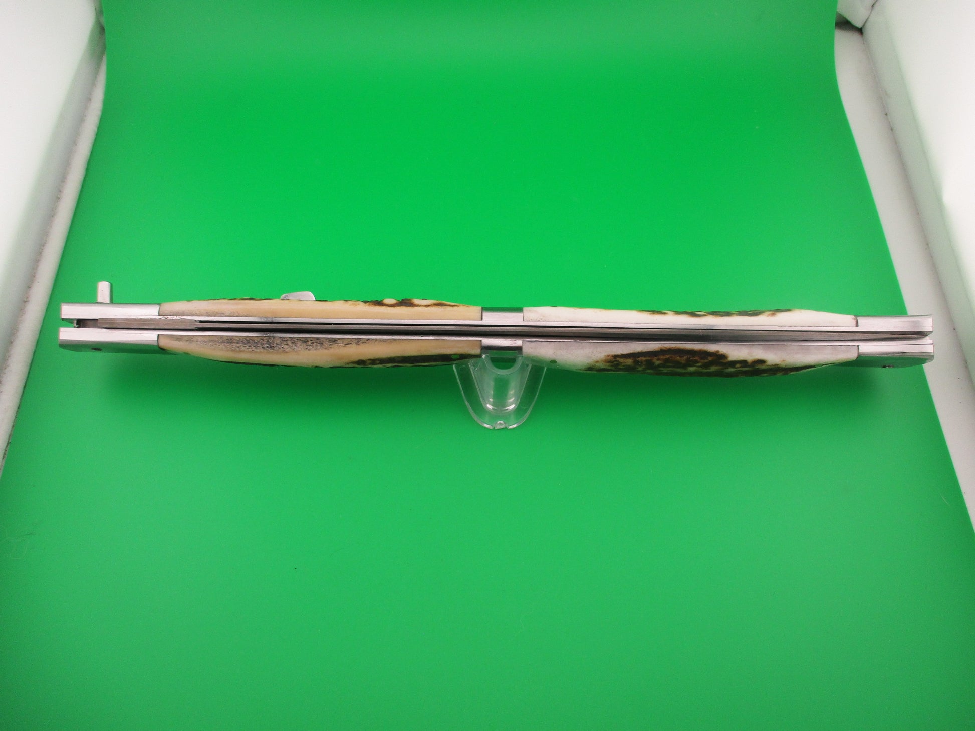 Custom 61cm Italian style Prioletta inspired Monster Damascus & Stag Automatic knife by Samir Ahmad. This knife measures a whopping 61.2cm (24 1/8 inches) open and weighs in at 580 grams (1.2 pounds)! It has steel liners bolsters and rectangular button. The Damascus Dagger grind blade is 100% full and has original SHARP edge. Really nice hand made Damascus steel. The genuine Stag scales are very attractive and in great condition and separated in the middle on each side by a 5/8" wide metal band. The knife functions perfectly with the blade tip below liners and centered, opens fully with a lout "THWACK" and locks up tight! This knife is an EXPERIENCE to open and fun to Play with, but be careful because it's really sharp. It really is a MONSTER! Great wall hanger. Made by master cutler Samir Ahmad. New condition.