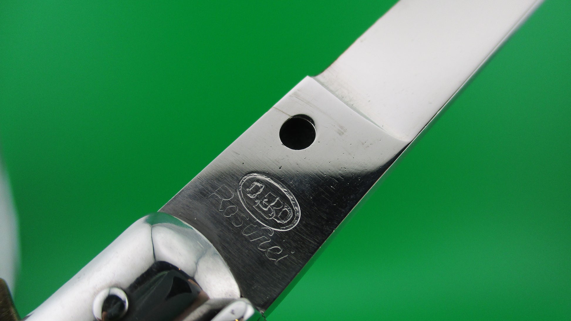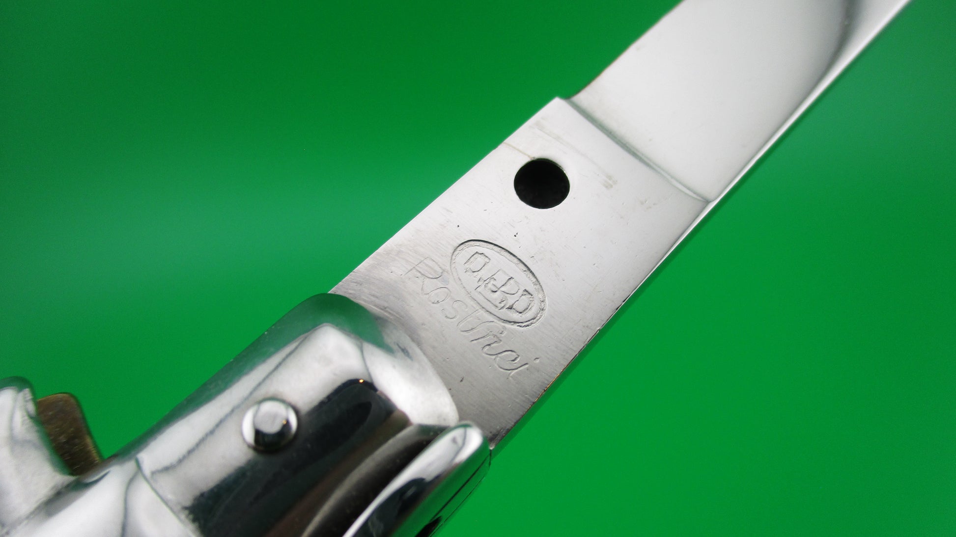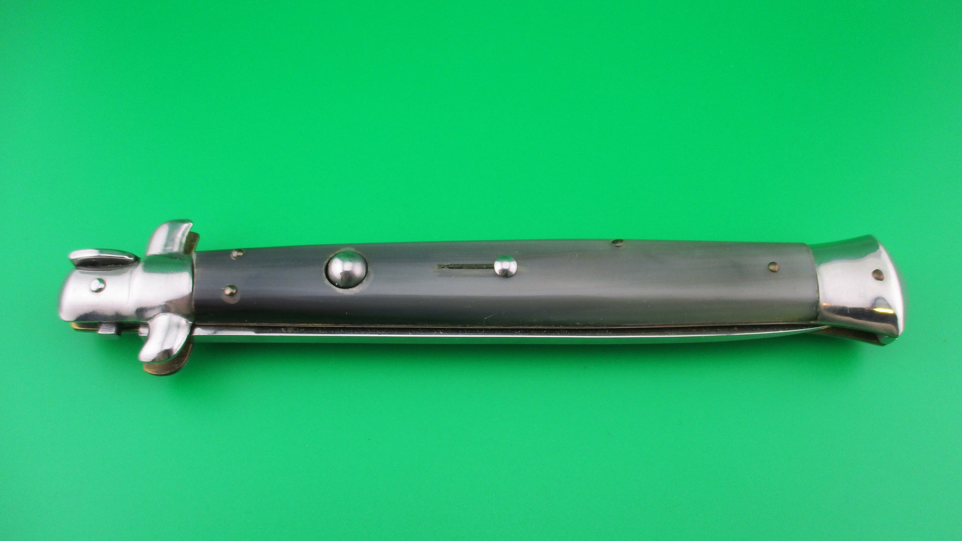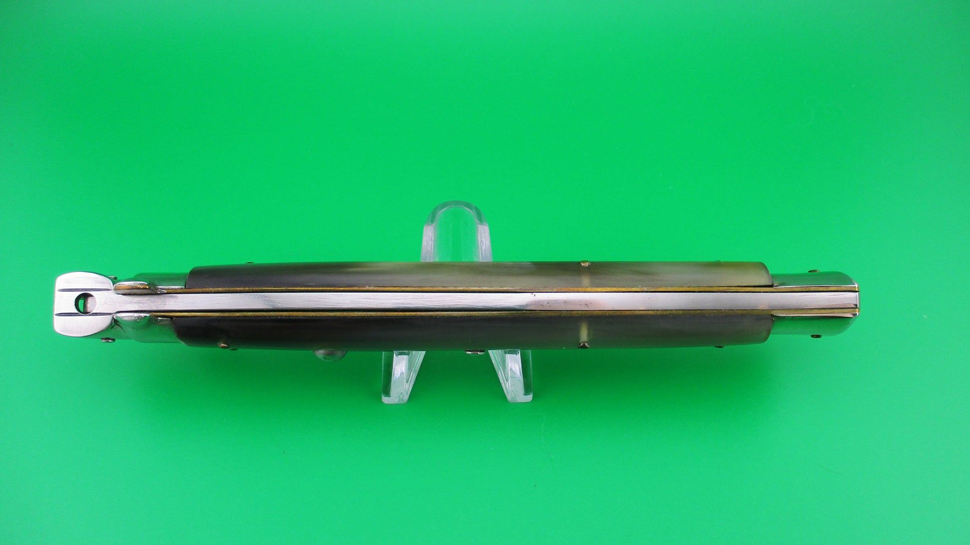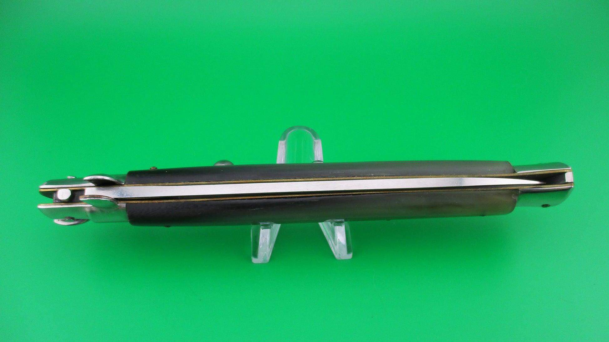 Vintage 1960s Italian transitional stiletto marked Rostfrei and QJD in a circle on the front tang. The QJD is the mark of a French importer who purchased the knives from Italy to be sold in France. The knife measures 33.2cm (13 1/16 inches) open with brass liners & pins, steel front top bolster, button & safety and 3 nickel silver bolsters including top rear which has brass lined guards. Flat grind blade is full with original factory finish with some light scratches and is stamped QJD in a circle over Rostfrei. The horn scales are very in nice condition and are semi translucent green with a little streaking. The knife works great with blade tip seating deep and centered, strong snap and tight lockup. Nice old Italian transitional made for the French market. Safety works. Nearly new condition.