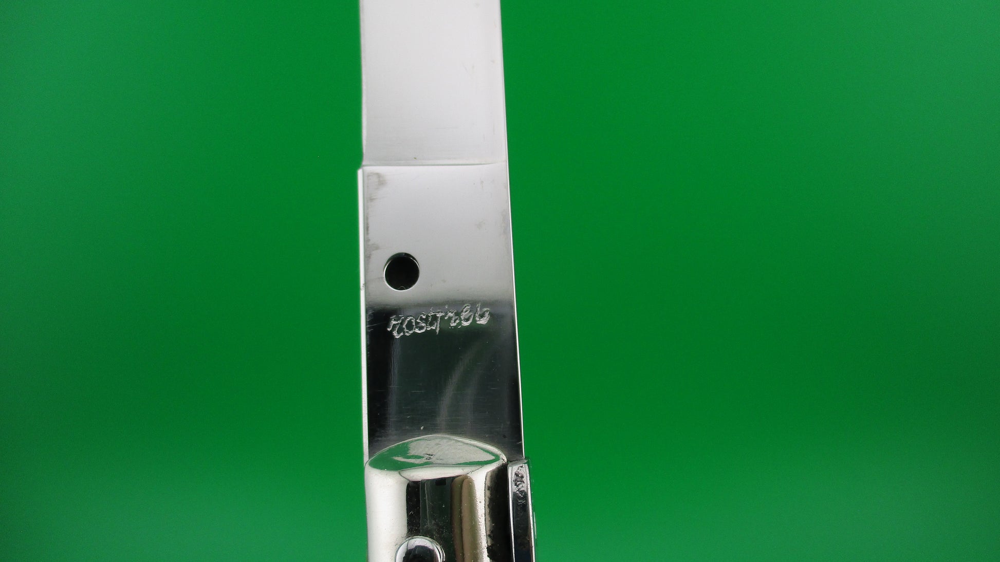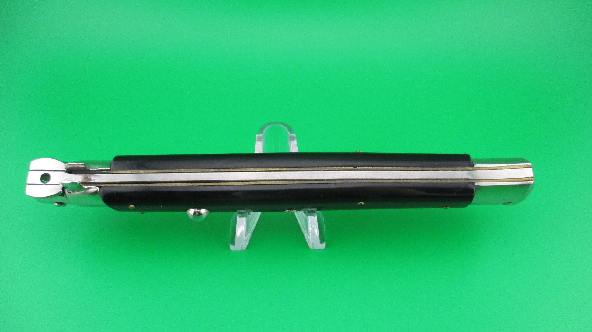 Vintage rostfrei (slant) 33cm Italian Stiletto Black Swivel bolster automatic knife measures 33.2cm (13 1/16 inches) open with brass liners and steel bolsters & button and nickel silver safety cap. The flat grind blade is full with original factory finish and has an unusual rostfrei stamp diagonally (slant) on the ricasso with lower case "r" (nearly always capital R). The black scales are in very nice condition with some light handling marks. Knife works great with blade tip below liners closed, strong snap and TIGHT lockup open! Safety works. Nearly new condition.