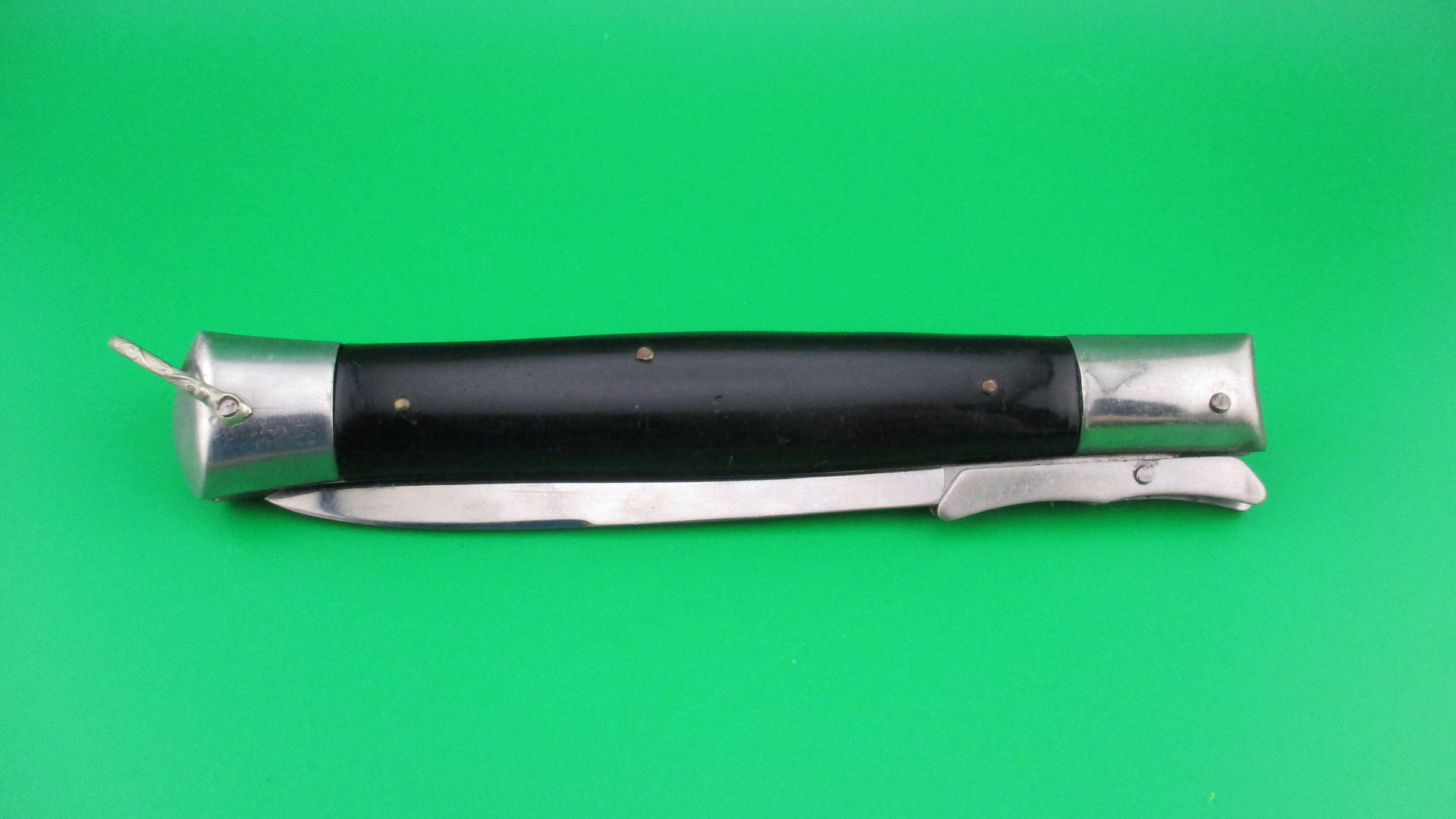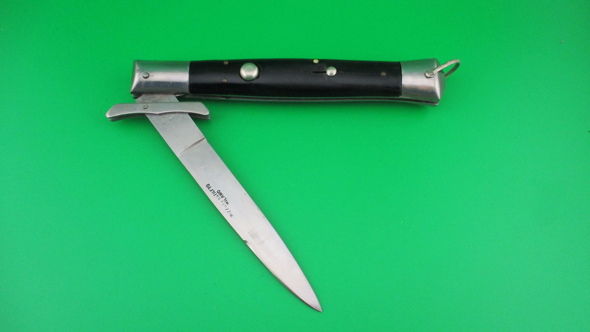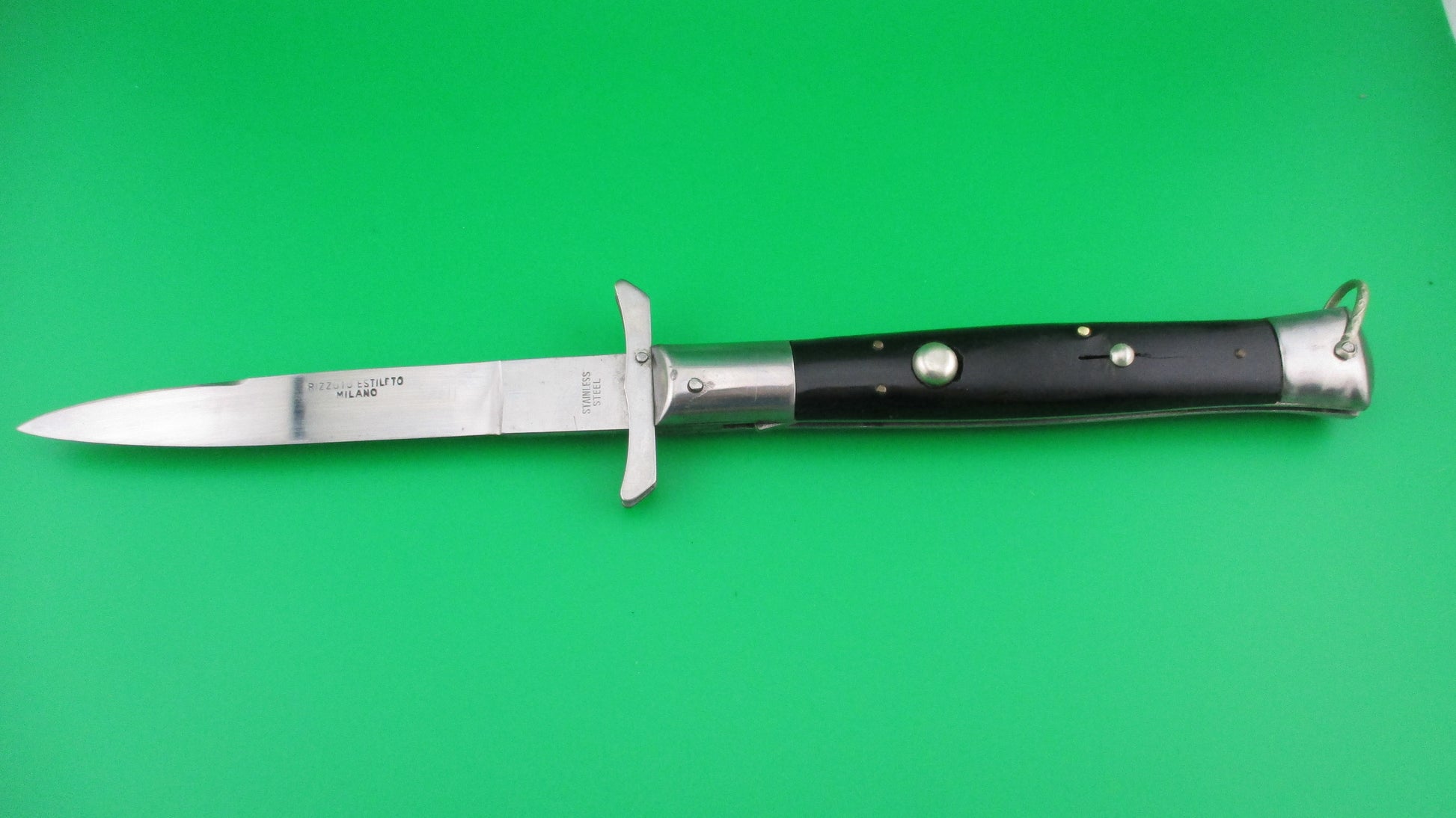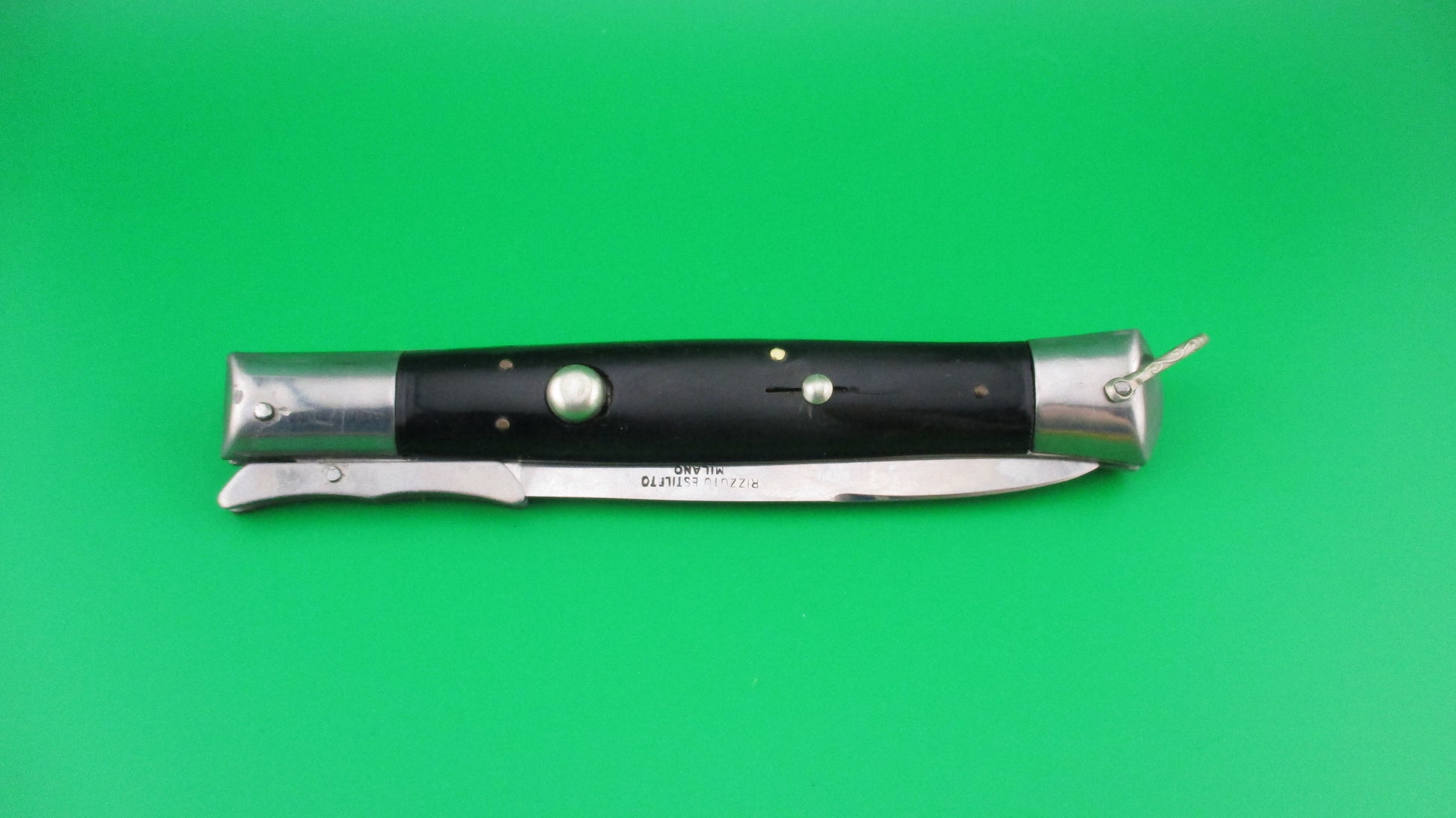 RIZZUTO ESTILETO MILANO 11 inch Swing guard Batwing black vintage automatic knife made in Japan in the 1960s. These knives were used in a lot of movies from the 1960s through the 90s and are therefore very popular with switchblade & movie enthusiasts. This is the largest size that they made. These knives were made in Japan in the 1960s and 70s mostly and were inspired by Italian switchblades of the era. This knife measures just over 26cm (10 3/8 inches) open with steel liners, guards & bolsters and nickel silver button & safety cap. Flat grind swedge blade is full with most of the original factory finish and some light scratches and is stamped STAINLESS STEEL on the tang and RIZZUTO ESTILETO MILANO below the blade spine. The black synthetic scales are in good shape with lots of light scratches and handling marks. The knife works well with the blade tip seating below the liners closed, good snap and very good lockup with very little movement open at the tip. Does not rattle if shaken with blade open. Nice example of a vintage "Italian style" movie prop switchblade. The safety works. VG+ condition.