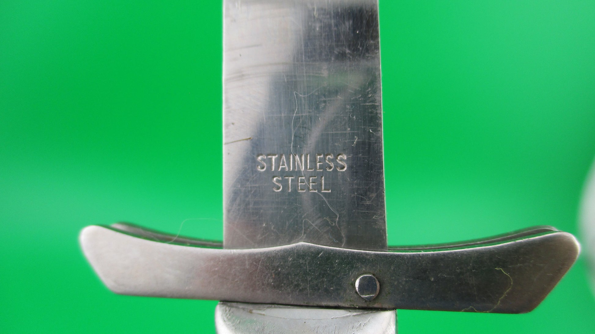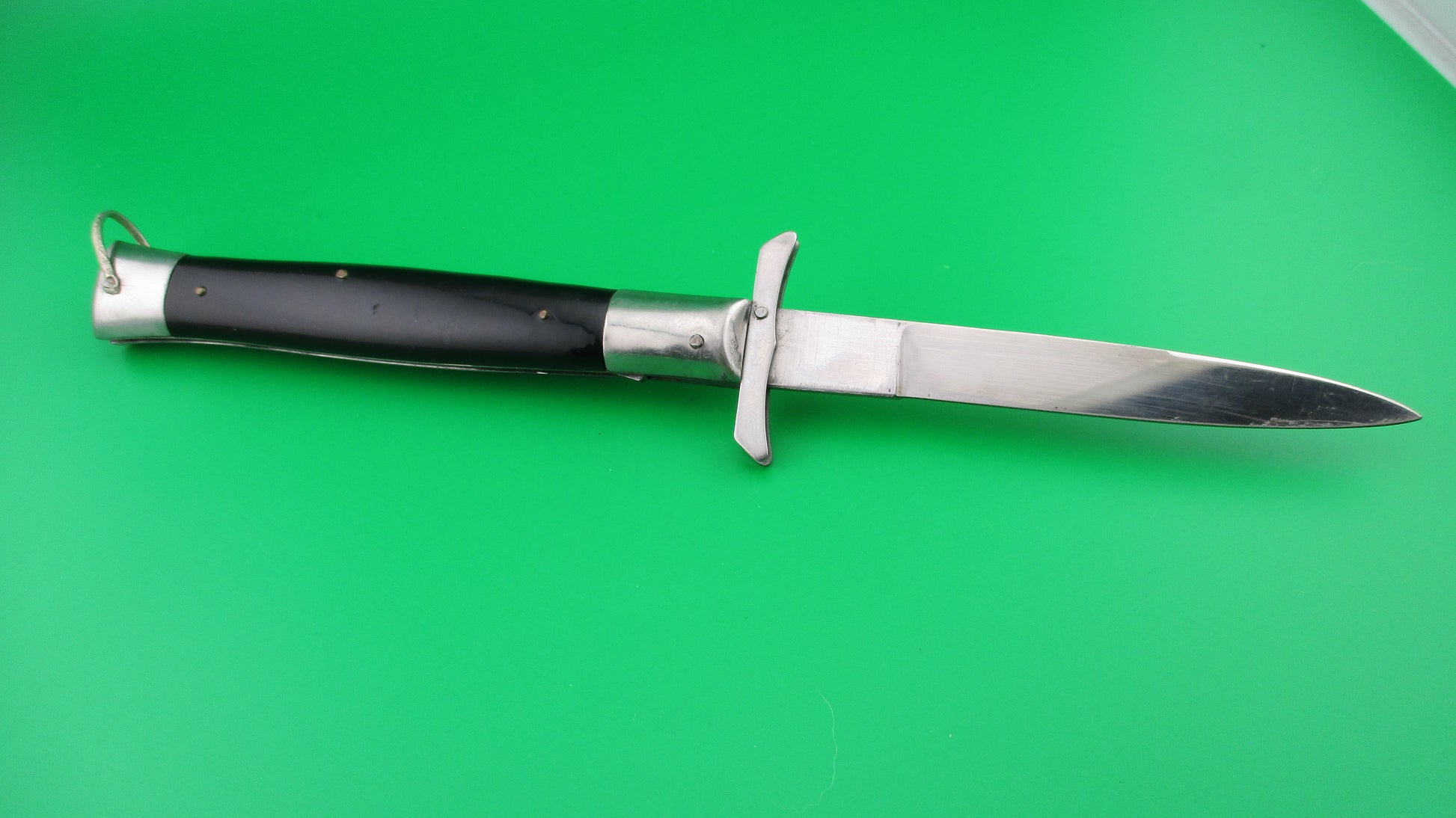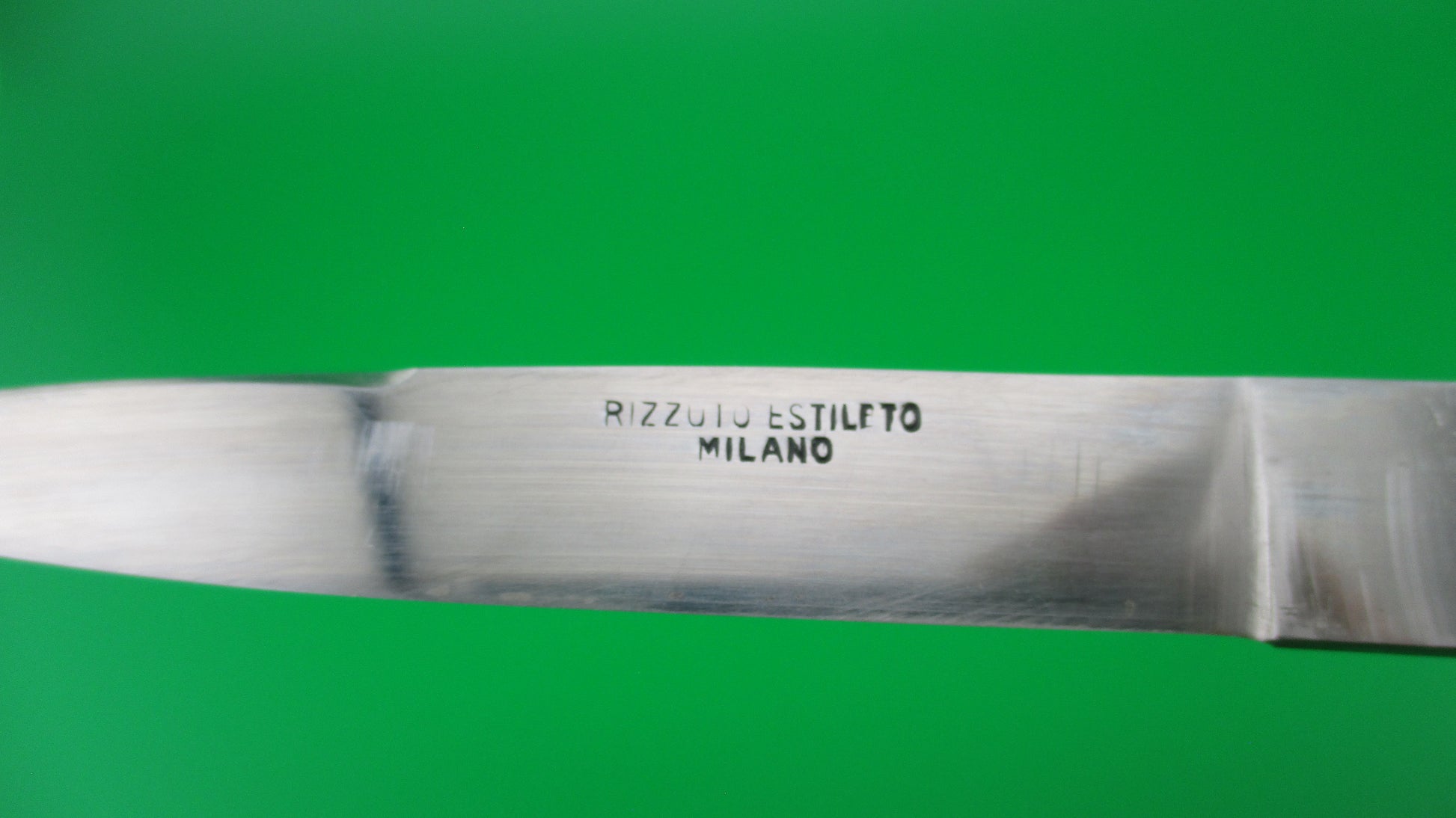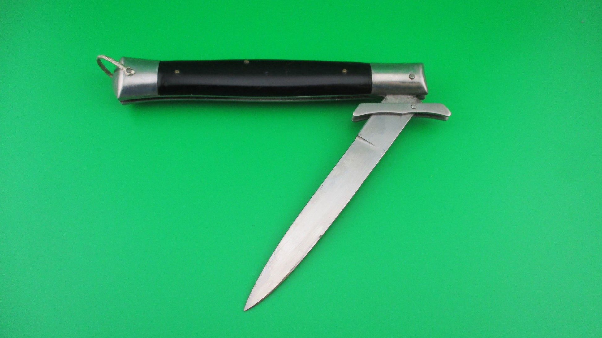 RIZZUTO ESTILETO MILANO 11 inch Swing guard Batwing black vintage automatic knife made in Japan in the 1960s. These knives were used in a lot of movies from the 1960s through the 90s and are therefore very popular with switchblade & movie enthusiasts. This is the largest size that they made. These knives were made in Japan in the 1960s and 70s mostly and were inspired by Italian switchblades of the era. This knife measures just over 26cm (10 3/8 inches) open with steel liners, guards & bolsters and nickel silver button & safety cap. Flat grind swedge blade is full with most of the original factory finish and some light scratches and is stamped STAINLESS STEEL on the tang and RIZZUTO ESTILETO MILANO below the blade spine. The black synthetic scales are in good shape with lots of light scratches and handling marks. The knife works well with the blade tip seating below the liners closed, good snap and very good lockup with very little movement open at the tip. Does not rattle if shaken with blade open. Nice example of a vintage "Italian style" movie prop switchblade. The safety works. VG+ condition.