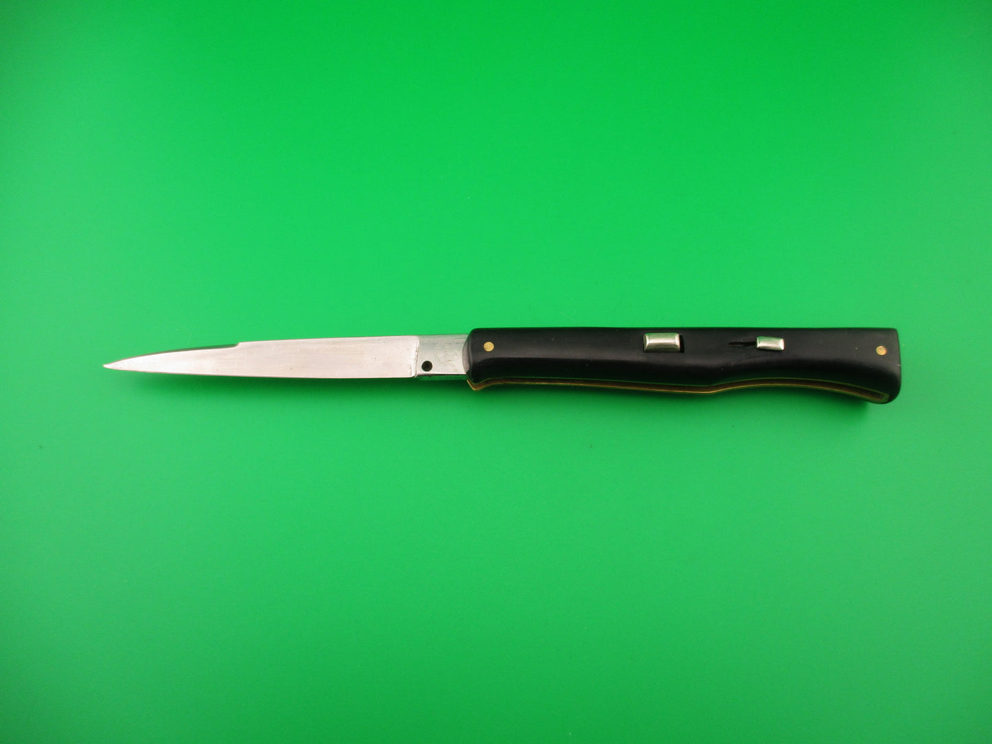 Vintage Ackermannchen ROSTFREI 21cm Italian Rectangle button lockback automatic knife made in Italy in the 1960s or 1970s. The knife measures 20.6cm (8.1 inches) open and 4 3/8 inches closed with brass liners and nickel silver button and safety. The flat swedge blade is 97% full, or better and shiny with light scratches and the ricasso is stamped Ackermannchen in an arch over ROSTFREI. The black wrap around scales (handles) are in very good condition with light handling marks/scuffs. The knife works well with blade tip just below liners closed, good snap and good lockup with about 1/16 inch movement at the tip. Does not rattle if shaken with blade open. Safety works. VG+ condition.