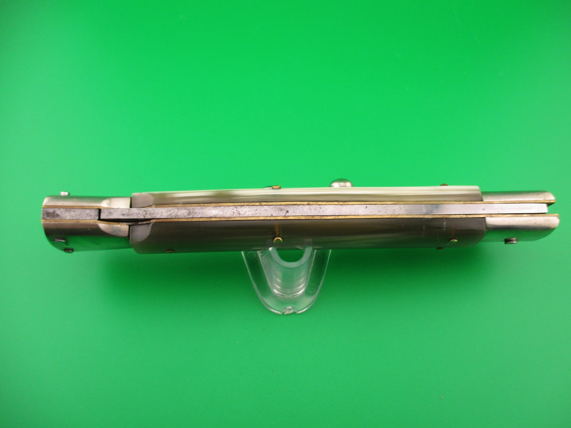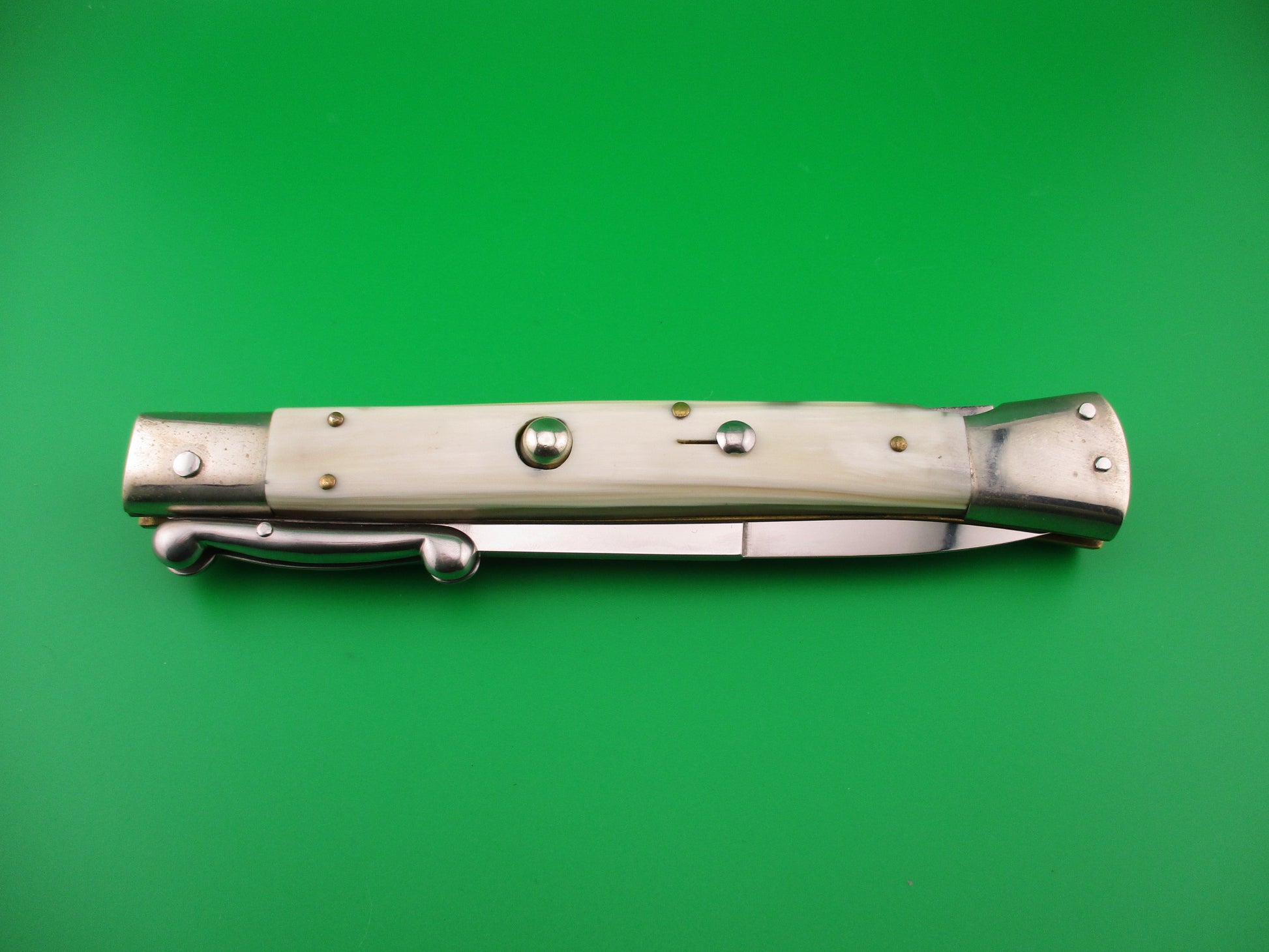 AGA CAMPOLIN 33cm Italian Swing Guard White Horn automatic knife made in Maniago Italy in 2008 by Renzo Pascotto. The knife measures 33.5cm (13 1/8 inches) open and 7 1/8 inches closed with D stamped brass liners and nickel silver bolsters & button with steel folding guards and safety cap. The bayonet blade is 100% full with original finish and is stamped AGA CAMPOLIN MANIAGO ITALY 2008. The genuine horn scales are mostly White and translucent Green and in great condition. The knife works well with blade tip deep & centered closed, strong snap and excellent lockup open with less than 1/16" movement at the tip. EX+ condition. These knives are Extremely popular and are getting nearly impossible to acquire.