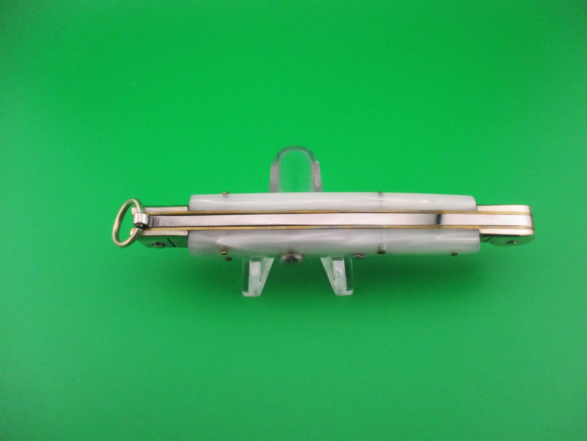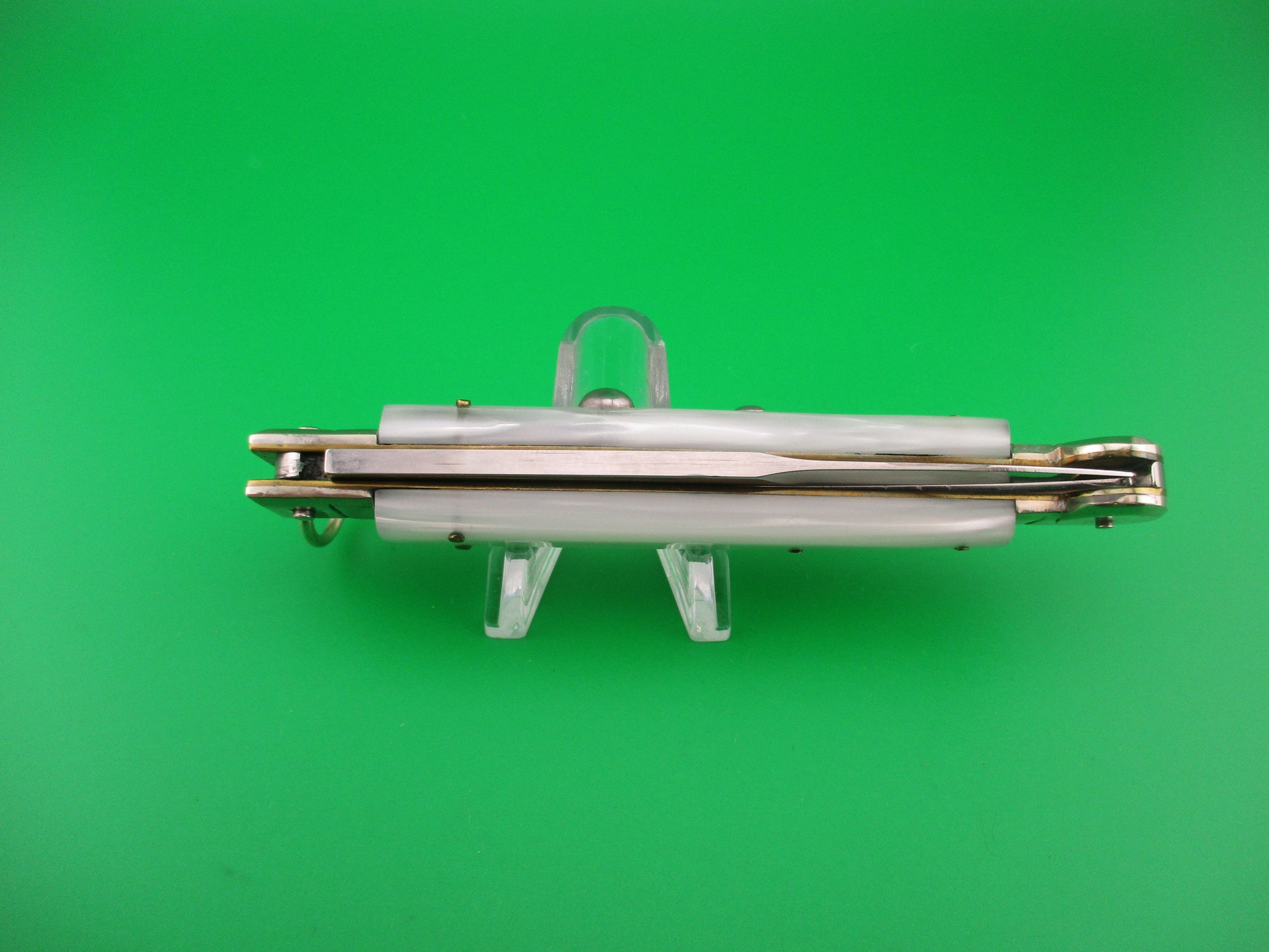 AGA CAMPOLIN 23cm Sicilian picklock Pearlex automatic knife measures 23cm (9 inches) open and 4 7/8 inches closed with brass liners and nickel silver bolsters and ring with stainless steel button & safety. The modified bayonet style blade is 100% full with factory finish and is marked AGA CAMPOLIN ITALY. The scales are Pearlex in nice condition and very attractive. The knife works like it should with the blade tip seating properly and centered closed, strong snap and great lockup open with less than 1/16" movement at the tip open. Does not rattle if shaken with blade open except for the ring. Button press to open, pull up on ring to release blade to close. Safety works. EX+ condition.