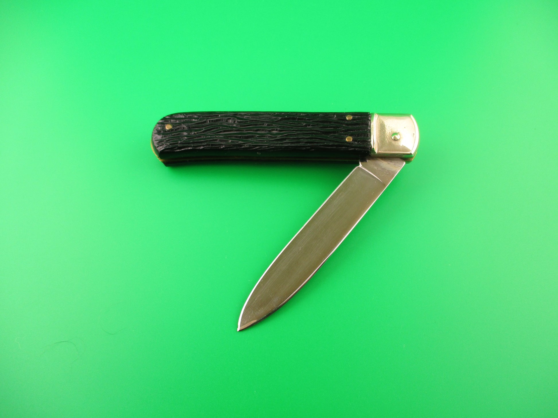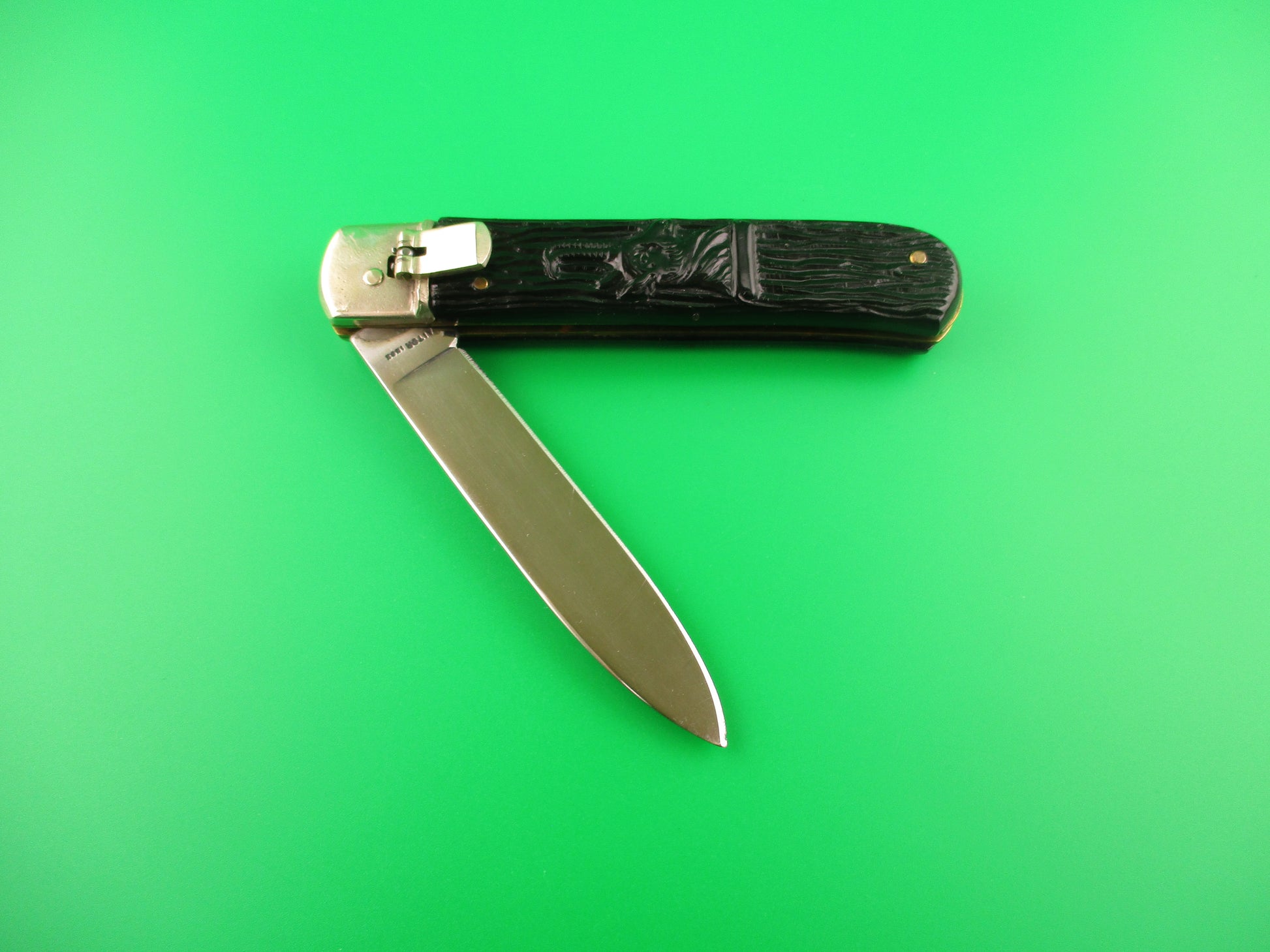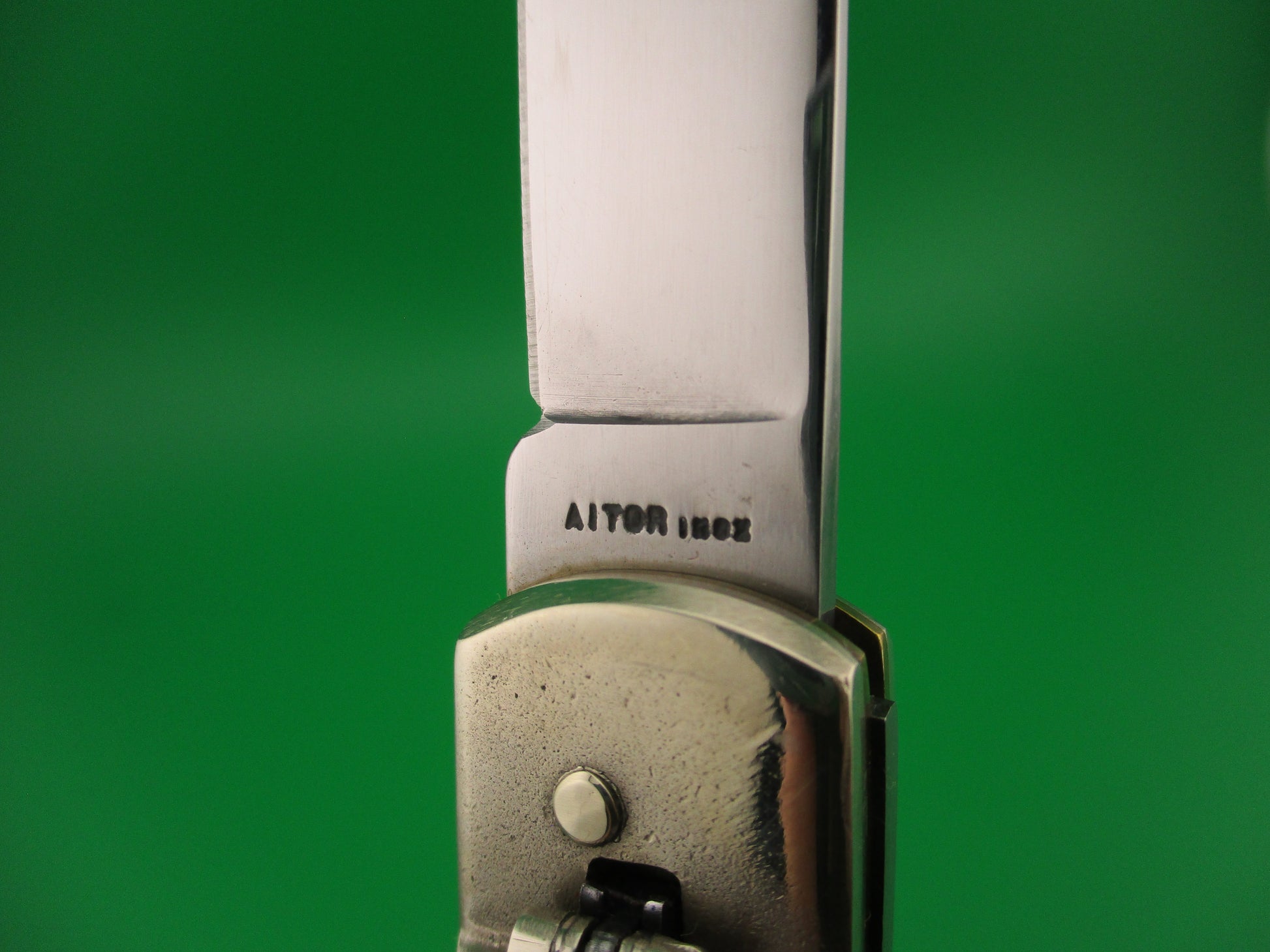 Vintage AITOR INOX 20cm Spanish Lever Antelope vintage automatic knife most likely made in the 1960s or 70s in Spain. The knife measures 19.9cm (7 13/16 inches) open and 4 3/8 inches closed with brass liners and nickel silver bolsters & lever. The flat grind spear tip blade is 99% full or better with original factory finish with some light scuffs and scratches and the tang is stamped AITOR INOX. The handles (scales) are black synthetic with a picture of an Antelope head on the front and in great condition. The knife works great with the blade tip below the liners & centered closed, STRONG snap and very good lockup with less than 1/16" down at the tip that springs back when you let go. No rattle if shaken with blade open. Nice old Spanish lever switchblade knife. EX condition