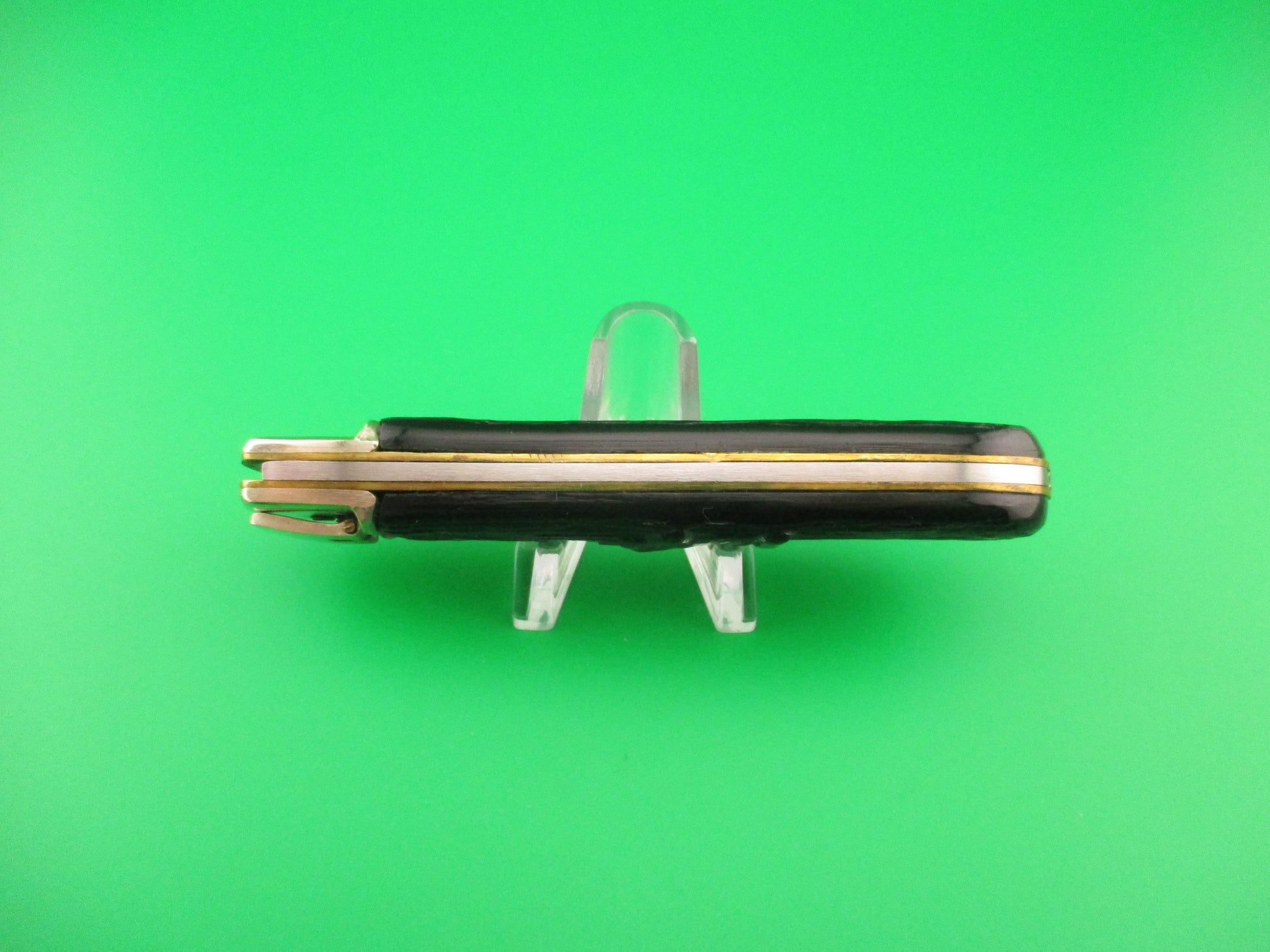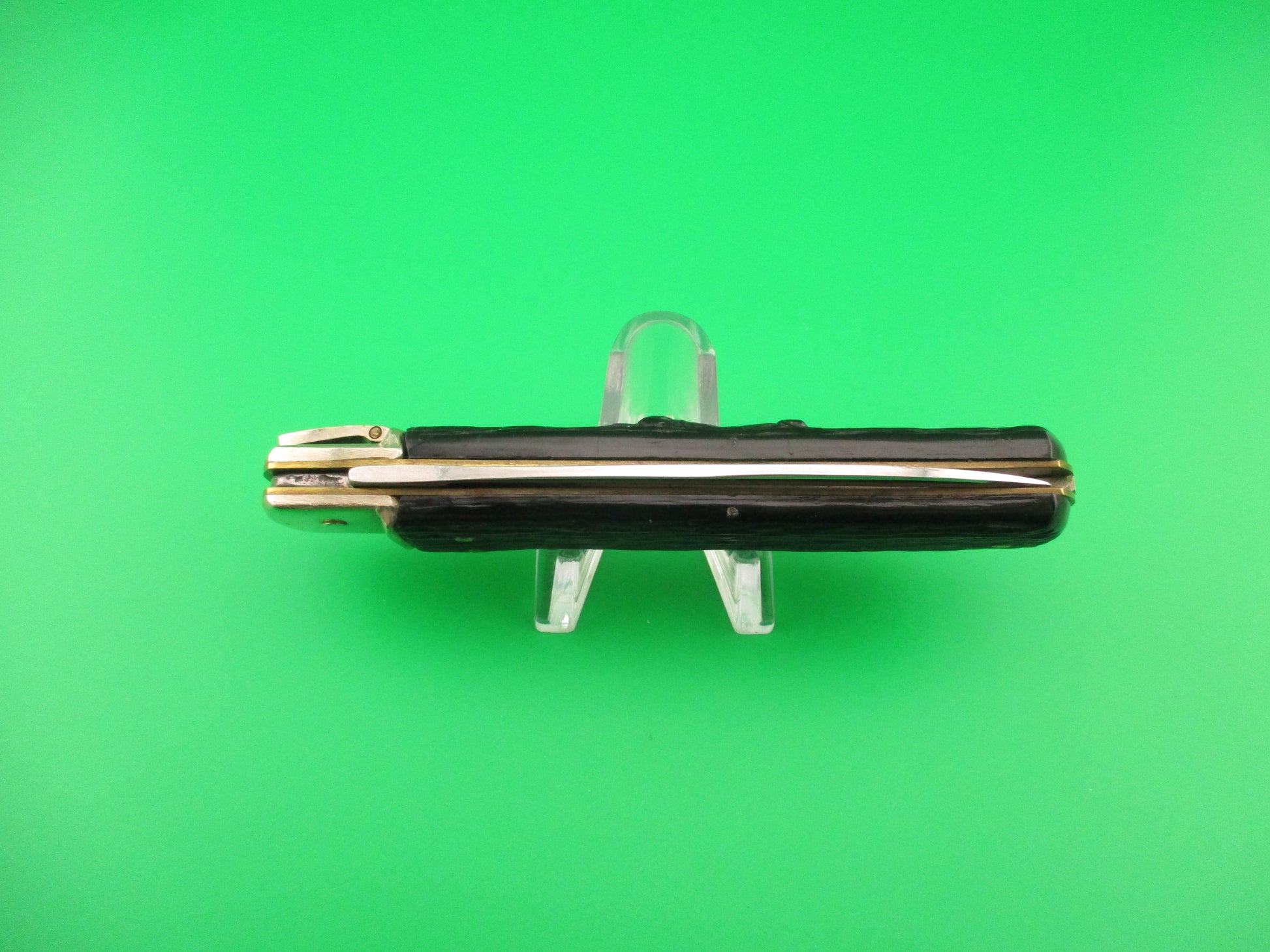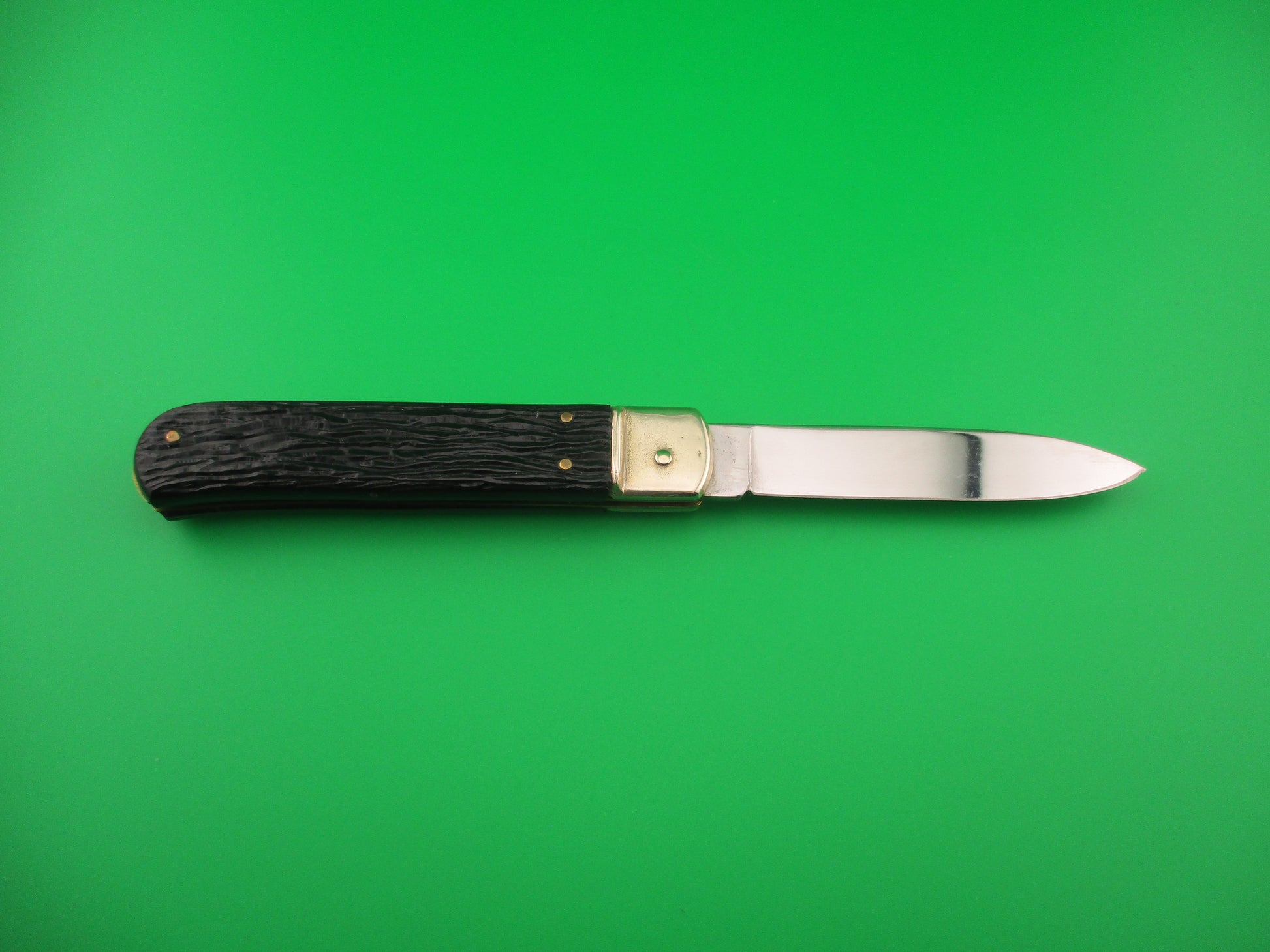 Vintage AITOR INOX 20cm Spanish Lever Antelope vintage automatic knife most likely made in the 1960s or 70s in Spain. The knife measures 19.9cm (7 13/16 inches) open and 4 3/8 inches closed with brass liners and nickel silver bolsters & lever. The flat grind spear tip blade is 99% full or better with original factory finish with some light scuffs and scratches and the tang is stamped AITOR INOX. The handles (scales) are black synthetic with a picture of an Antelope head on the front and in great condition. The knife works great with the blade tip below the liners & centered closed, STRONG snap and very good lockup with less than 1/16" down at the tip that springs back when you let go. No rattle if shaken with blade open. Nice old Spanish lever switchblade knife. EX condition
