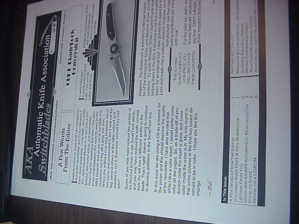 AKA Automatic Knife Association Switchblades Newsletter Summer 2002 Vol 1 Issue 3. This switchblade newsletter was published for a few years in the early 2000s and has 12 printed pages of information about automatic knives with articles by Rich Langston, Bill Rudich & Cindy Hale. Kabar Grizzly and many other knives.