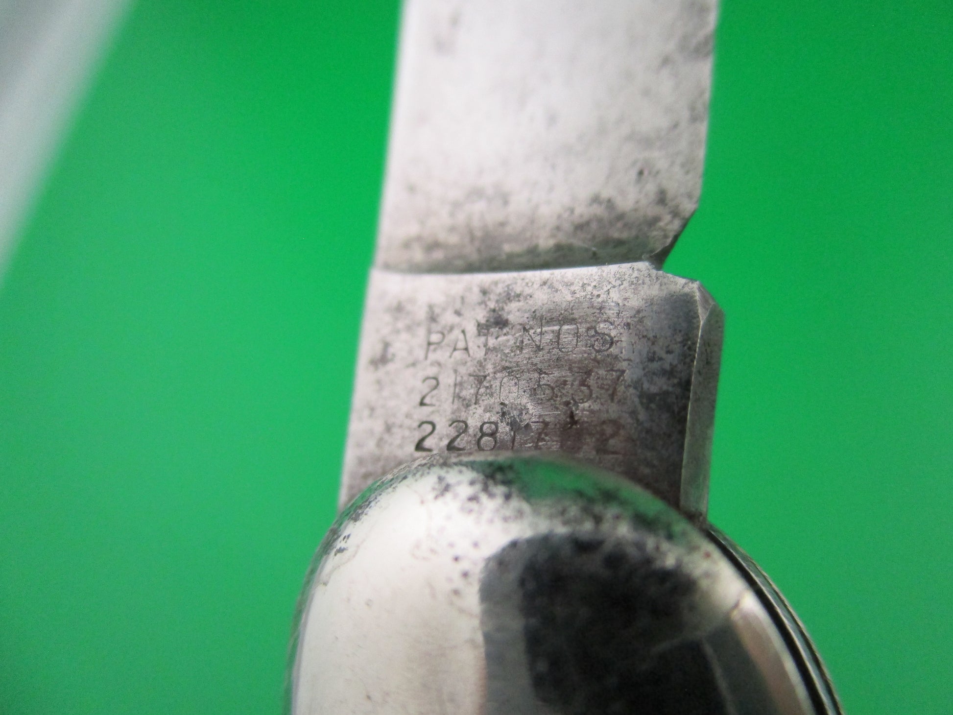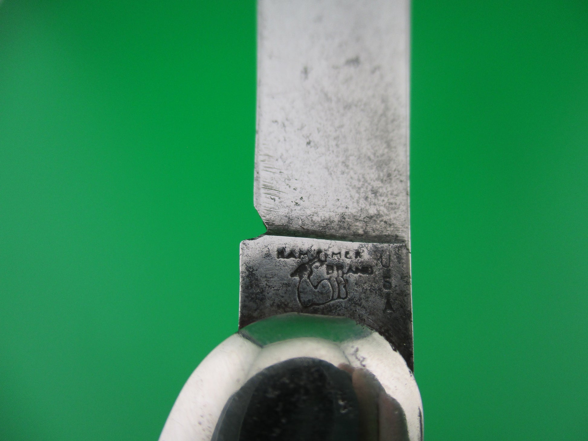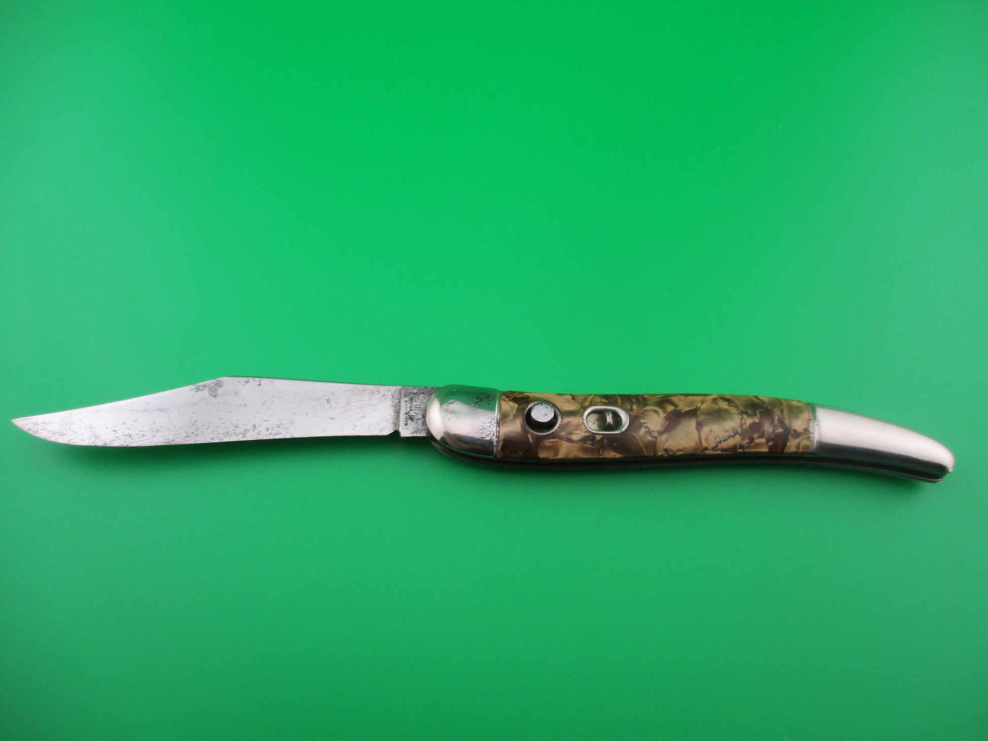 This is a Hammer Brand toothpick made by the Imperial Knife Co of Providence,RI in the 1950s. The knife measures 4.25 inches closed and 7 5/8 inches open and is stamped Hammer Brand USA with picture of an arm holding a hammer on the front and PAT NOS over two patent numbers on the back. The scales are hollow steel wrapped in Copper swirl celluloid which is a clue that it is a knife made in the early 1950s when they used more color variation. The wraps are in good condition and very attractive colors. The bolsters have some light pitting as you can see in the pics. The blade is 98% full with much of the original factory finish intact! Nice blade with light scratches and a few tiny pits. The knife works well with blade tip sitting deep when closed, opens strong and locks open with a little movement each way. Barely rattles if shaken when open with approx 1/8 inch up and down and very slight side to side. The knife is in EX condition and is a really nice example of a working vintage American toothpick switchblade from the early 1950s.