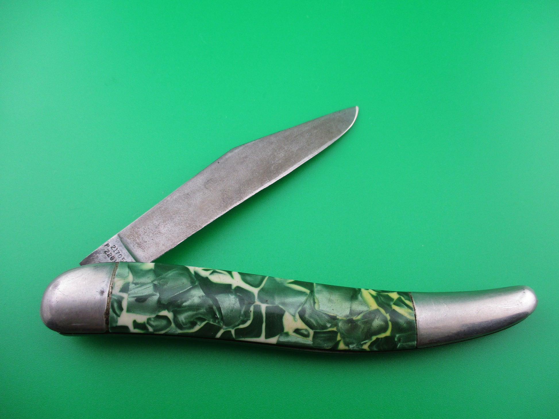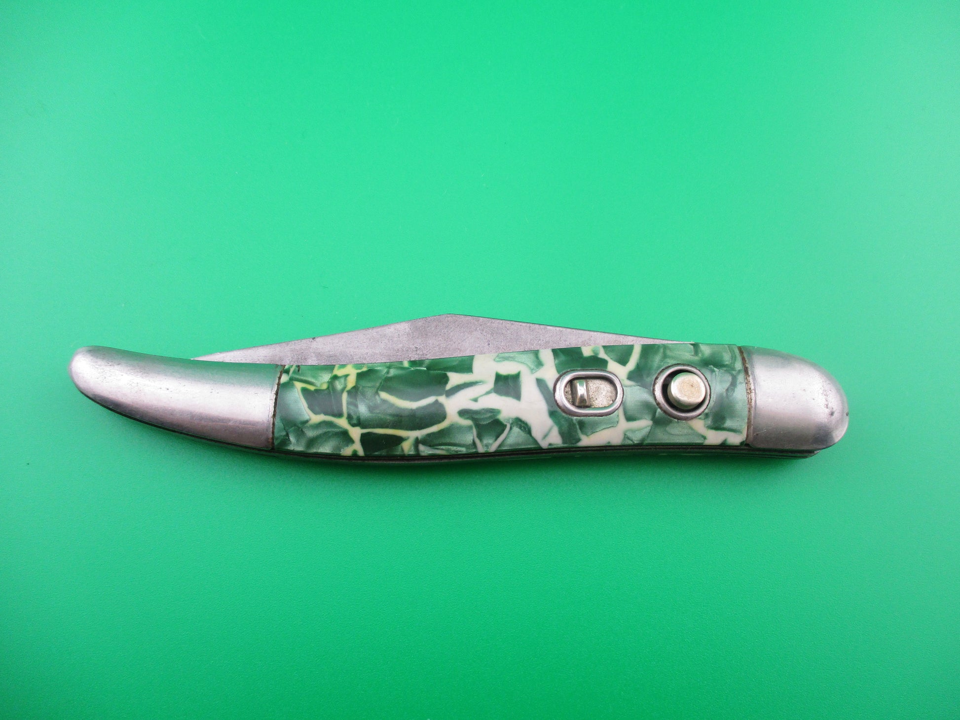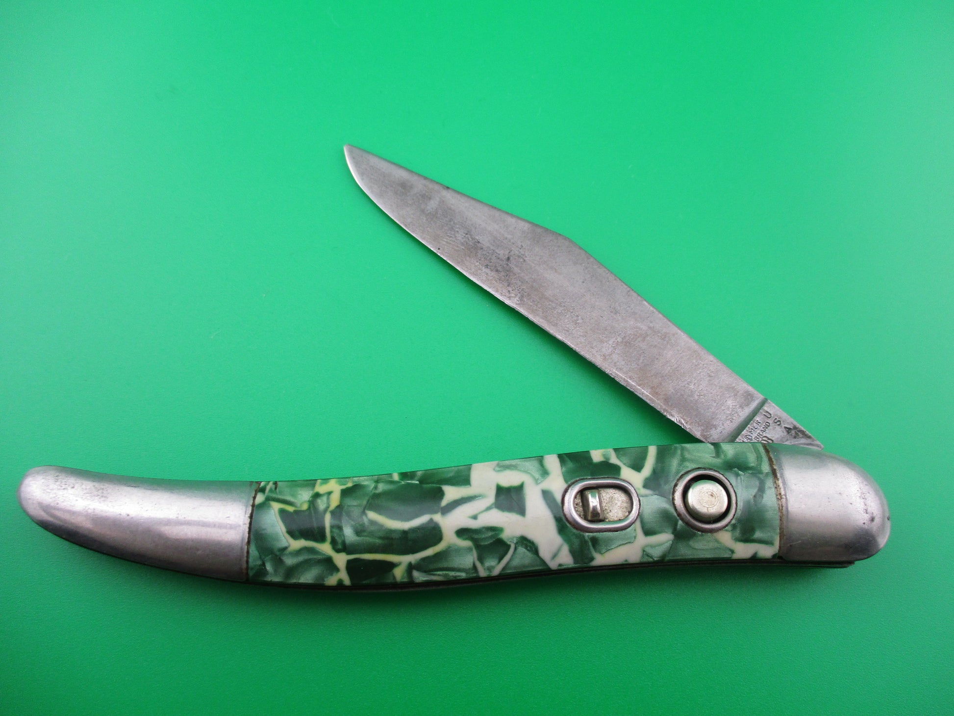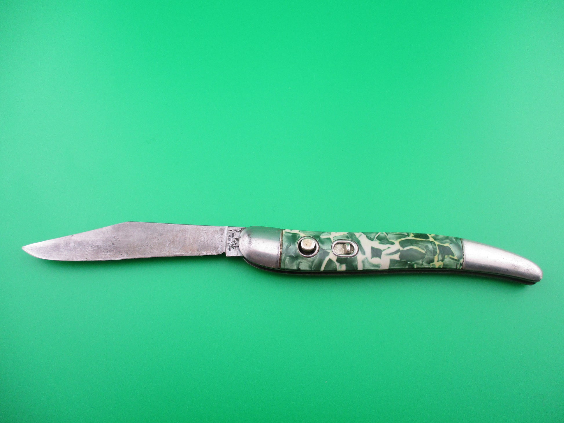 This is a Hammer Brand toothpick made by the Imperial Knife Co of Providence RI in the early1950s and designated model # JM-90-PBC. The knife measures 4.25 inches closed and 7 3/8 inches open and is stamped Hammer Brand USA with picture of an arm holding a hammer on the front and PAT NOS over two patent numbers on the back. The scales are hollow steel wrapped in Green pearl/white mottled celluloid which is a clue that it is a knife made in the early 1950s when they used more color variation. The wraps are in good condition and very attractive colors. The blade is 92% full with light patina and is about 1/4 inch short. The knife works well with blade tip sitting deep when closed, opens strong and locks open with some movement each way. Rattles if shaken when open with approx 1/8 inch up and down and about 3/16" side to side. The knife is in VG+ condition and is a really nice example of a working vintage American toothpick switchblade from the early 1950s.