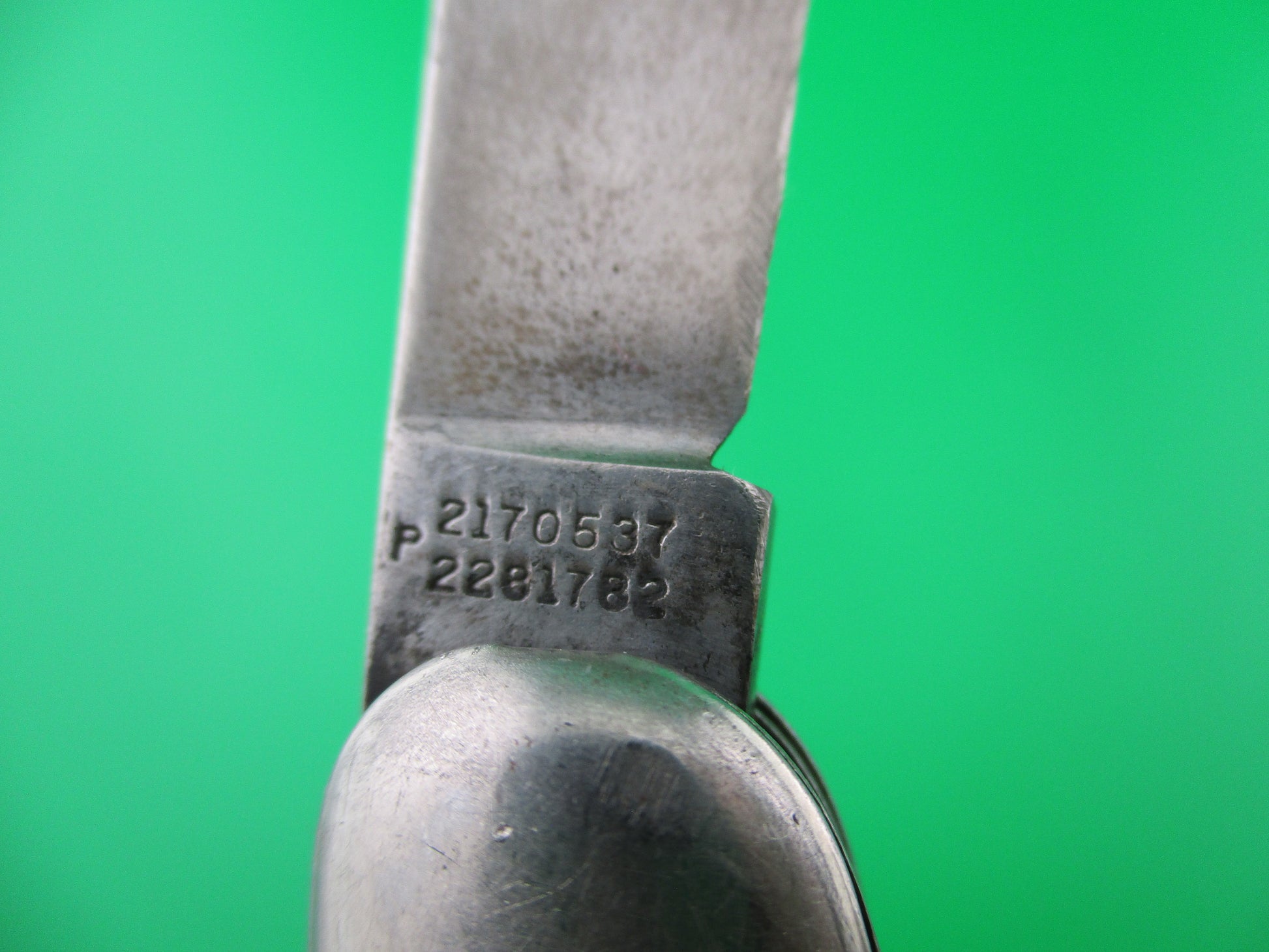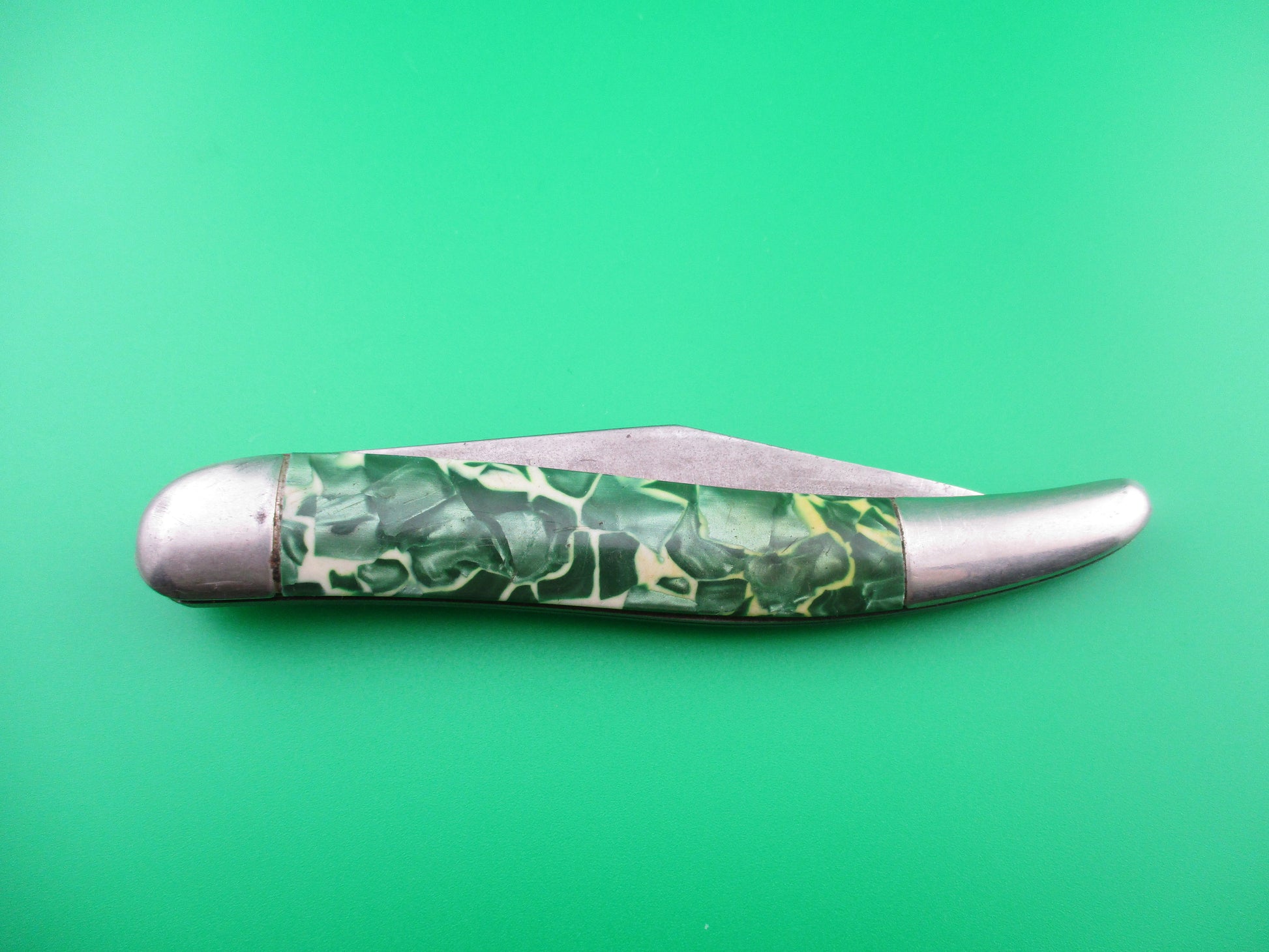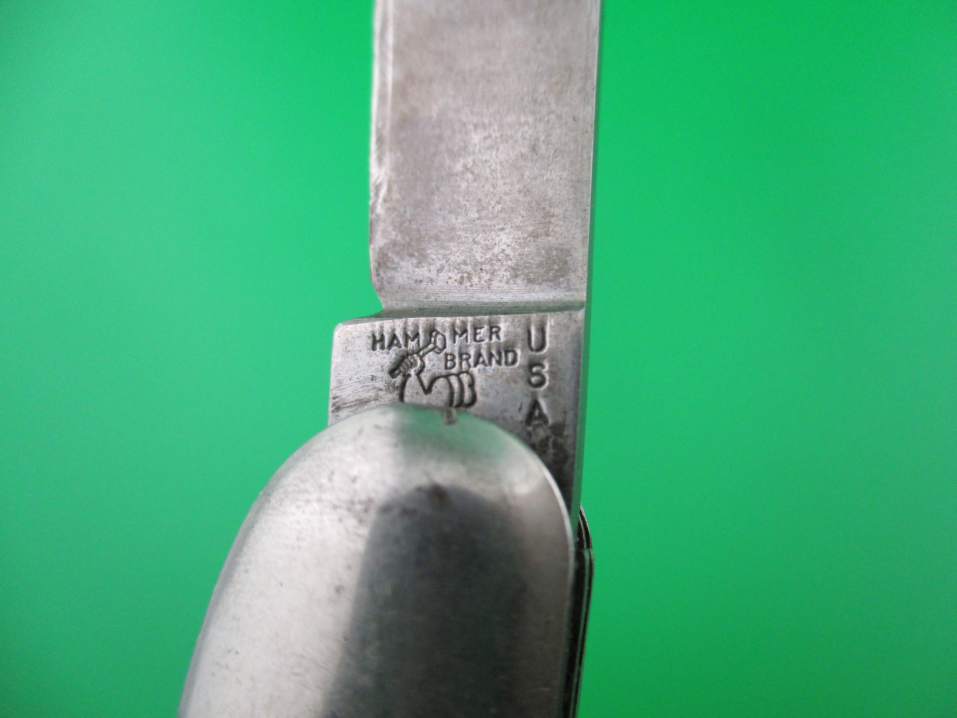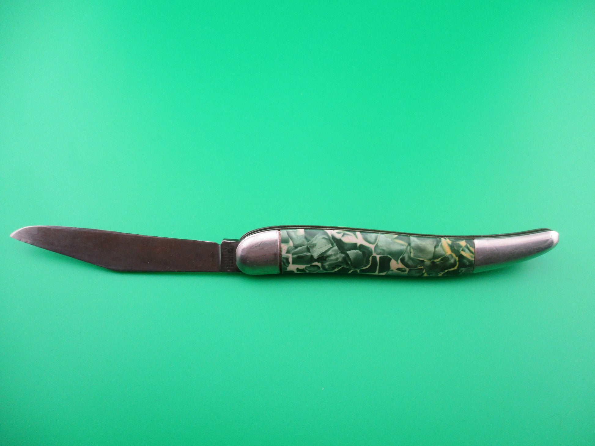 This is a Hammer Brand toothpick made by the Imperial Knife Co of Providence RI in the early1950s and designated model # JM-90-PBC. The knife measures 4.25 inches closed and 7 3/8 inches open and is stamped Hammer Brand USA with picture of an arm holding a hammer on the front and PAT NOS over two patent numbers on the back. The scales are hollow steel wrapped in Green pearl/white mottled celluloid which is a clue that it is a knife made in the early 1950s when they used more color variation. The wraps are in good condition and very attractive colors. The blade is 92% full with light patina and is about 1/4 inch short. The knife works well with blade tip sitting deep when closed, opens strong and locks open with some movement each way. Rattles if shaken when open with approx 1/8 inch up and down and about 3/16" side to side. The knife is in VG+ condition and is a really nice example of a working vintage American toothpick switchblade from the early 1950s.