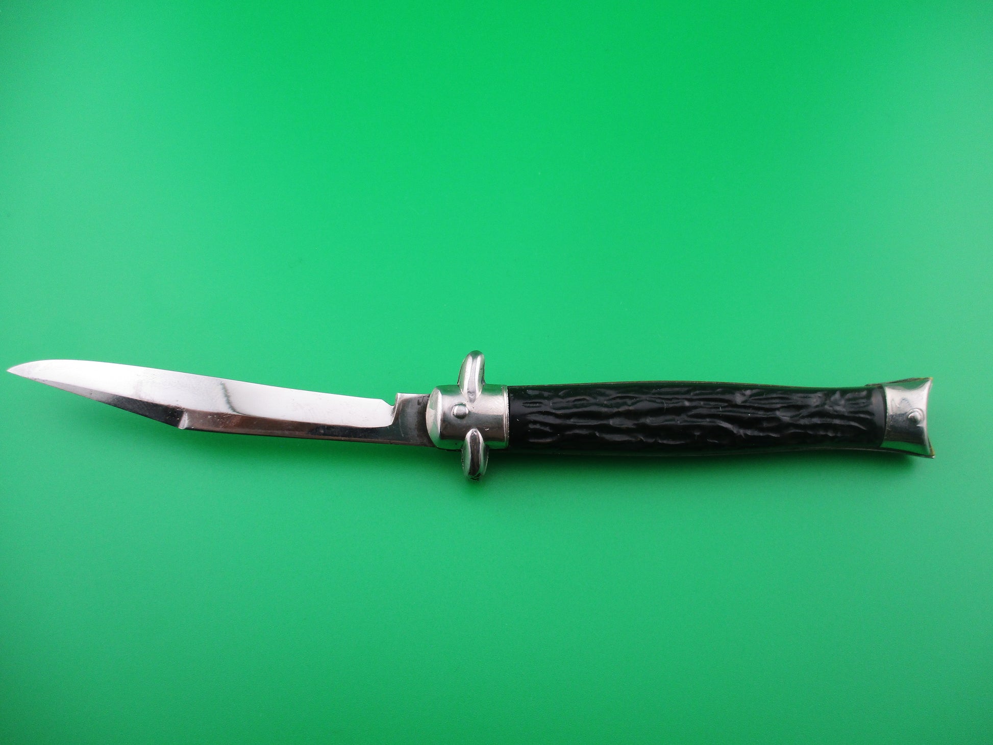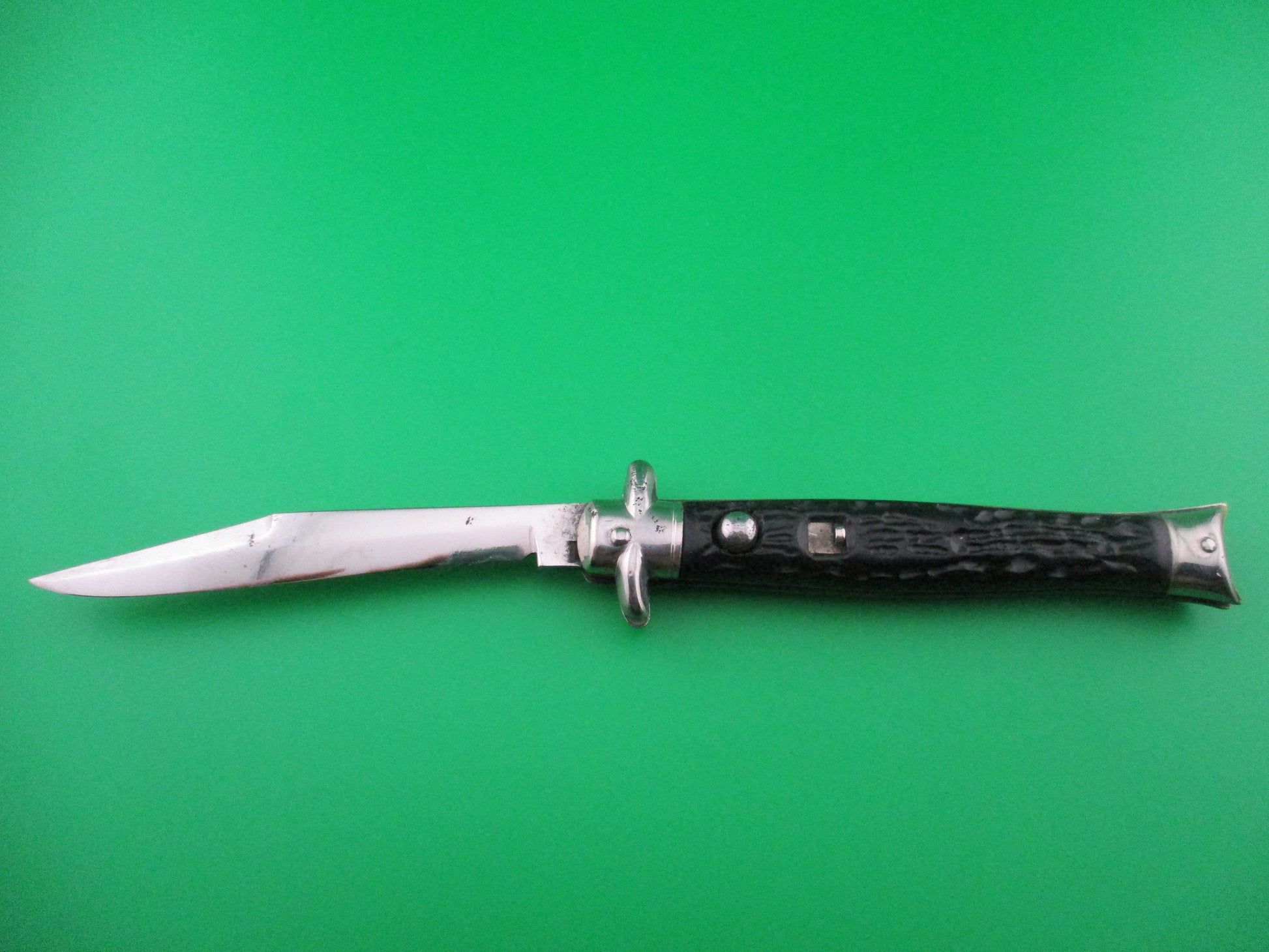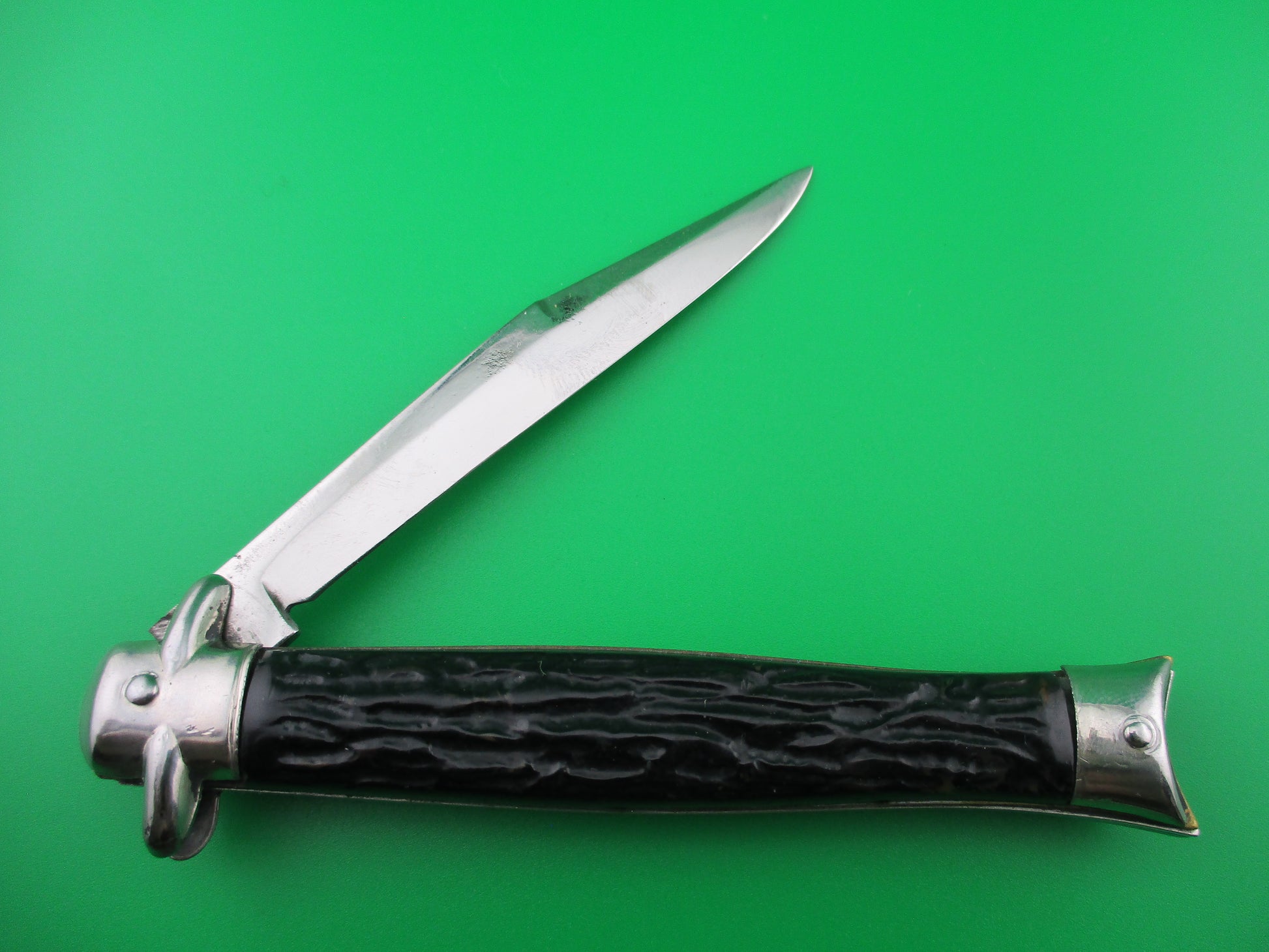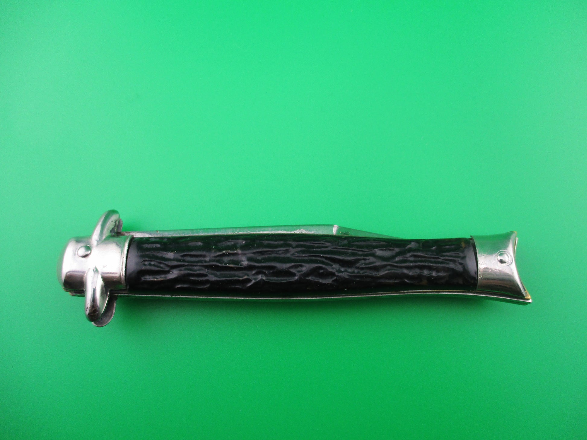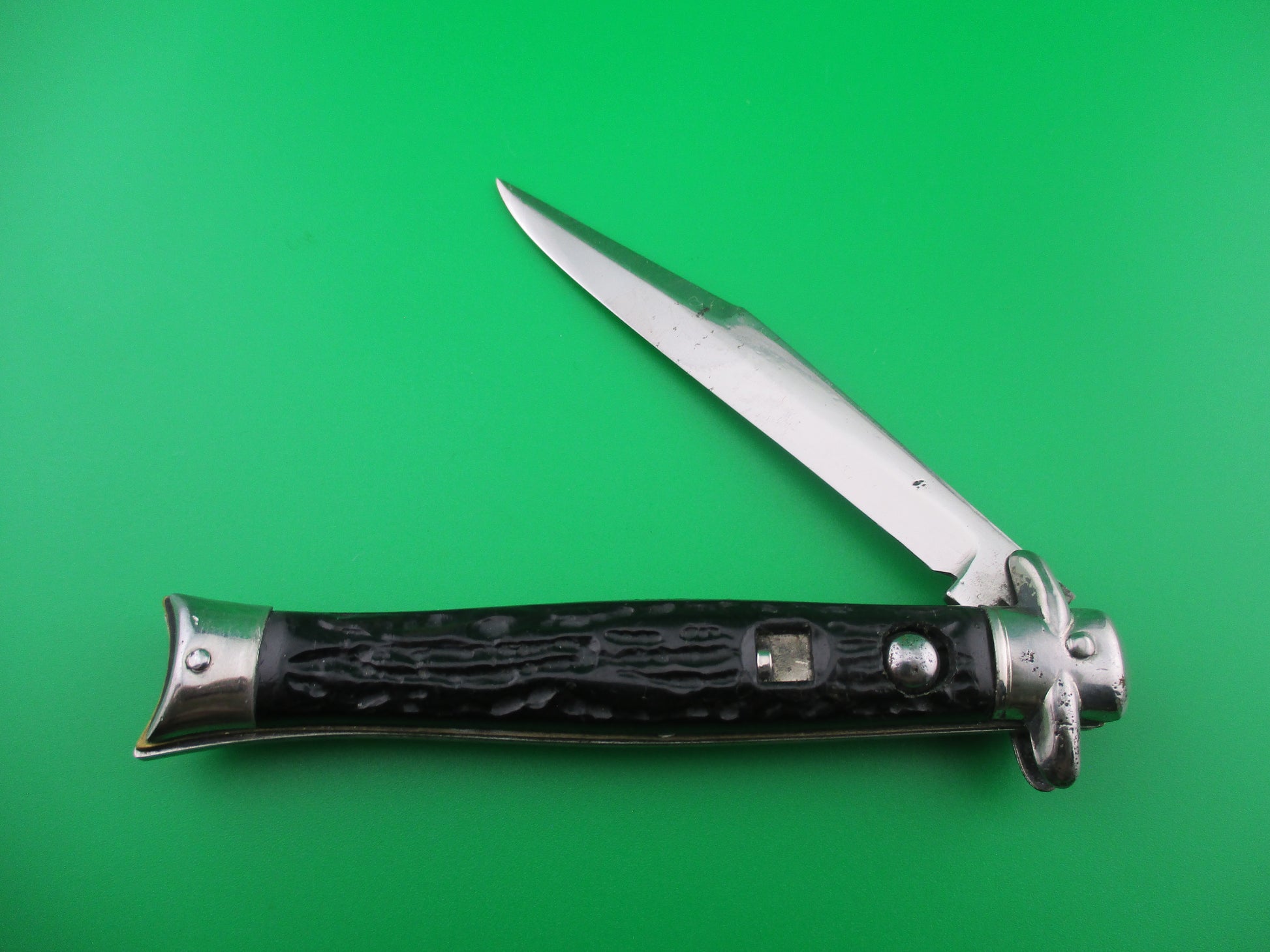 This is a Shur Snap bowtie fishtail switchblade with Black imitation stag synthetic scales. The knife was made by the Colonial Knife Co of Providence, RI in the late 1950s, likely 1956-58 and designated the model 1800CB. It measures 4 inches closed and 7.25 inches open and has steel liners. The tang should have been stamped SHUR SNAP over Colonial over PROV USA, but many were stamped so light that you can't see it, and some were never stamped . We can tell it's a later 4th gen knife by the large domed button. The blade is mostly full and shiny with some light pitting. It has been nicely cleaned. The Black synthetic scales are in nice condition with no shrinkage. Operates well with blade tip sitting deep closed, good snap and good lockup. Safety works. 100% money back guarantee including return shipping if you're not happy with this knife.