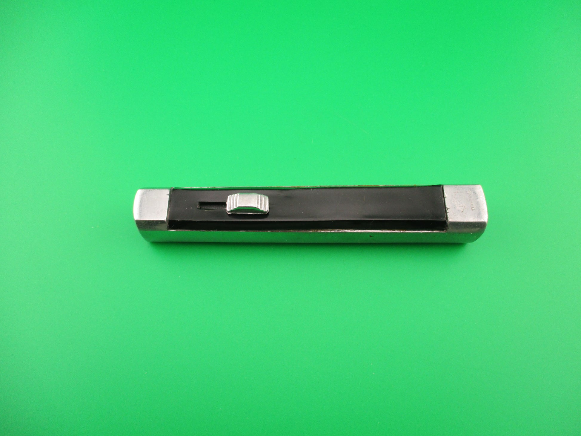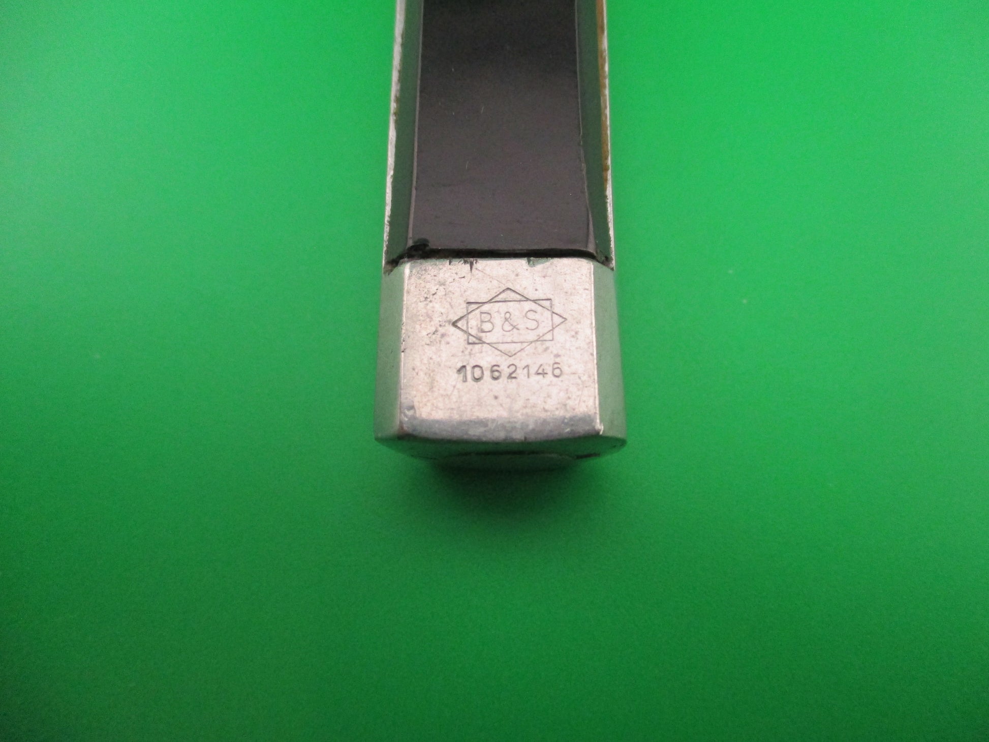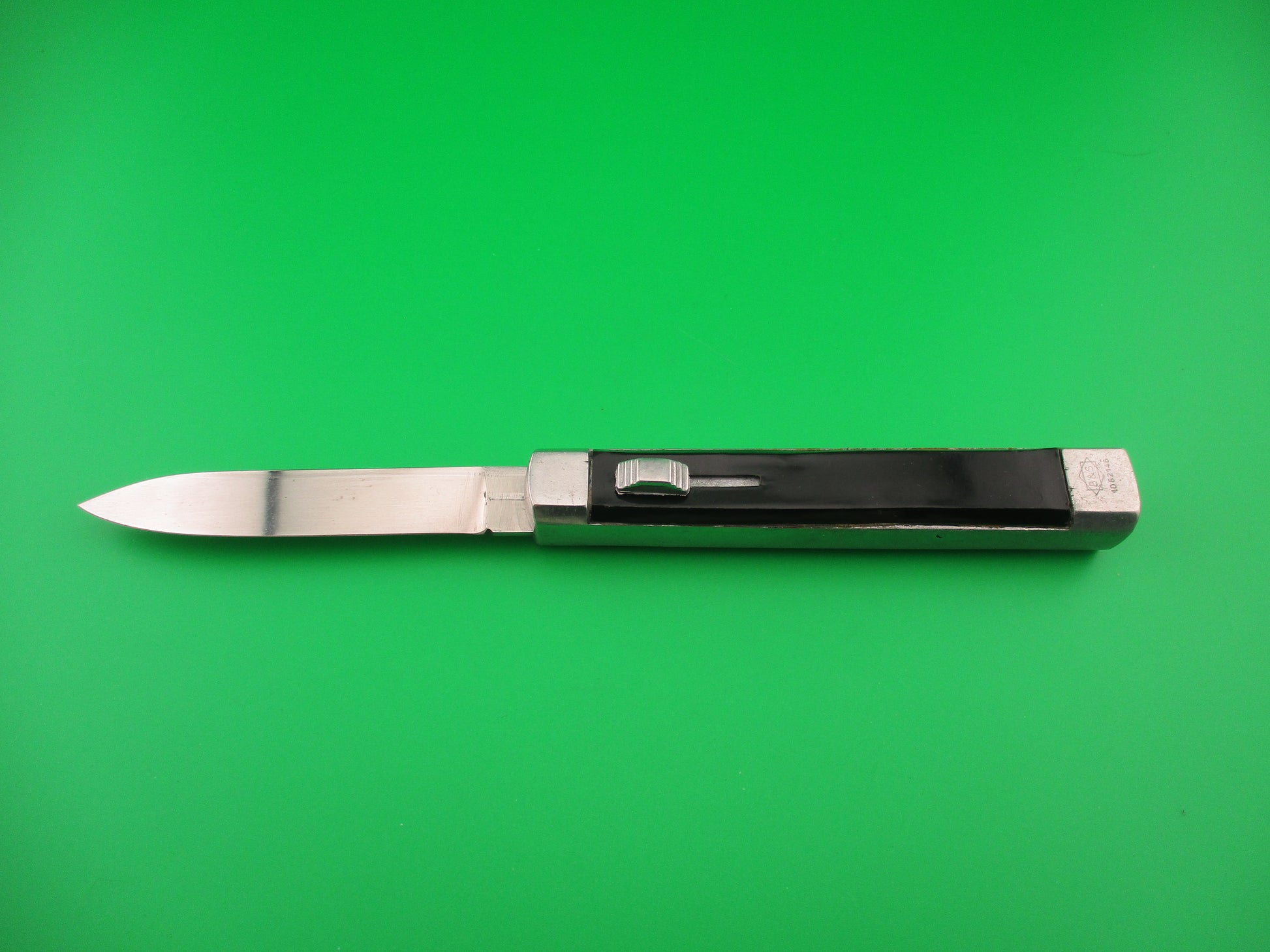 Vintage B&S 1062146 Spanish 20cm OTF Black Aluminum Automatic knife made in Spain in the 1960s or 70s most likely. The knife measures 19.7 cm (7.75 inches) open with an aluminum frame, built in bolsters and button. The spear point blade appears to be 100% full with original factory finish and no markings. The black plastic scales have some shrinkage and handling marks, but good condition overall. The bottom bolster is marked B&S over the number 1062146. The knife is Double Action which means that the blade moves automatically to both open and close by pushing the release button forward to open and backward to close. Very light weight knife. VG+ condition.