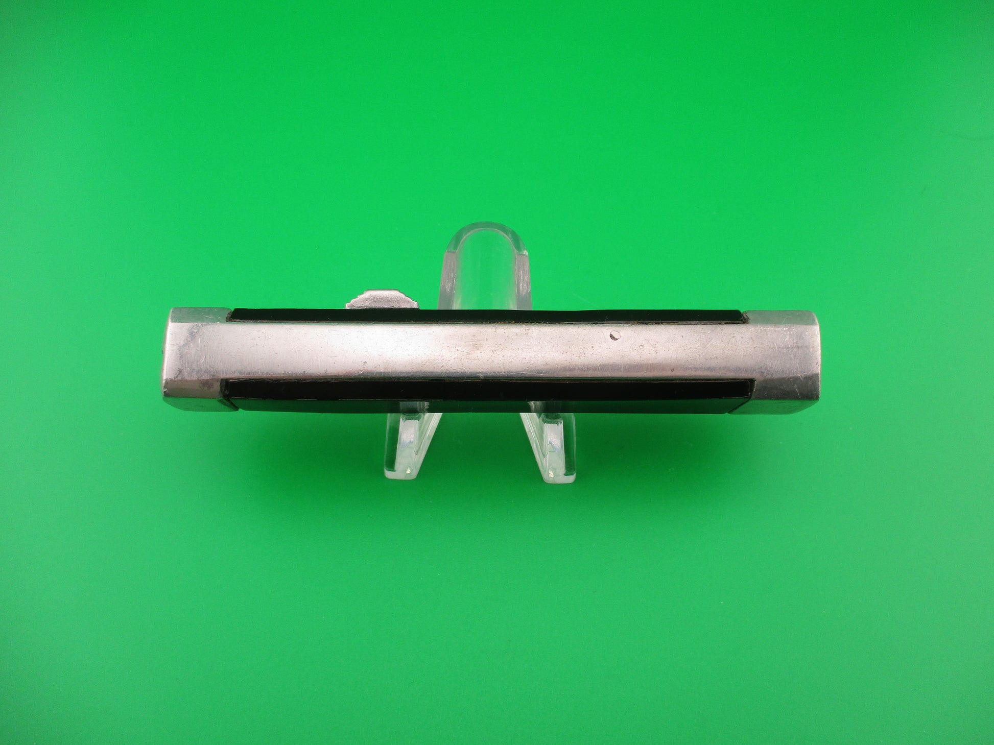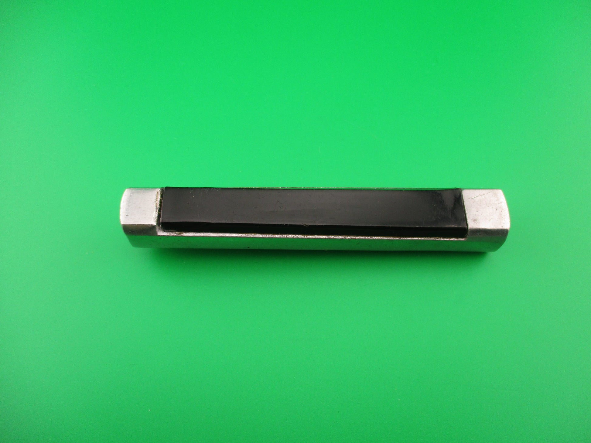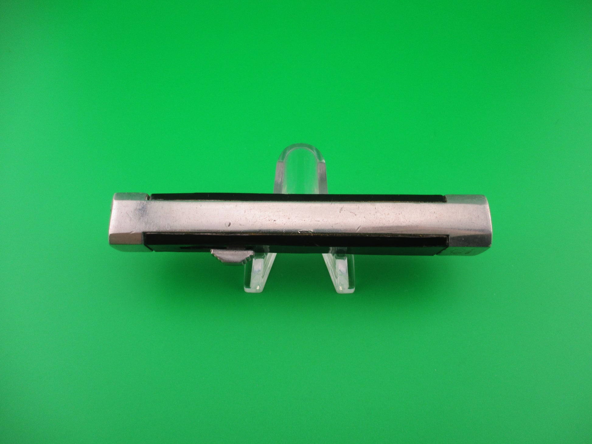 Vintage B&S 1062146 Spanish 20cm OTF Black Aluminum Automatic knife made in Spain in the 1960s or 70s most likely. The knife measures 19.7 cm (7.75 inches) open with an aluminum frame, built in bolsters and button. The spear point blade appears to be 100% full with original factory finish and no markings. The black plastic scales have some shrinkage and handling marks, but good condition overall. The bottom bolster is marked B&S over the number 1062146. The knife is Double Action which means that the blade moves automatically to both open and close by pushing the release button forward to open and backward to close. Very light weight knife. VG+ condition.
