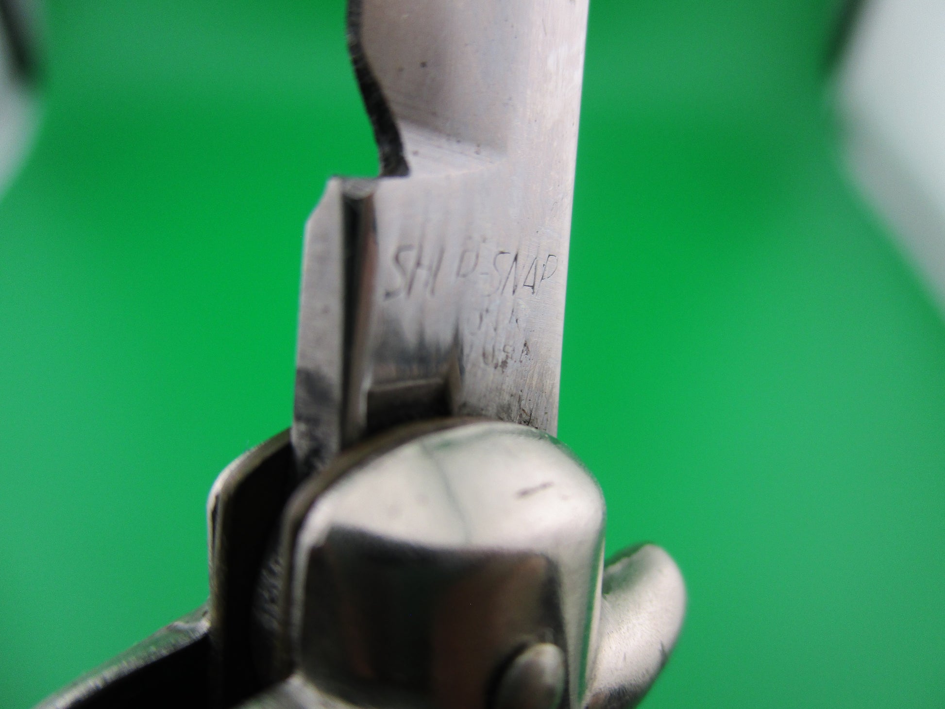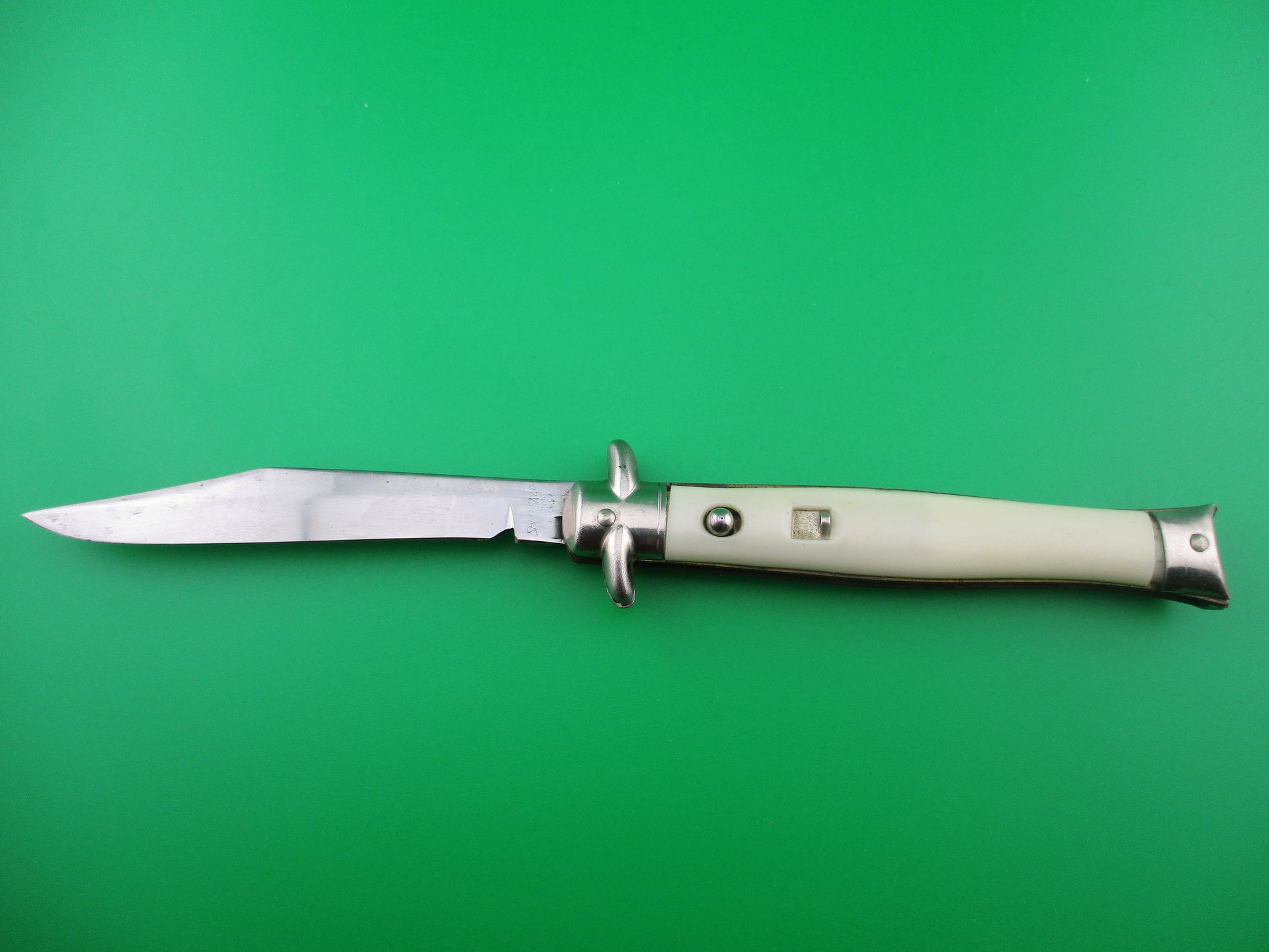 Colonial Knife Co Shur-Snap bowtie switchblade. This is an early model made before 1955 in Providence, RI. We can date it by the characteristics of small domed button and bolsters. This knife measures 4 inches closed and 7.25 inches open with brass liners. The blade is full with all of the original factory finish intact. The scales are white and in excellent condition with minimal shrinkage near the bottom on each side as most of these do have over time. The knife works well, tip even with liners closed, good snap and tight lockup! Obviously this knife hasn't seen much use in the past 70 years and is a GREAT example! Safety does work. VG+ condition.