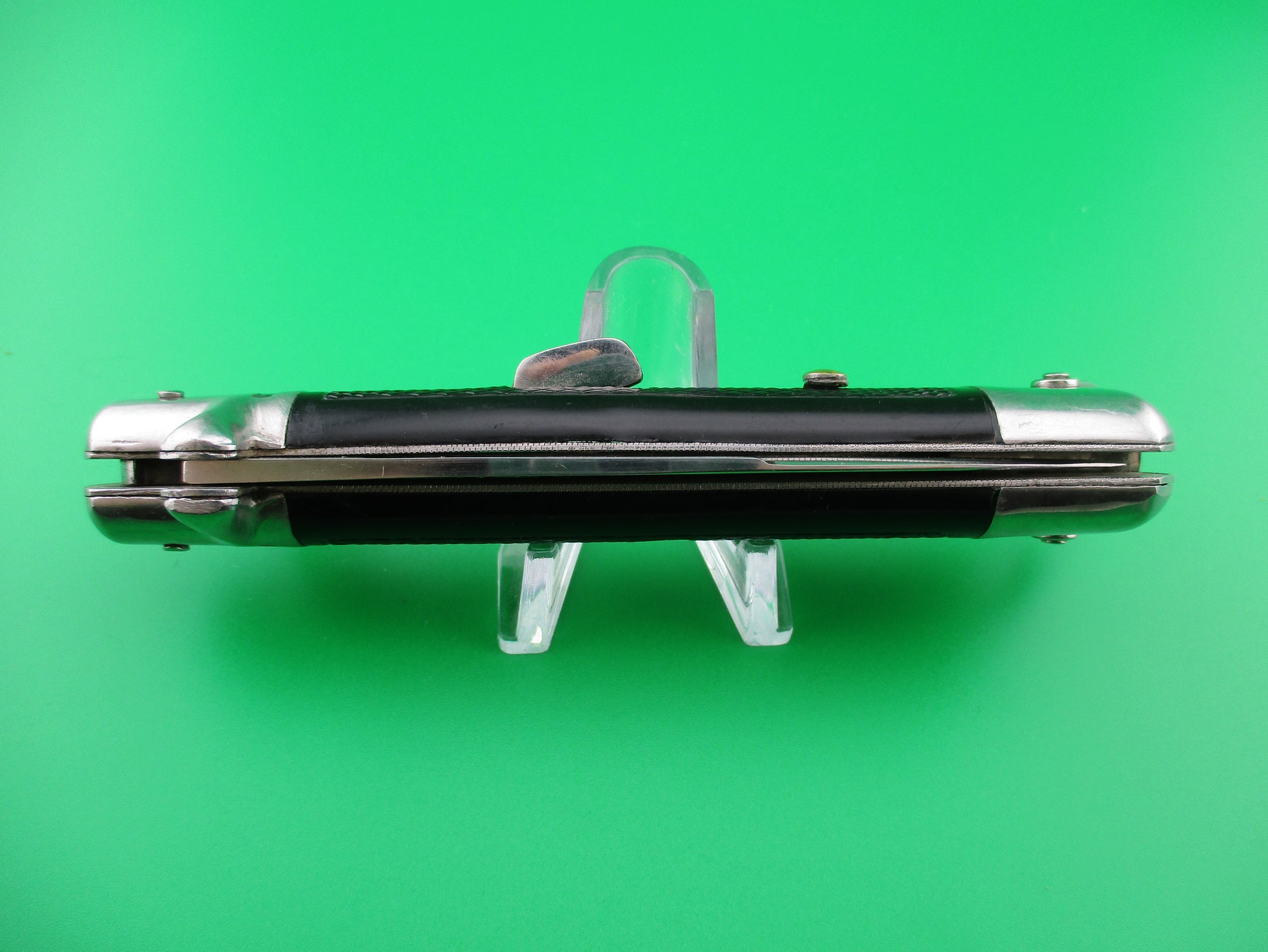 Nice French Bargeon automatic knife with finger guards on the bolsters. The knife is marked BARGEON INOX and measures 21.5 cm (8.5 inches) open with coined steel liners. The flat grind swedge blade is full and shiny. The black plastic scales are in excellent condition with no shrinkage with Red Dot safety. The knife functions well with the blade tip seating well below the liners, Strong snap and Tight lockup. The safety works. Nice old French Bargeon switchblade in near mint condition.