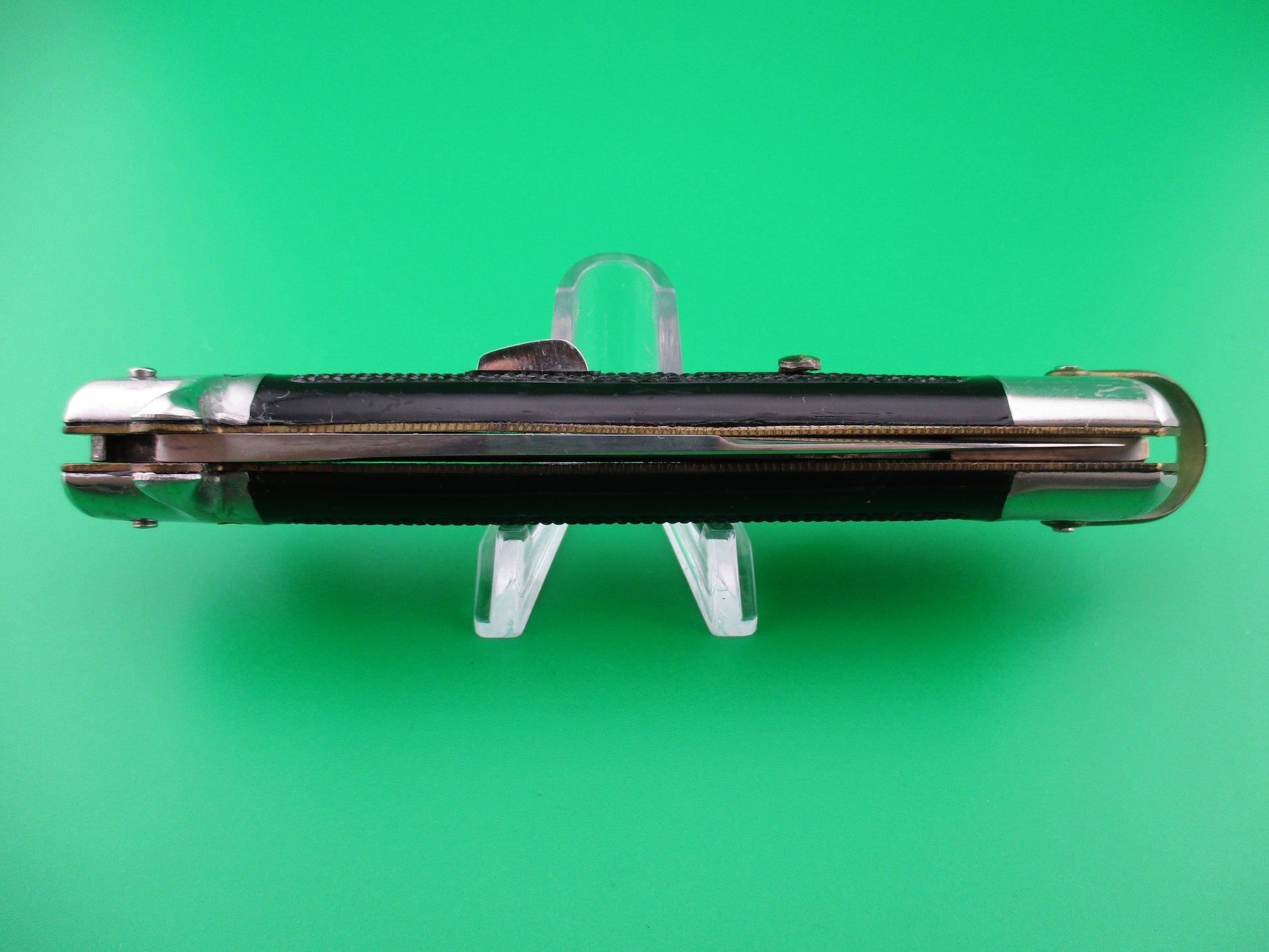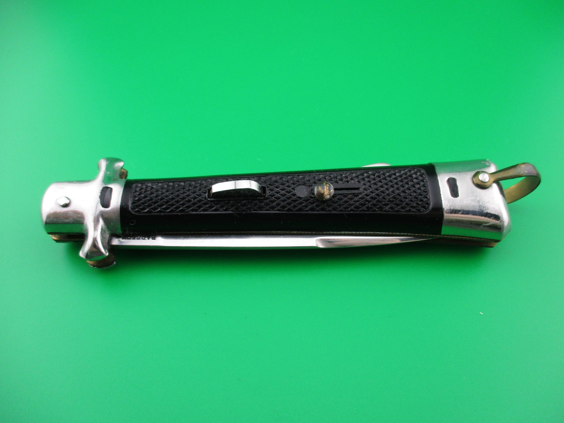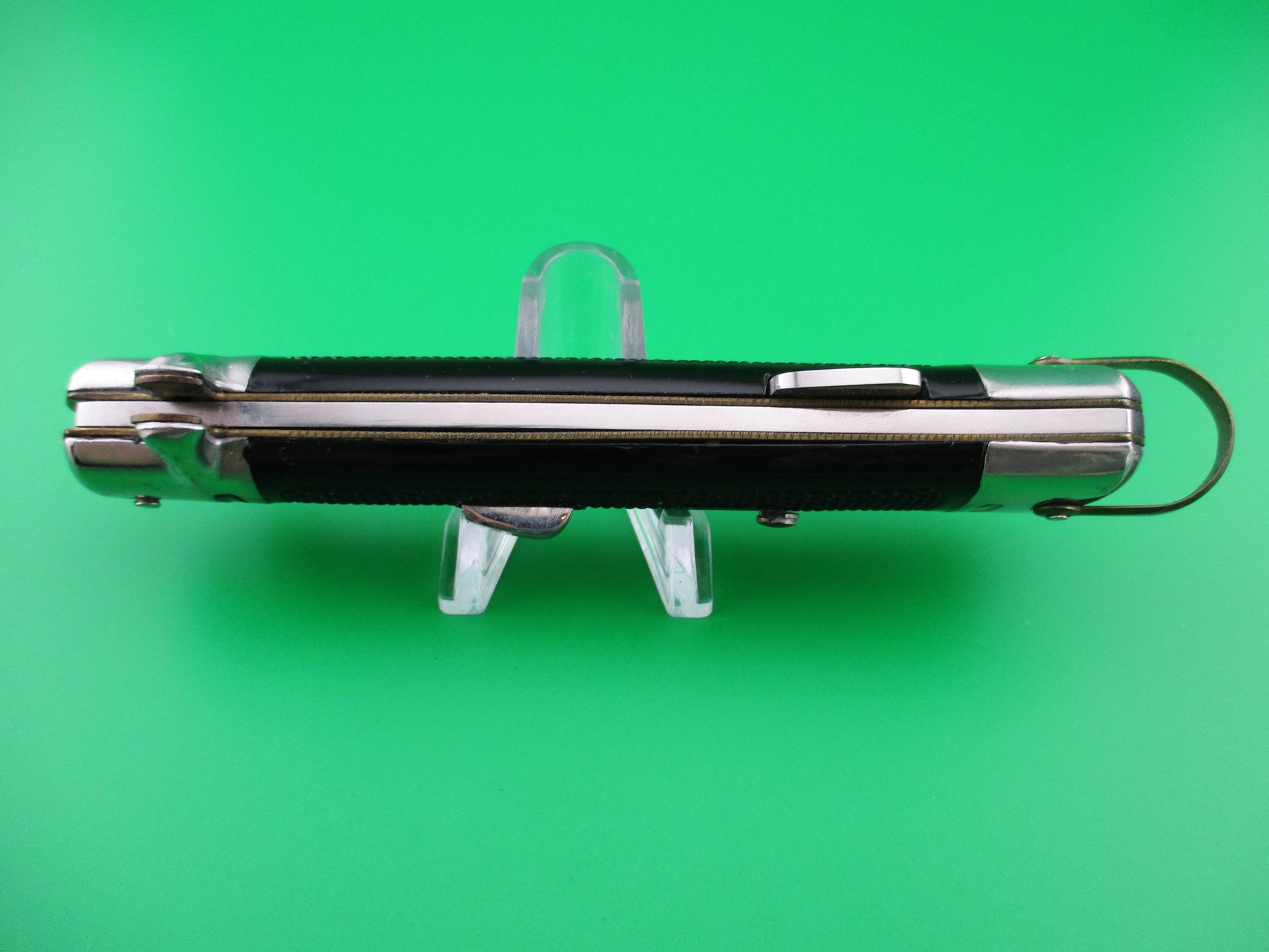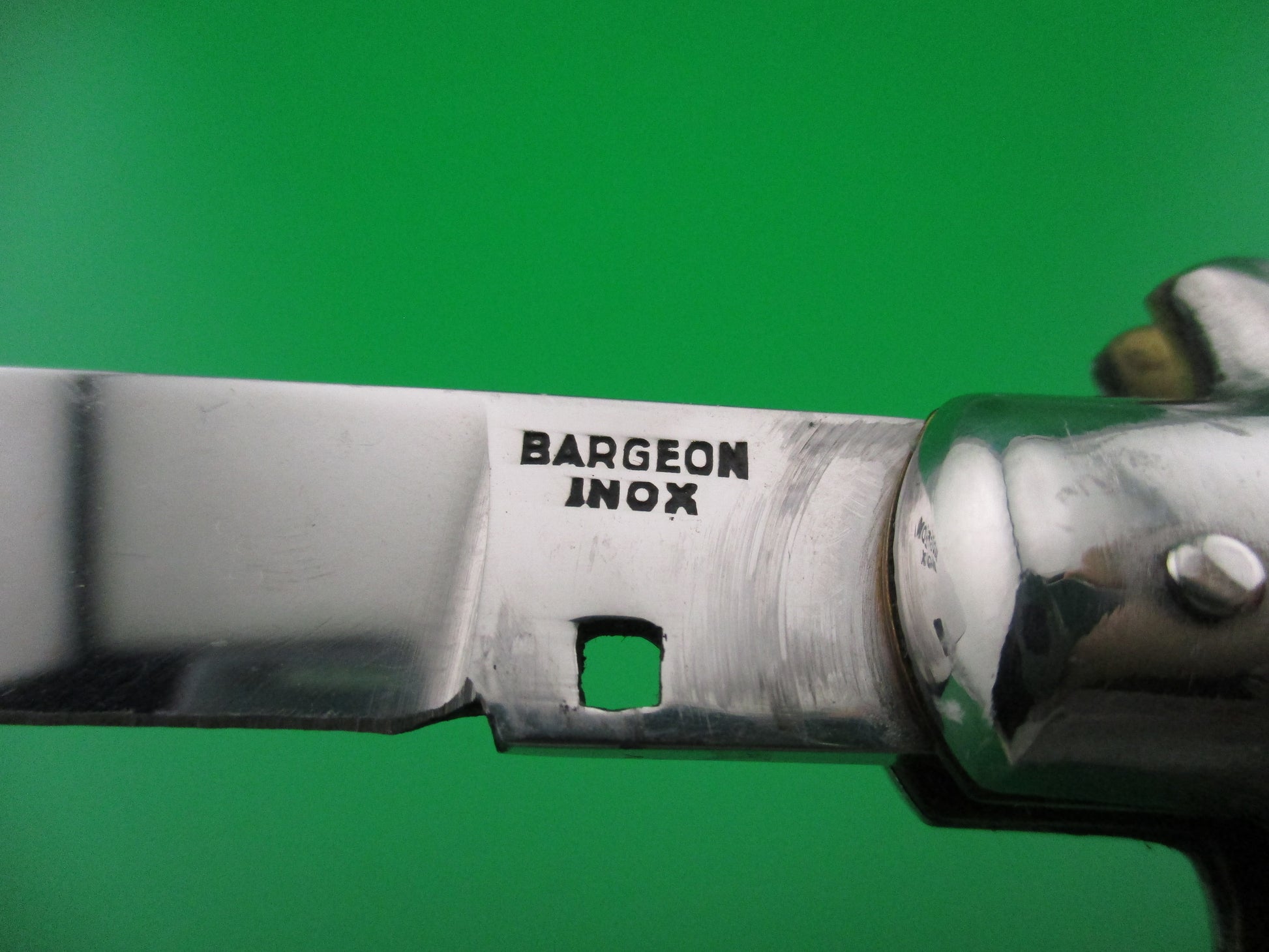 Nice French Bargeon automatic knife with finger guards on the bolsters. The knife is marked BARGEON INOX and measures 23.6 cm (9.25 inches) open with coined brass liners. The flat grind swedge blade is full and shiny with all of the original factory finish. The black checkered plastic scales are in excellent condition with no shrinkage. The knife functions perfectly with the blade tip seating well below the liners, Strong snap and Tight lockup. Button open, backspring release to close. The safety works. Nice big old French Bargeon switchblade in near mint condition.
