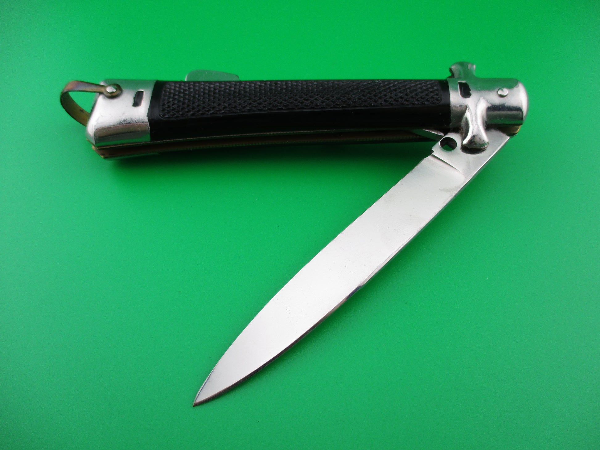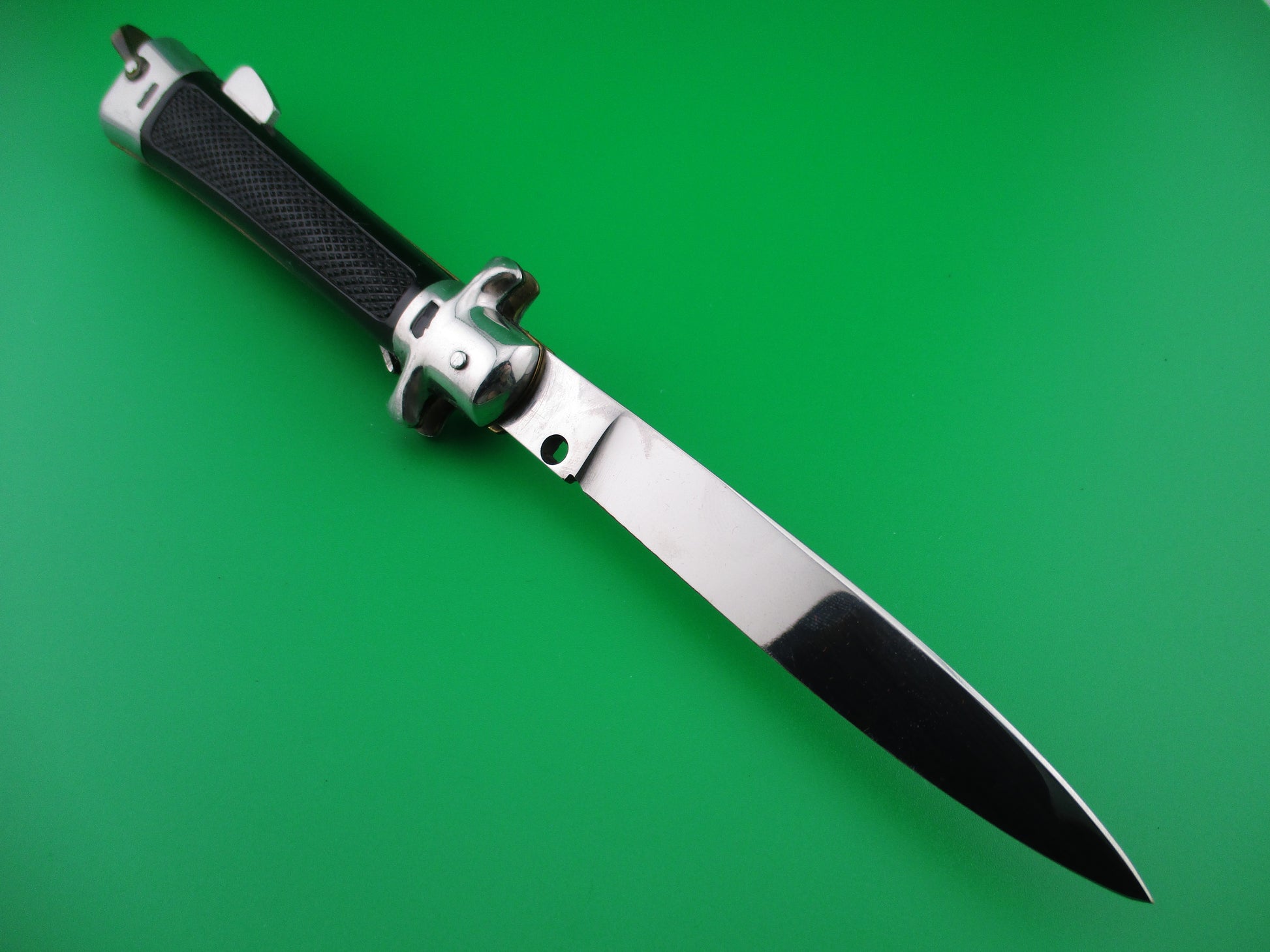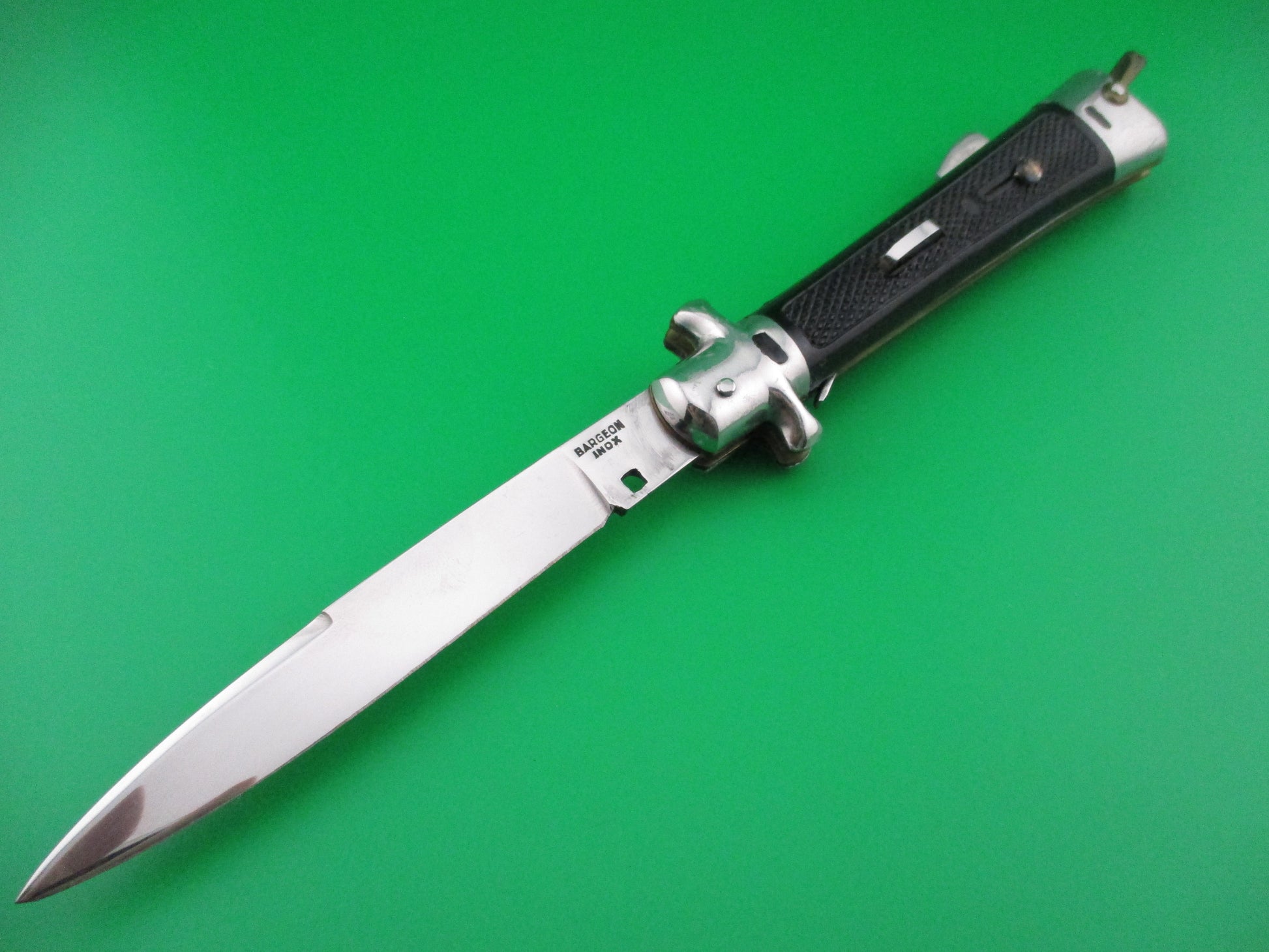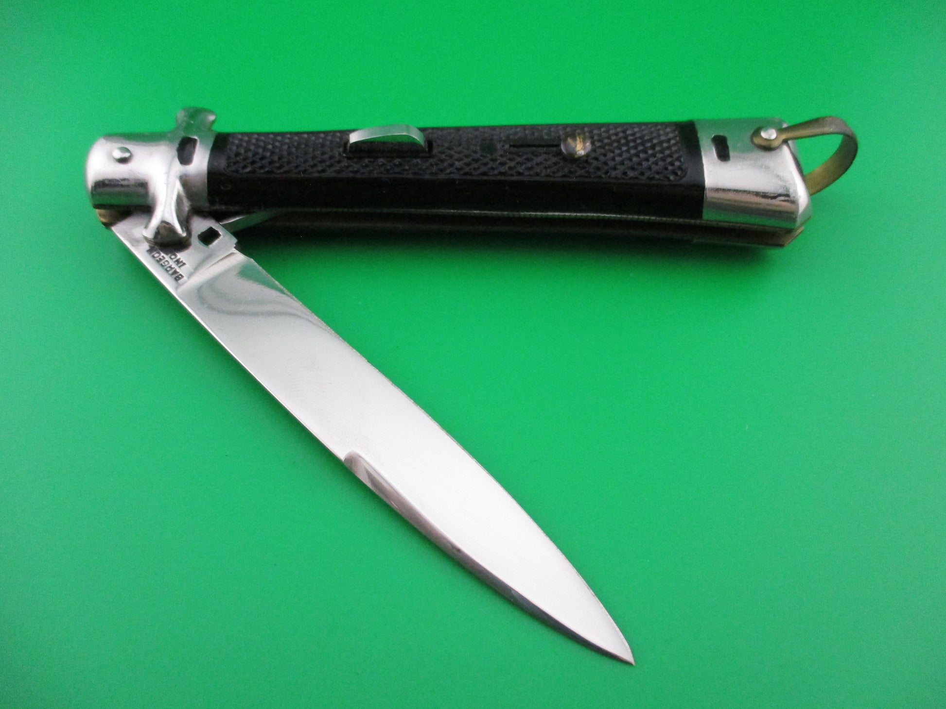 Nice French Bargeon automatic knife with finger guards on the bolsters. The knife is marked BARGEON INOX and measures 23.6 cm (9.25 inches) open with coined brass liners. The flat grind swedge blade is full and shiny with all of the original factory finish. The black checkered plastic scales are in excellent condition with no shrinkage. The knife functions perfectly with the blade tip seating well below the liners, Strong snap and Tight lockup. Button open, backspring release to close. The safety works. Nice big old French Bargeon switchblade in near mint condition.