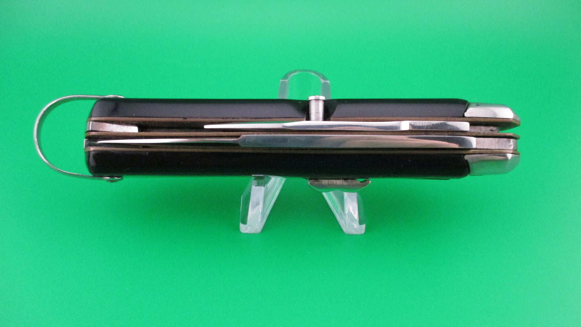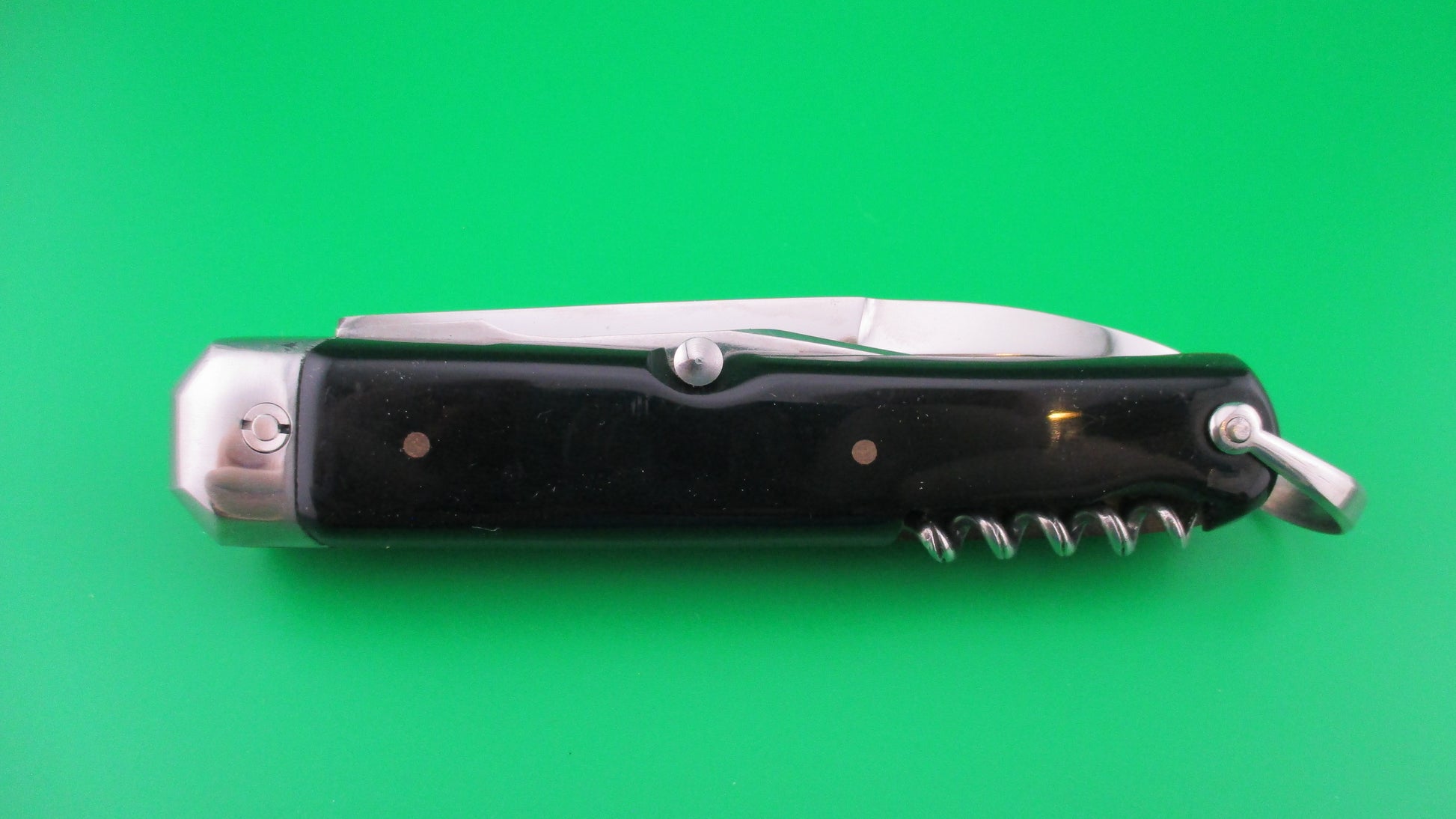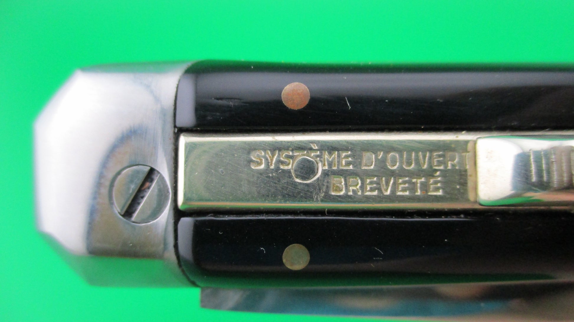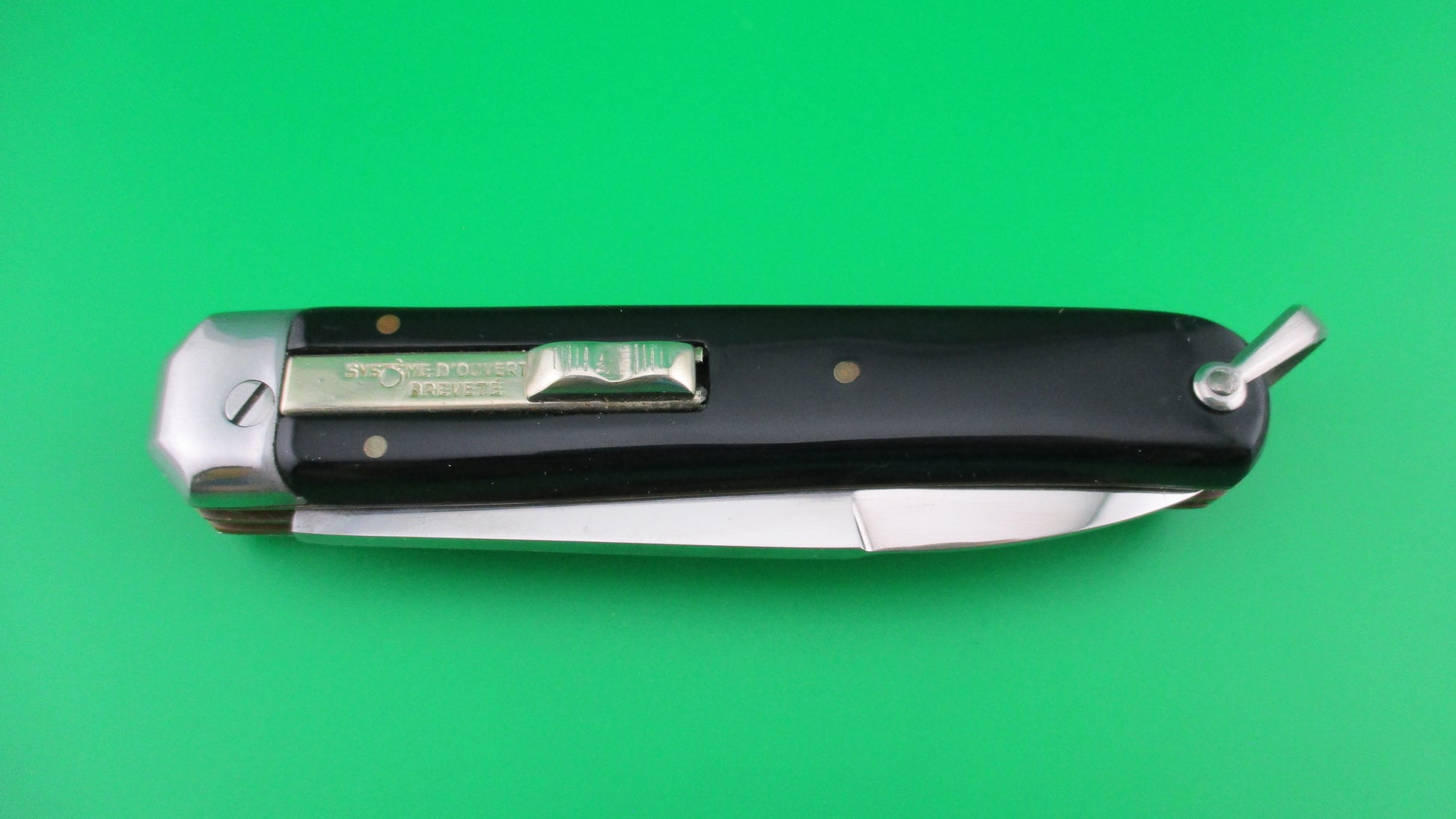 Vintage BEGON INOX SYSTEME D'OUVERT BREVETE 21cm French 3 bladed Camper Black switchblade knife in original box! The beautiful French camper measures 20.6cm (8.25 inches) open with brass liners, steel bolsters and lanyard ring and nickel silver button and rocker arm. The main bayonet style blade is 100% full with original factory finish as is the multi function bottle opener blade and corkscrew. The Black synthetic scales are in very nice condition. The main blade functions like new with blade tip deep in the well, strong snap and TIGHT lockup open. The manual blades open like new also. The button slides down a bit which acts as a safety by catching on the scale when button slid down, so safety works fine. Like New condition!